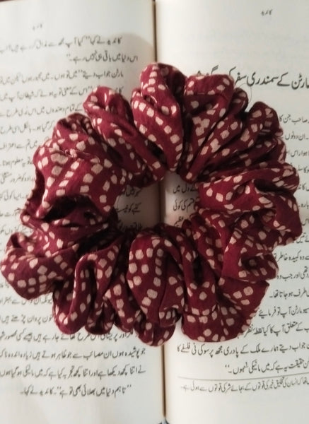 Ajrak Chunri Maroon Scrunchie – Handcrafted Hair Accessory