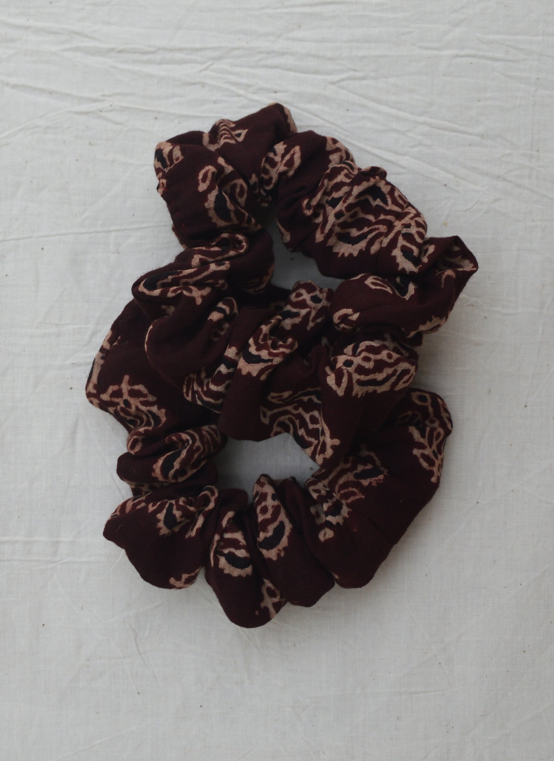 Crafted from soft, breathable cotton fabric, each scrunchie features delicate floral Ajrak motifs in a rich maroon tone, making them ideal for daily wear as well as coordinated styling with Ajrak outfits. Gentle on hair and comfortable to wear, these scrunchies help prevent breakage while adding a refined cultural accent to your look.