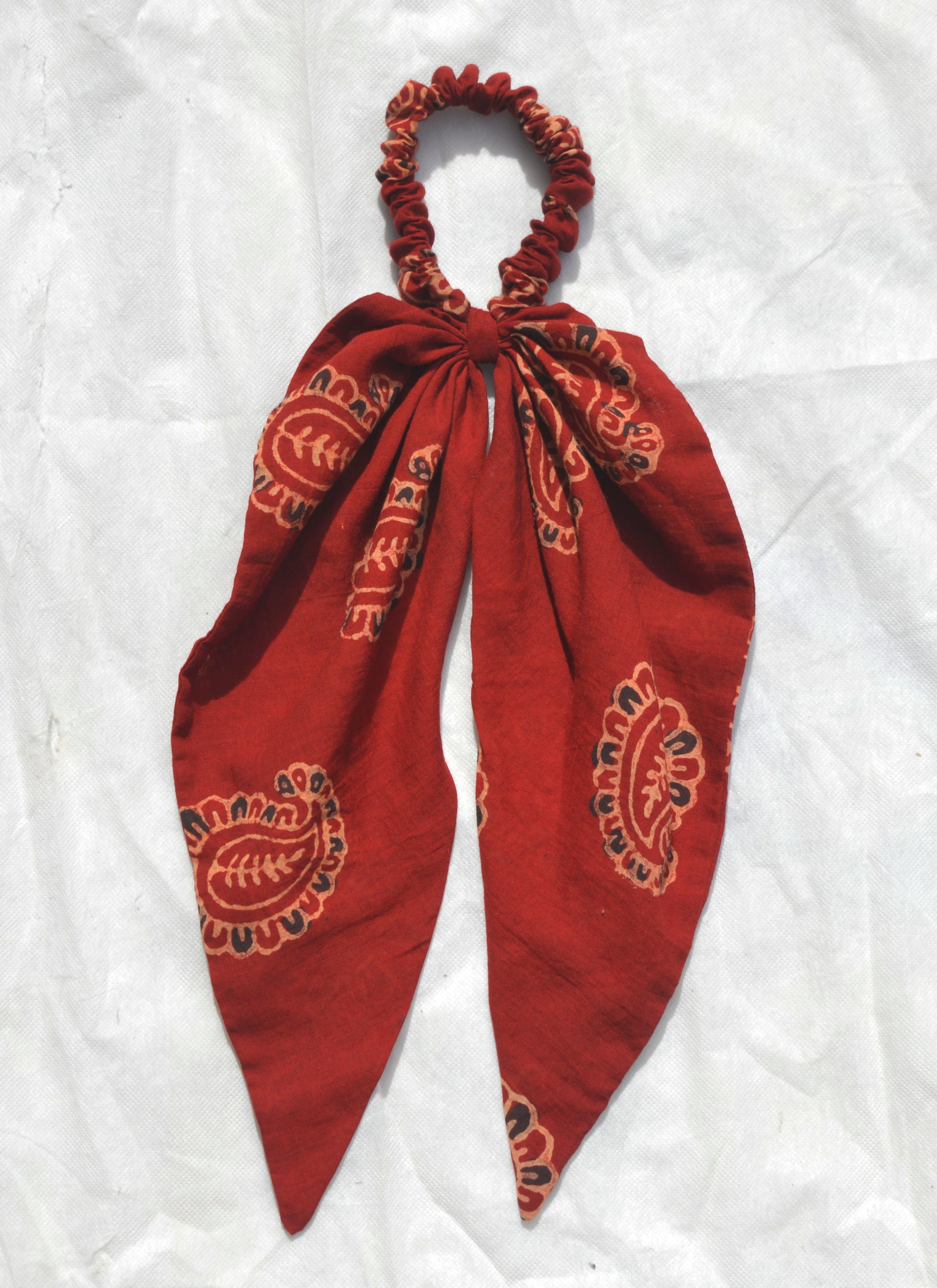 Elevate your hairstyle with this Ajrak Scarf Scrunchie in Anbi Red, handcrafted from authentic cotton Ajrak fabric dyed with natural, eco-friendly colors. Designed with an attached scarf tail, it can be styled in a ponytail, braid, or worn around the wrist for a chic cultural touch. Soft, durable, and sustainable, this scrunchie celebrates Sindhi heritage while adding a bold pop of Anbi Red elegance to your look.
