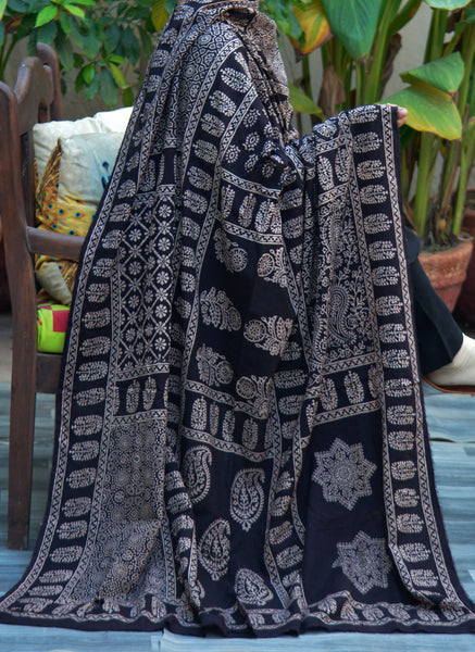 This Organic Dye Hand Block Printed Ajrak Black Chaadar is a stunning blend of traditional craft and detailed embellishment. Adorned with intricate multi-block motifs using natural dyes, Crafted on soft, breathable fabric, it offers elegance, cultural richness, and festive charm, ideal for both everyday wear and special occasions.