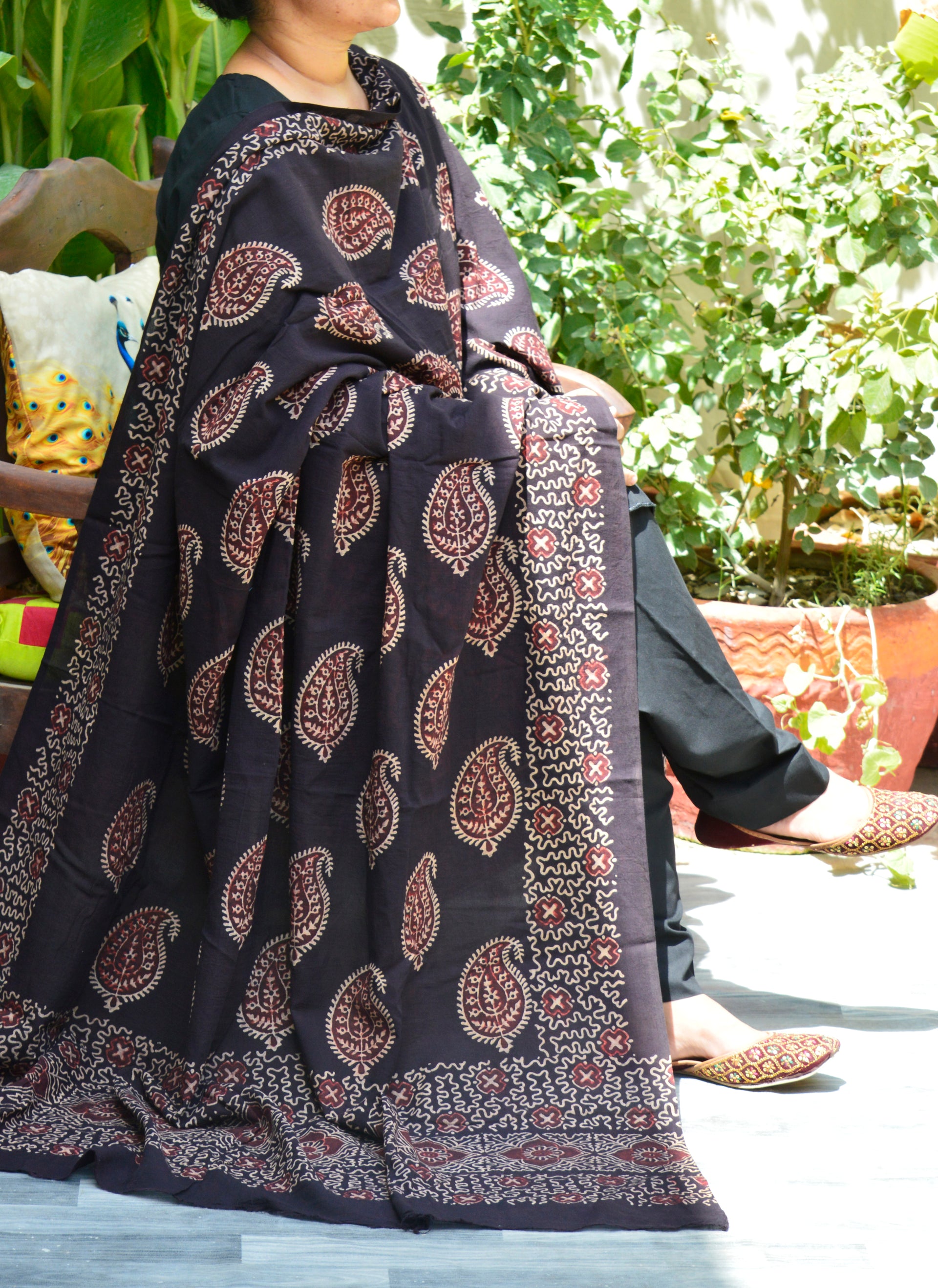 This rich black Ajrak chaadar is hand block printed using organic dyes, blending timeless Anbi Kakkar motifs with sustainable craftsmanship. Made from soft lawn cotton, it's lightweight, breathable, and perfect for cultural or everyday wear.