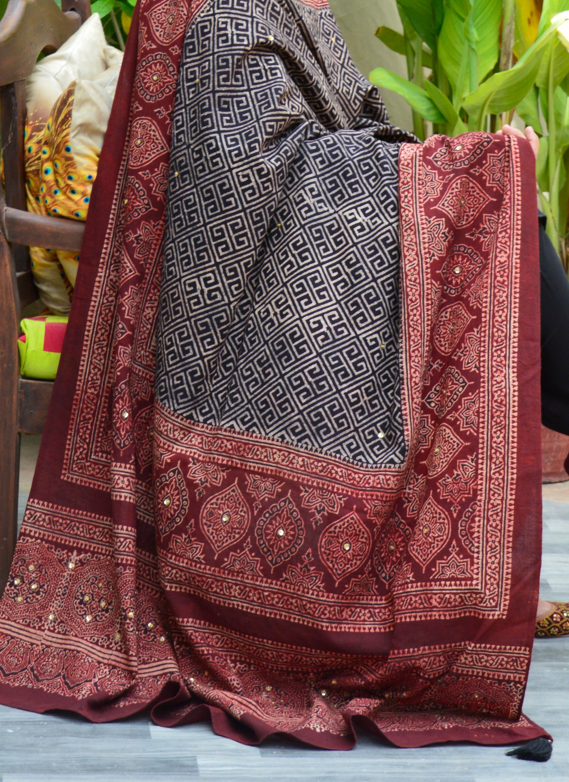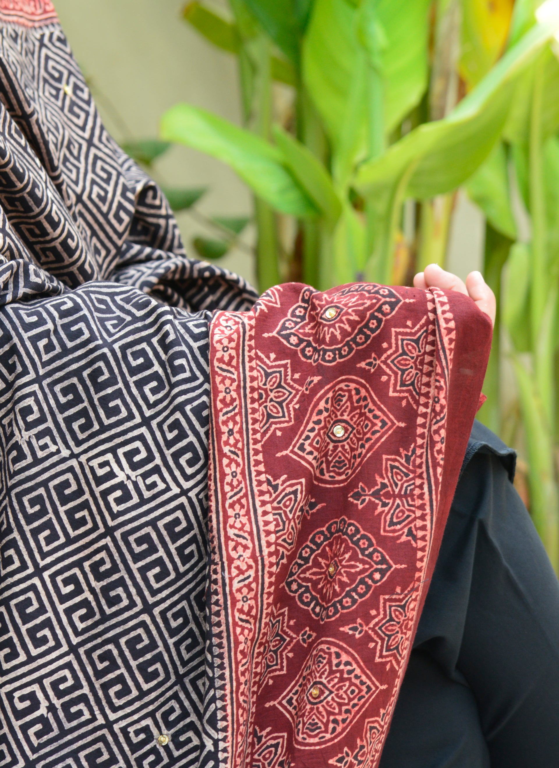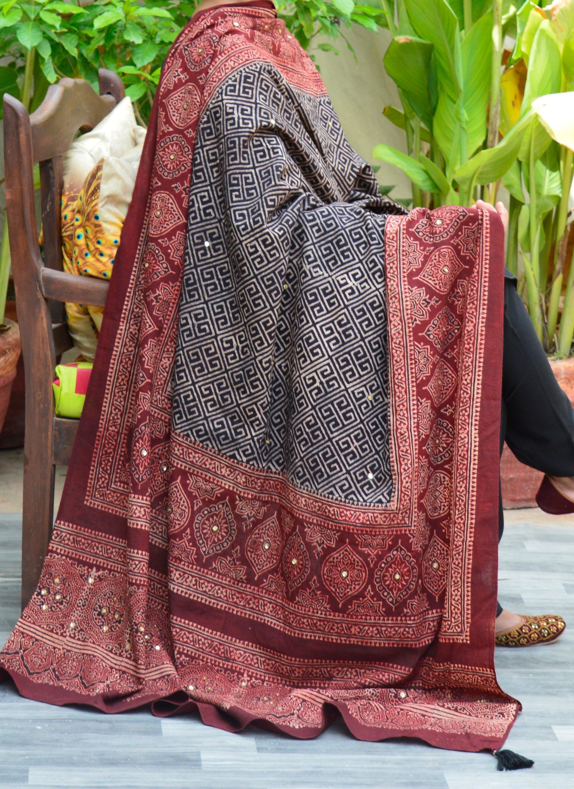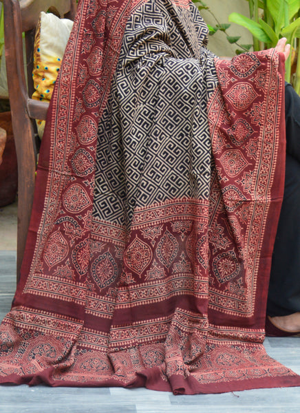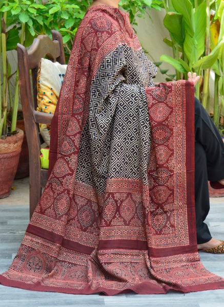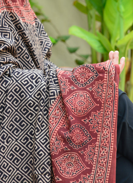 Elevate your wardrobe with the Organic Dye Hand Block Printed Ajrak Chaadar Taskeen, a stunning blend of tradition, elegance, and sustainability. Make it yours today and celebrate the art of Ajrak printing!