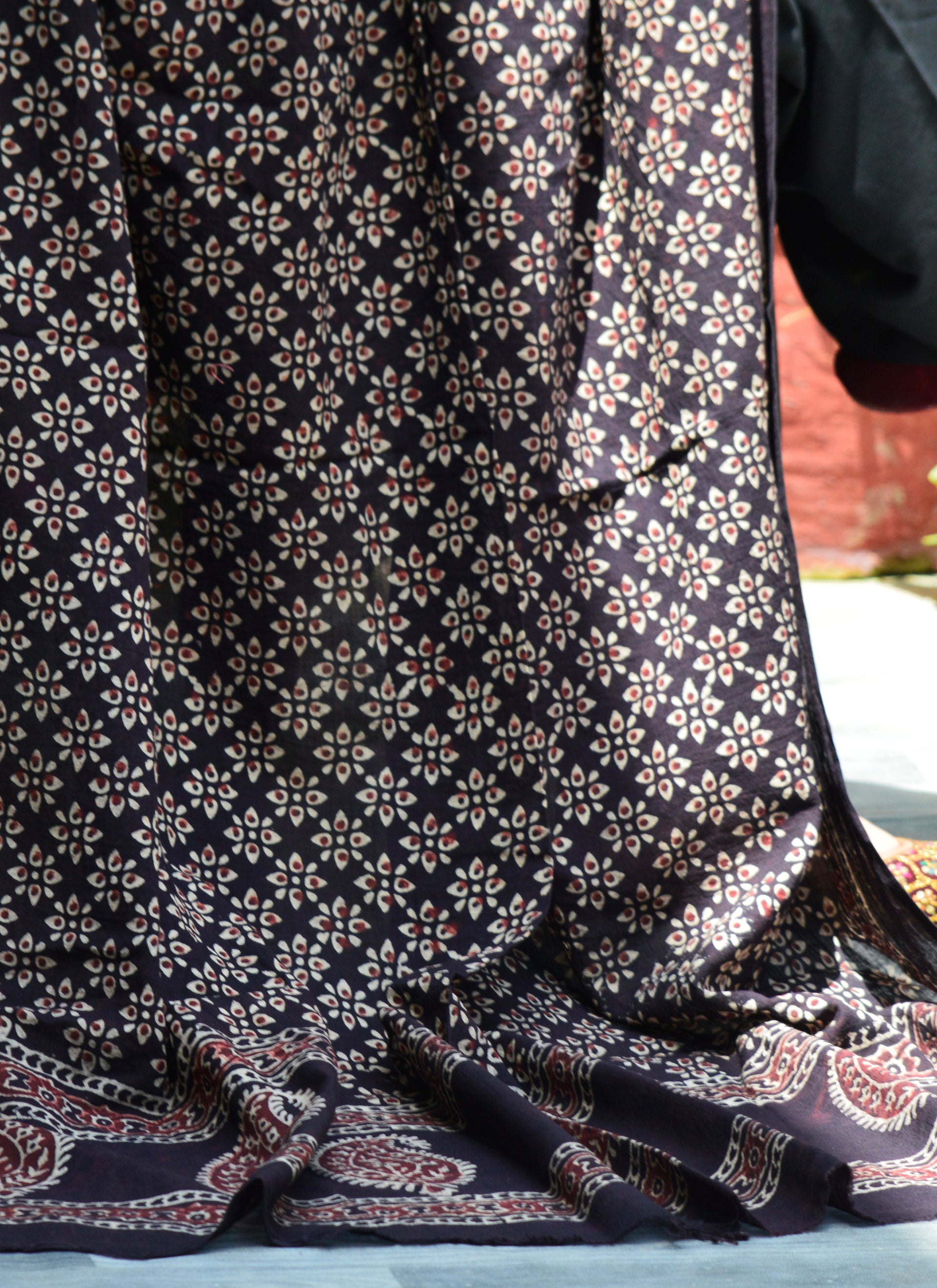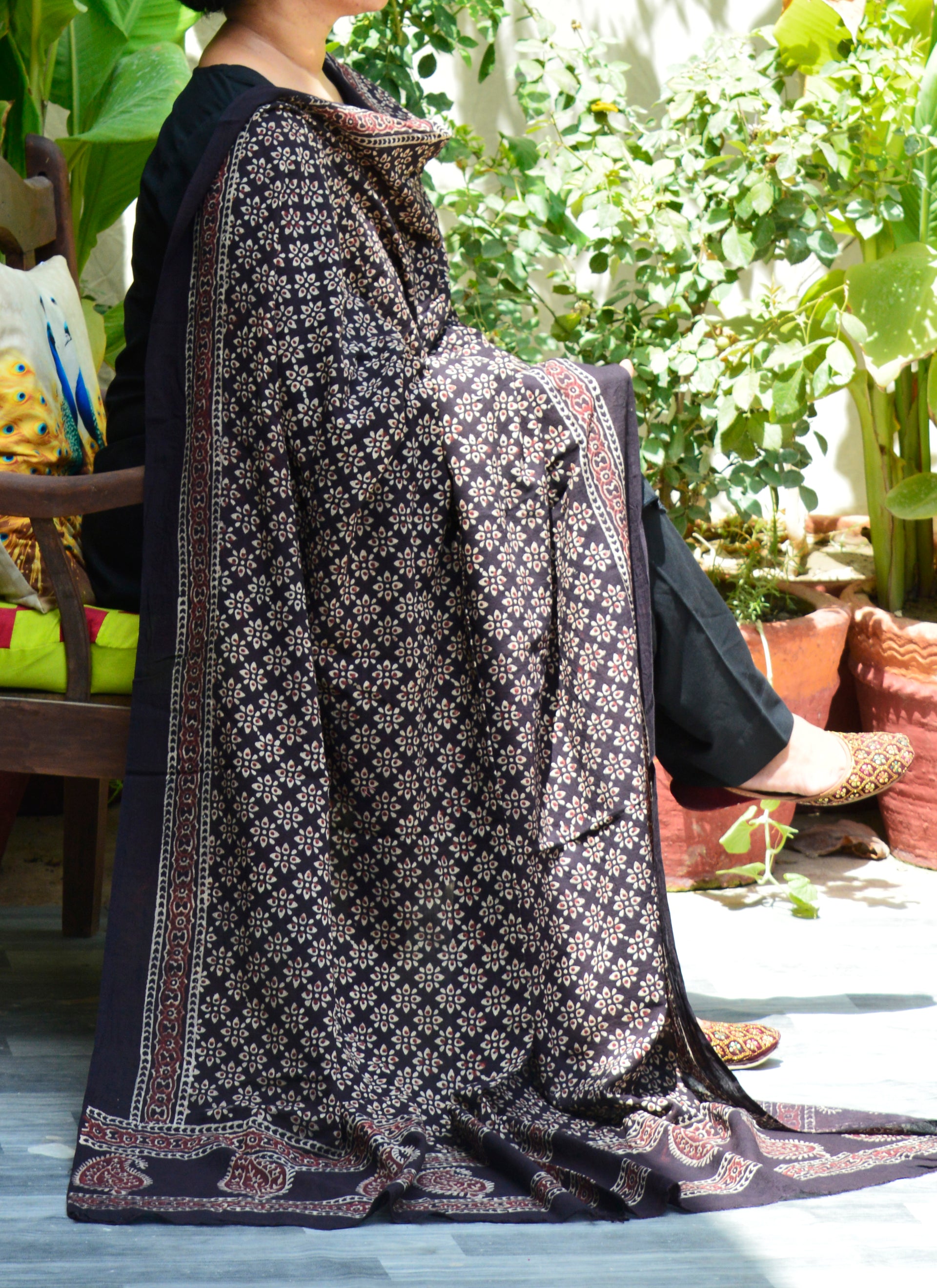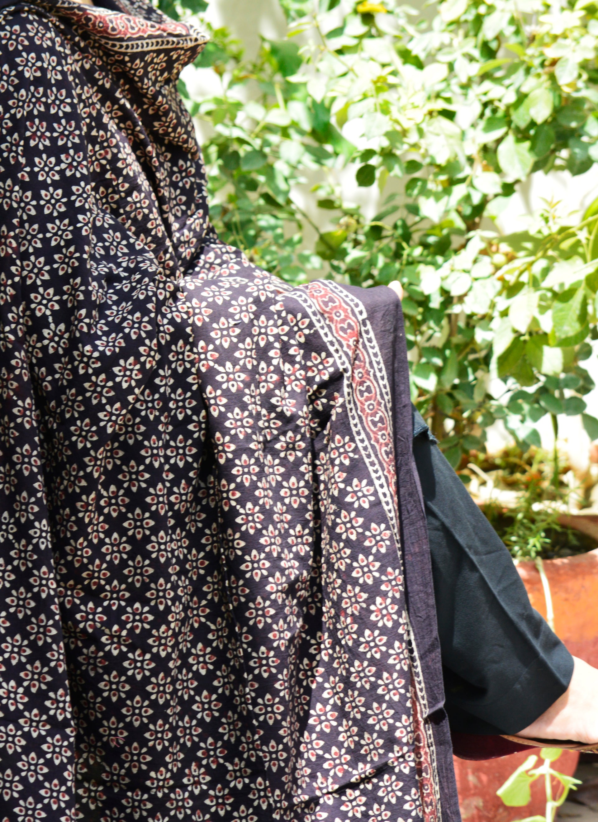 Discover the Perfect Fusion of Tradition and Contemporary Fashion with Our Organic Dye Hand Block Printed Ajrak Black Odhni Floral