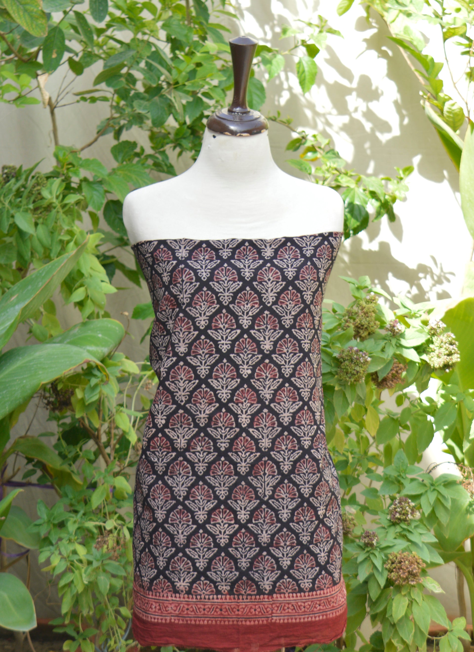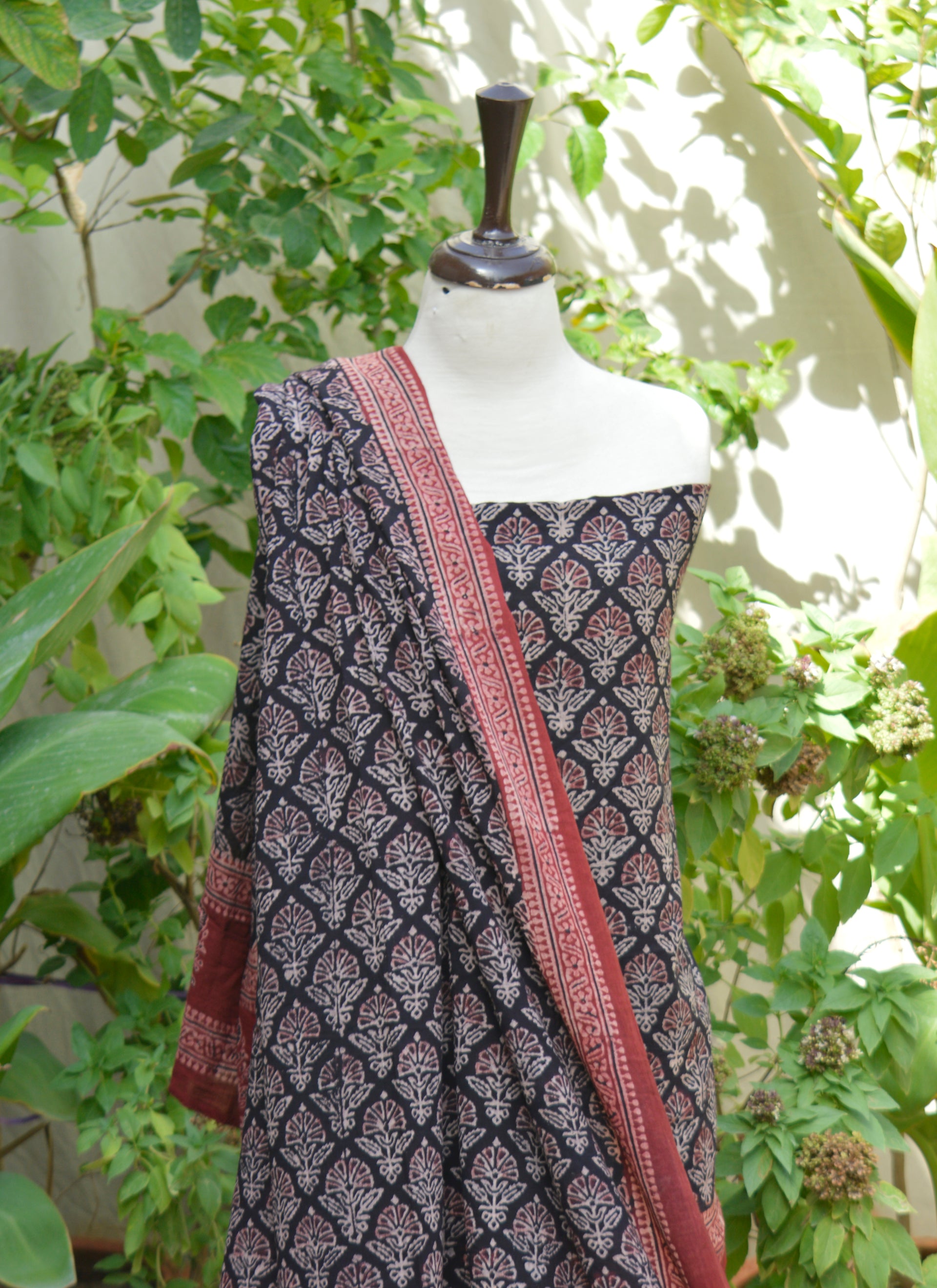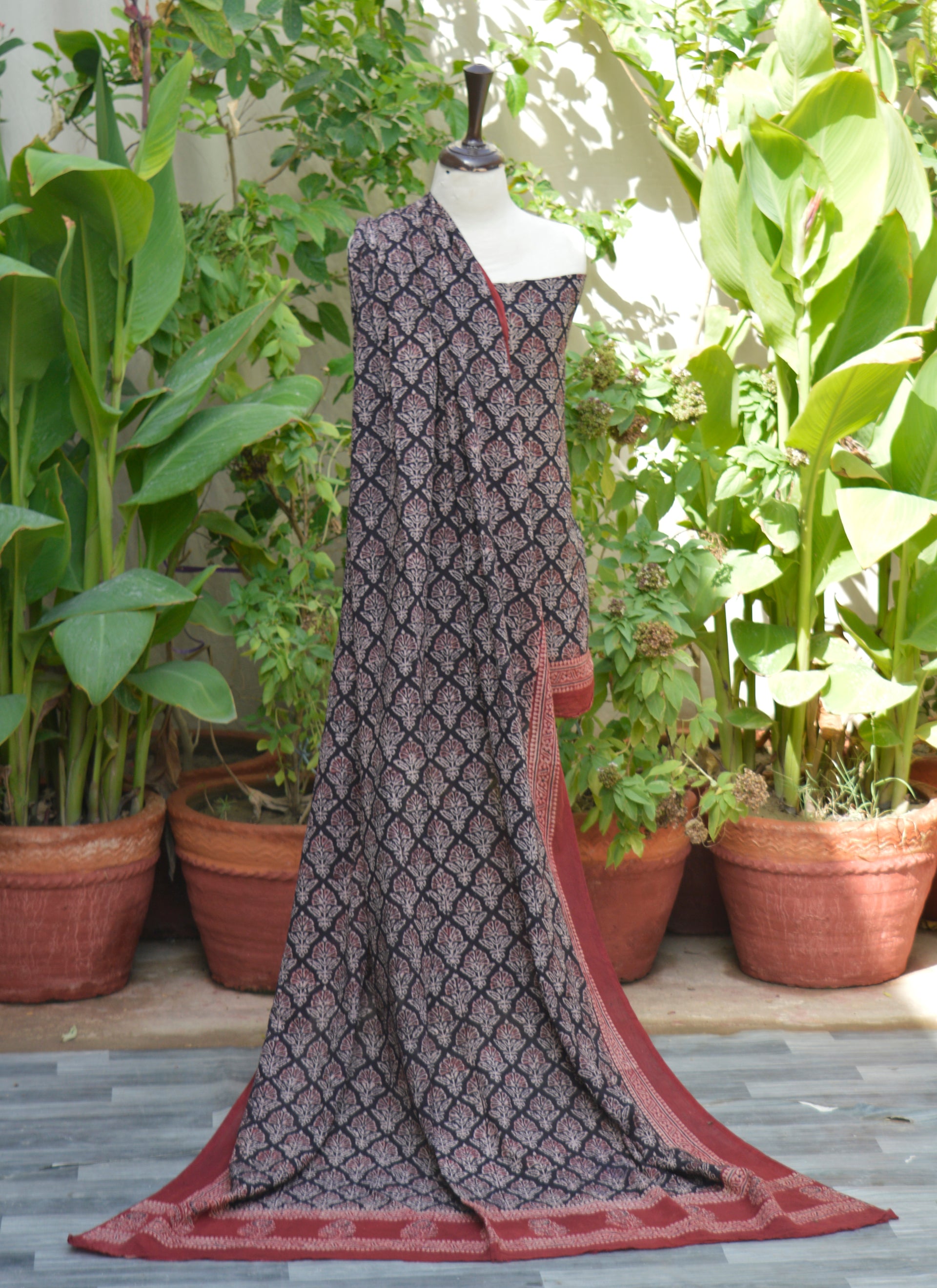 Step into a perfect blend of tradition and modern fashion with our Organic Dye Hand Block Printed Ajrak Floral Butta Un-Stitched Two-Piece (Shirt and Dupatta). Skilled artisans handcrafted this unique set, celebrating the timeless art of Ajrak printing while adding a fresh, contemporary twist.