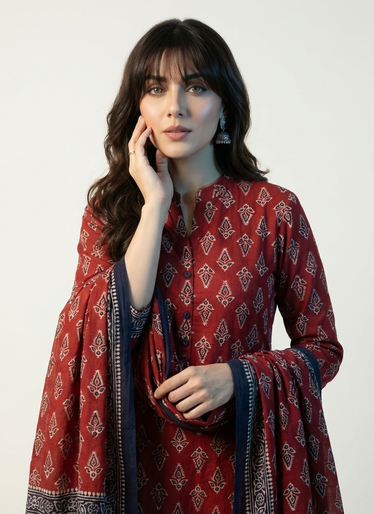This Ajrak Design Dress Floral Butti Two-Piece is crafted using authentic Sindhi Ajrak hand block printing and organic, natural dyes. The unstitched set is available in two fabric options separately—100% Cotton or Premium Lawn—allowing you...