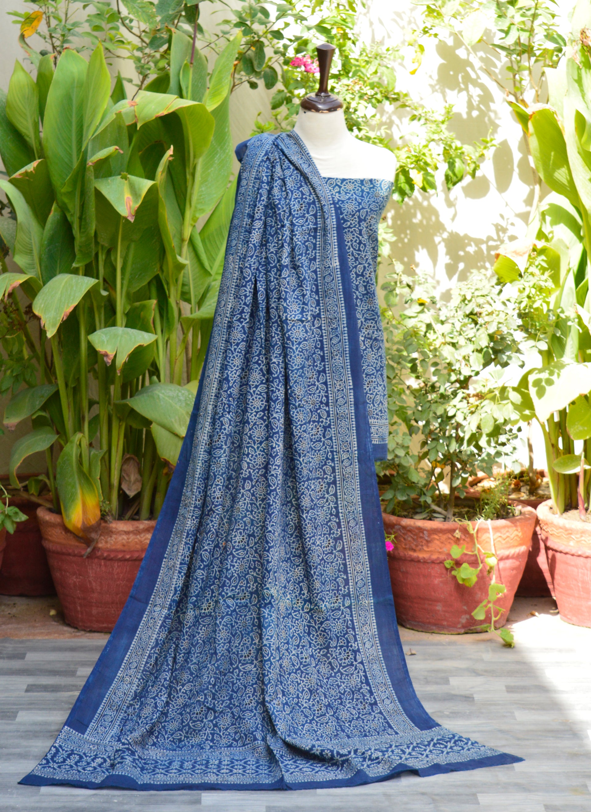 Experience the perfect fusion of tradition and contemporary fashion with our Organic Dye Hand Block Printed Ajrak Indigo Floral Bel UnStitch Two-Piece Dress. Handcrafted by skilled artisans, this piece celebrates the rich heritage of Ajrak printing, combining timeless elegance with modern design.