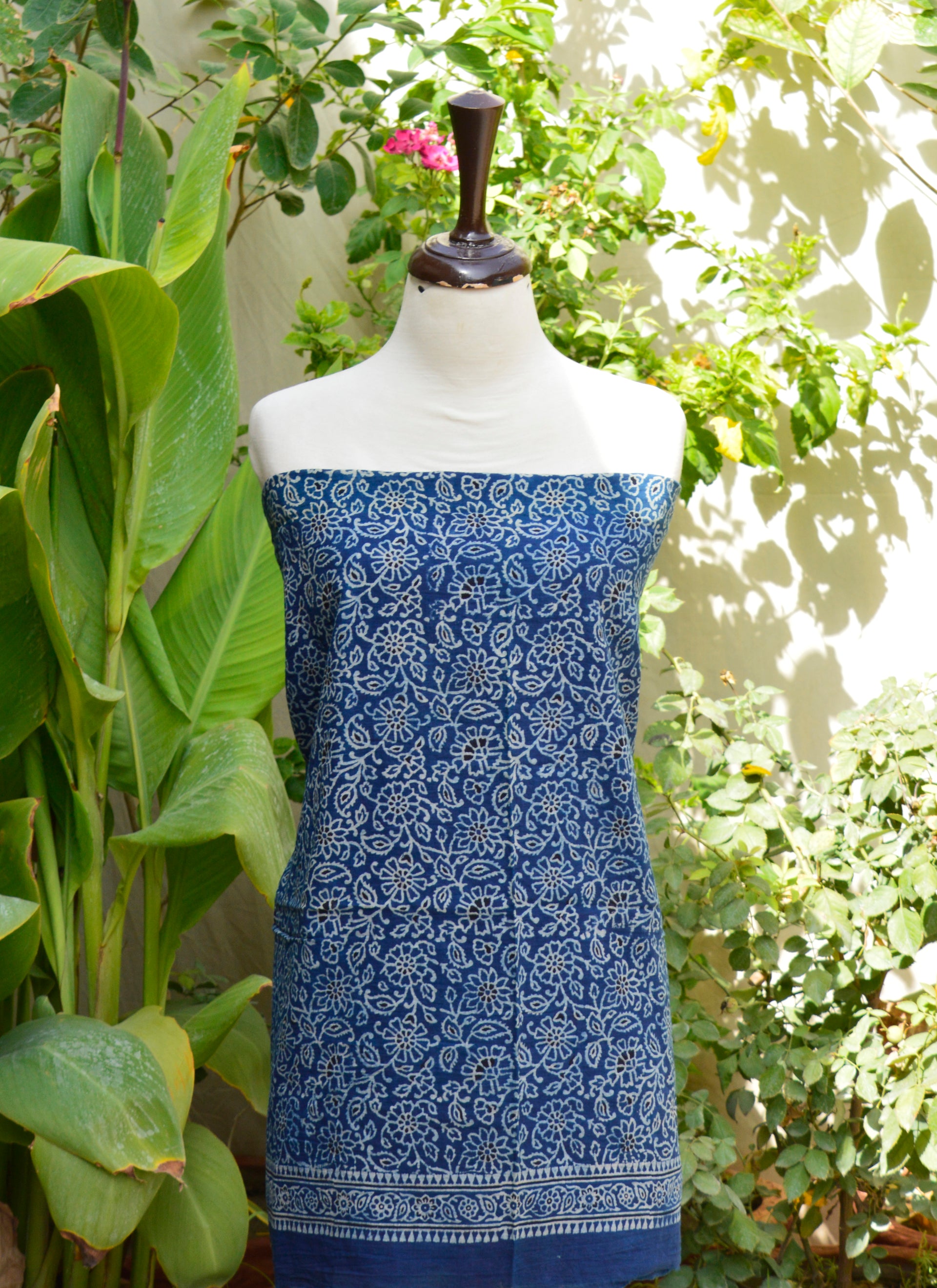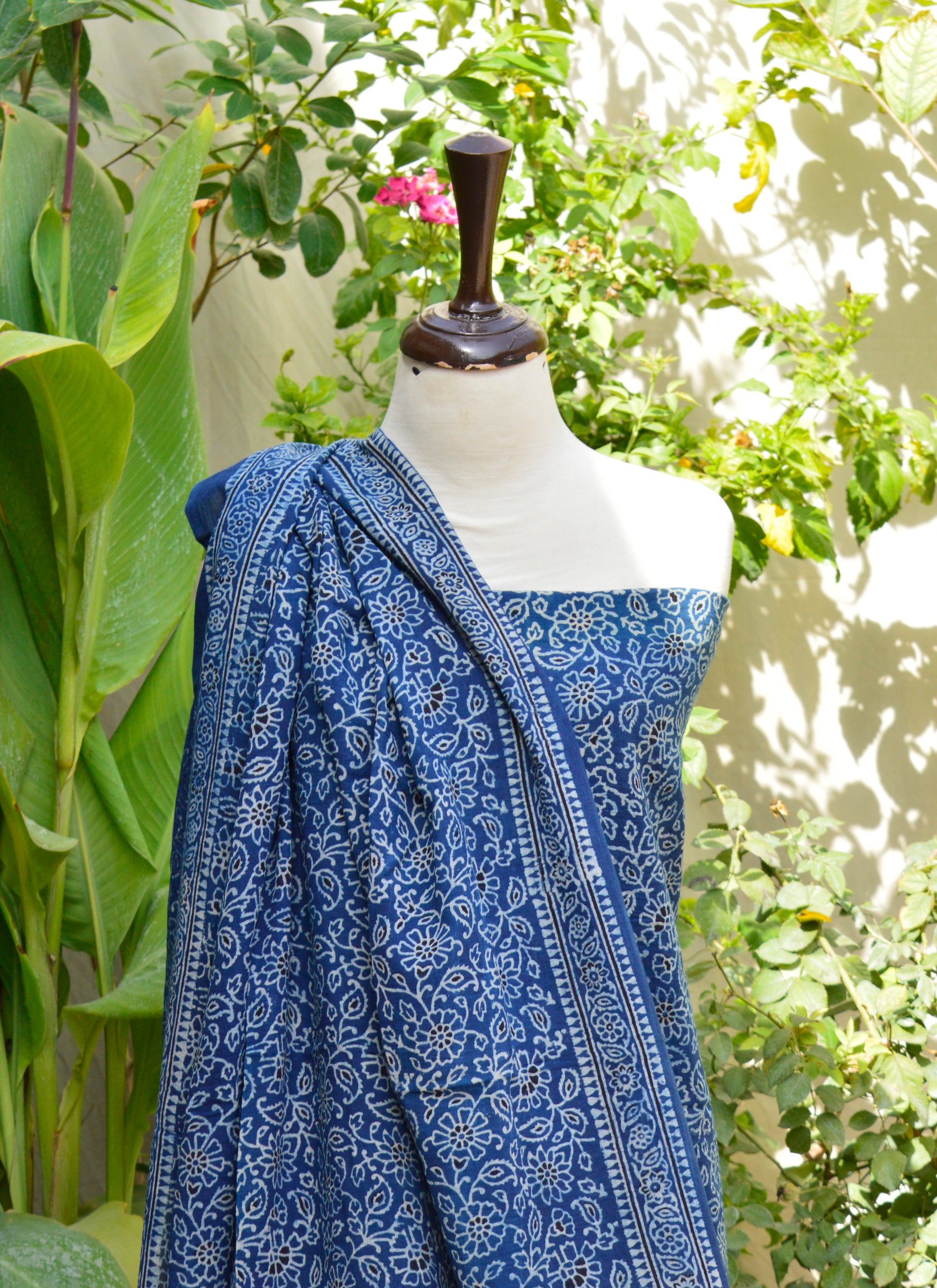 Embrace the elegance of tradition and sustainability with our Organic Dye Hand Block Printed Ajrak Indigo Floral Bel, a beautiful blend of culture and modern fashion.
