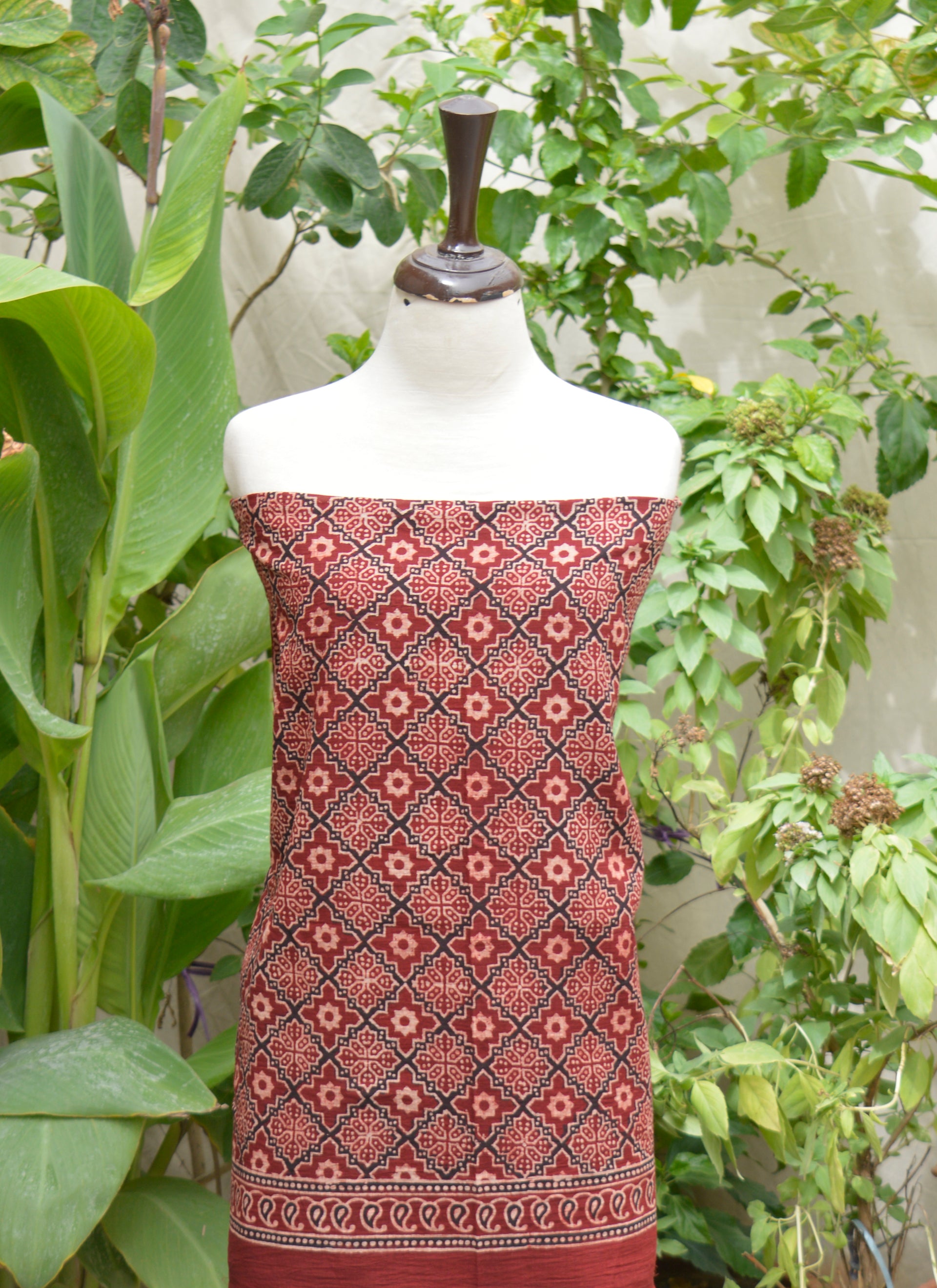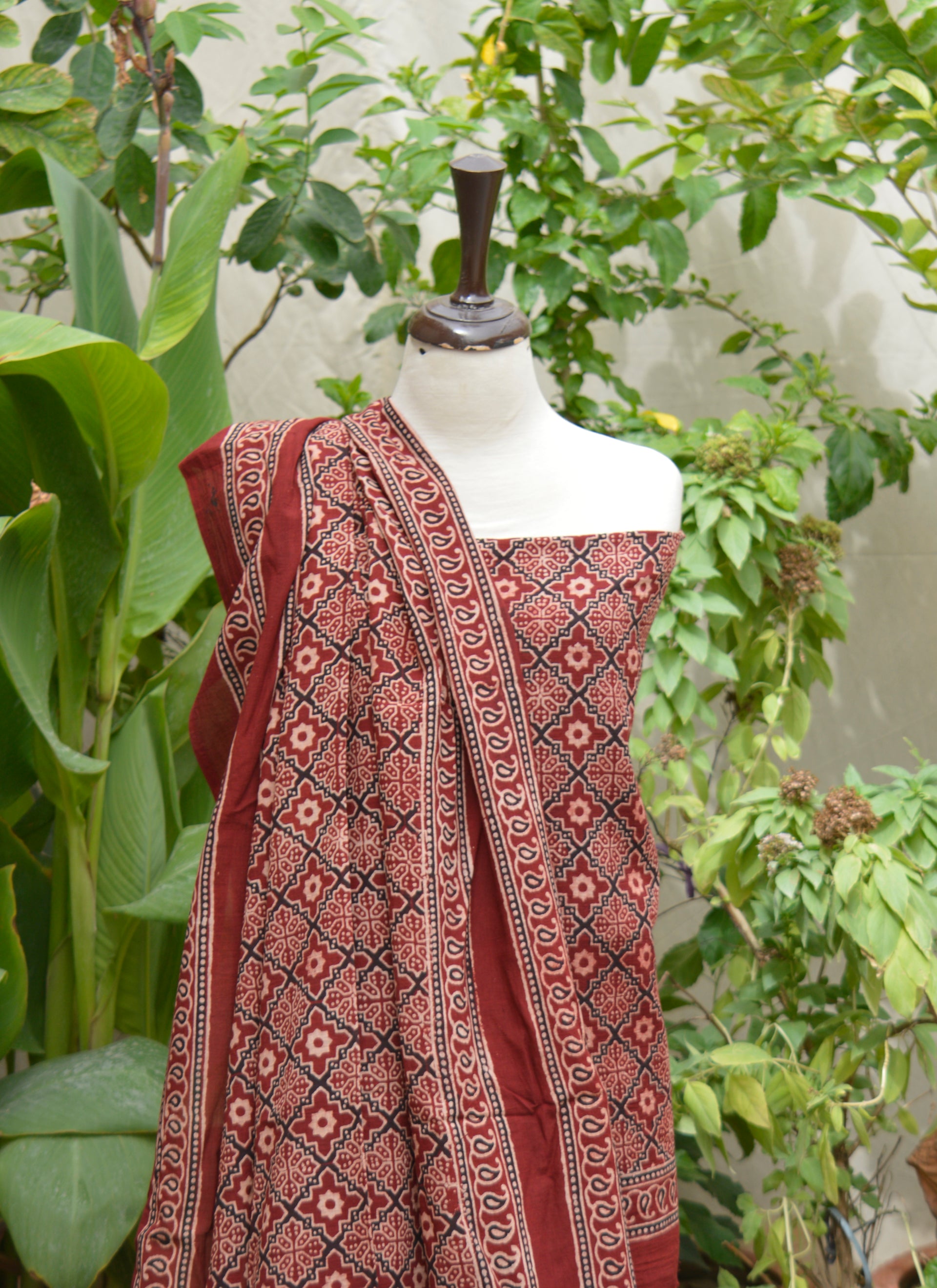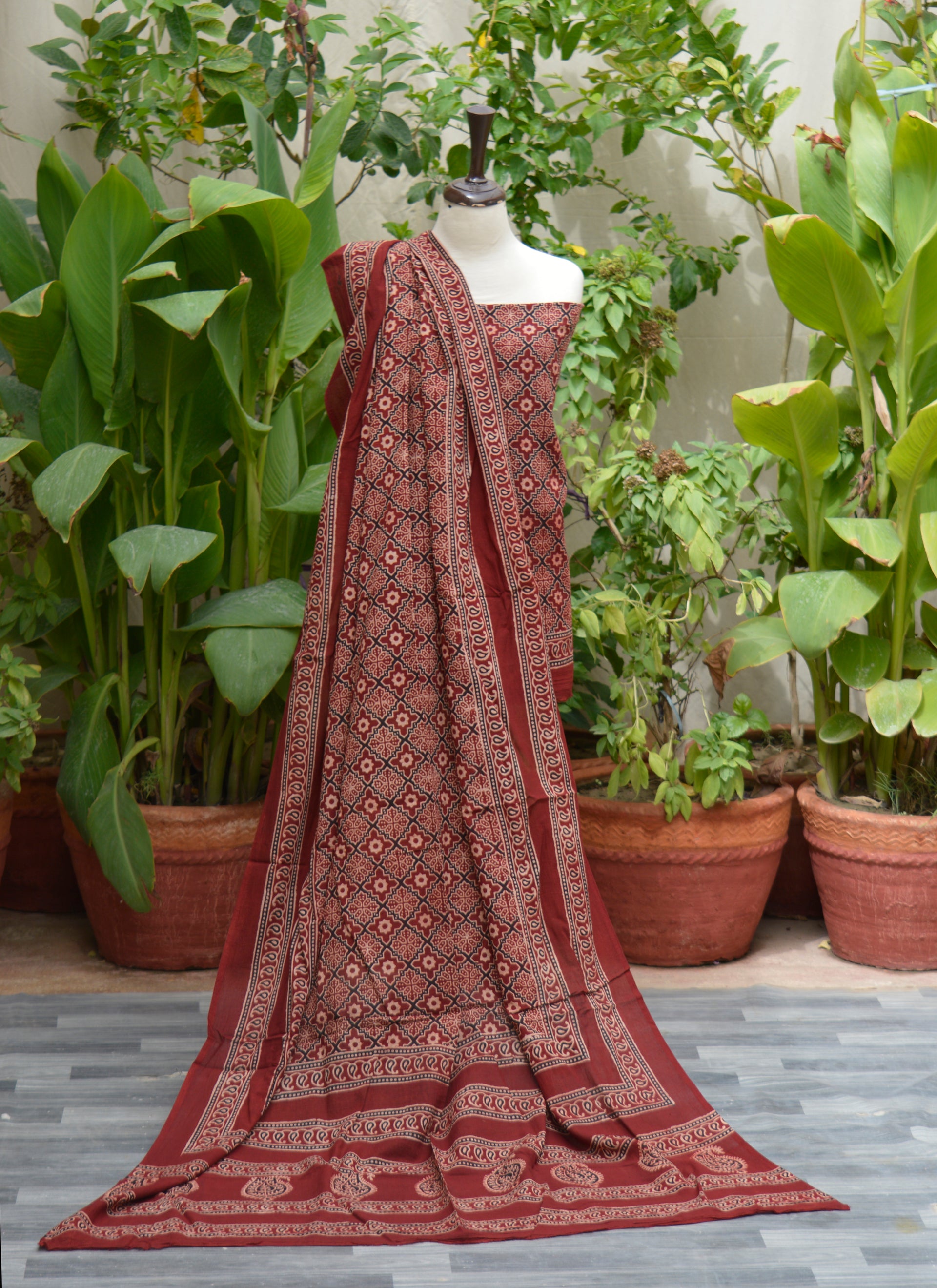 Elevate your wardrobe with the Ajrak Kashigar Organic Dye Unstitched Two-Piece Set, crafted in soft, breathable lawn fabric. Featuring a hand block printed shirt and dupatta in rich traditional Sindhi motifs, this set reflects timeless craftsmanship and sustainable fashion. The organic dyes preserve heritage while being gentle on your skin. A true example of cultural grace, this Ajrak Design Dress is ideal for daily elegance or festive wear.