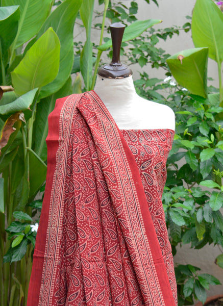 Elevate your wardrobe with our Organic Dye Hand Block Printed Ajrak Kerry Sharp Maroonish Red Un-Stitched Two-Piece. Embrace the perfect blend of tradition, style, and sustainability.