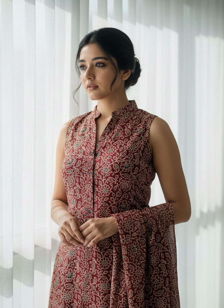 Ajrak Design Dress Red Floral Bel – Organic Dye Hand Block Printed Two-Piece (Cotton / Lawn)