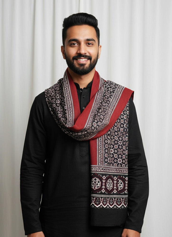 Its Single Paat size (approximately 92" × 34") offers graceful draping for men seeking authentic Sindhi Ajrak elegance. As each shawl is handcrafted, slight variations in color and pattern reflect the uniqueness of genuine artisan work.