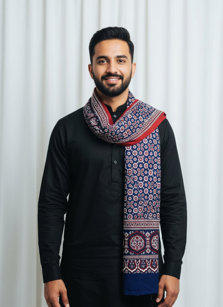 This Ajrak Design symbolizes timeless tradition and style, ideal for festivals, cultural gatherings, or everyday wear. Its natural dyeing process ensures both eco-friendliness and skin comfort, making it a truly sustainable choice.