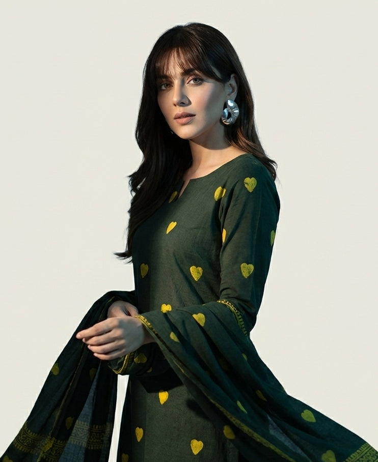 The Ajrak Design Dress Anahata Green Two-Piece is a refined expression of Sindhi Ajrak heritage, inspired by balance, harmony, and nature. Crafted using authentic Ajrak hand block printing techniques and organic, natural dyes, this unstitched ensemble reflects cultural depth with a contemporary color story in rich Anahata green tones.