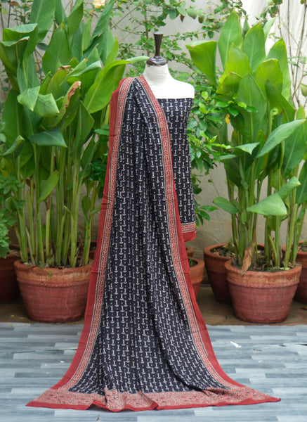 Experience the perfect blend of cultural heritage and modern elegance with our Organic Dye Hand Block Printed Ajrak Black Contrast Bone Two-Piece Set. Made from lightweight, breathable lawn fabric, this unstitched ensemble includes a beautifully designed shirt and matching dupatta, offering comfort and versatility for every season.