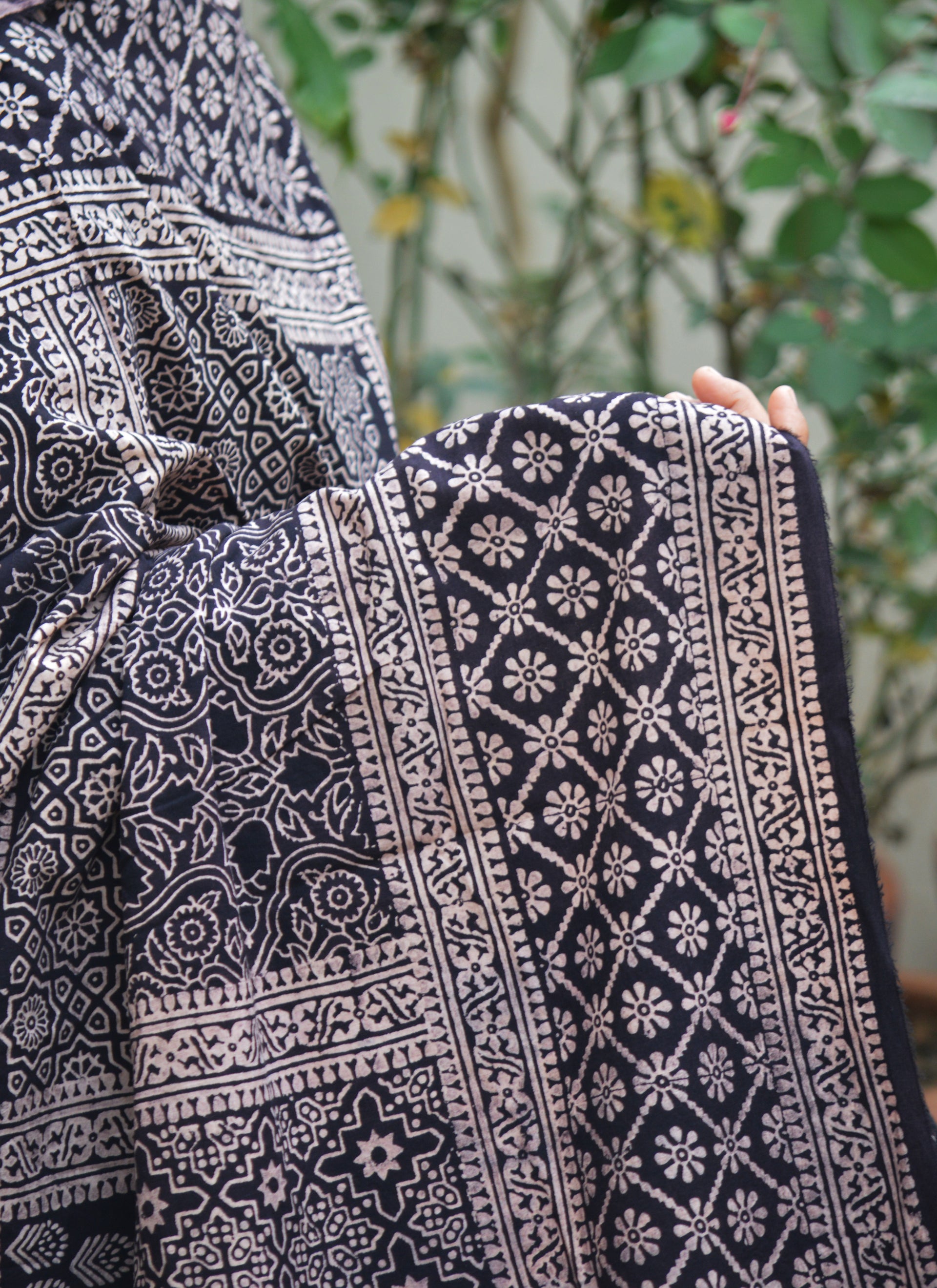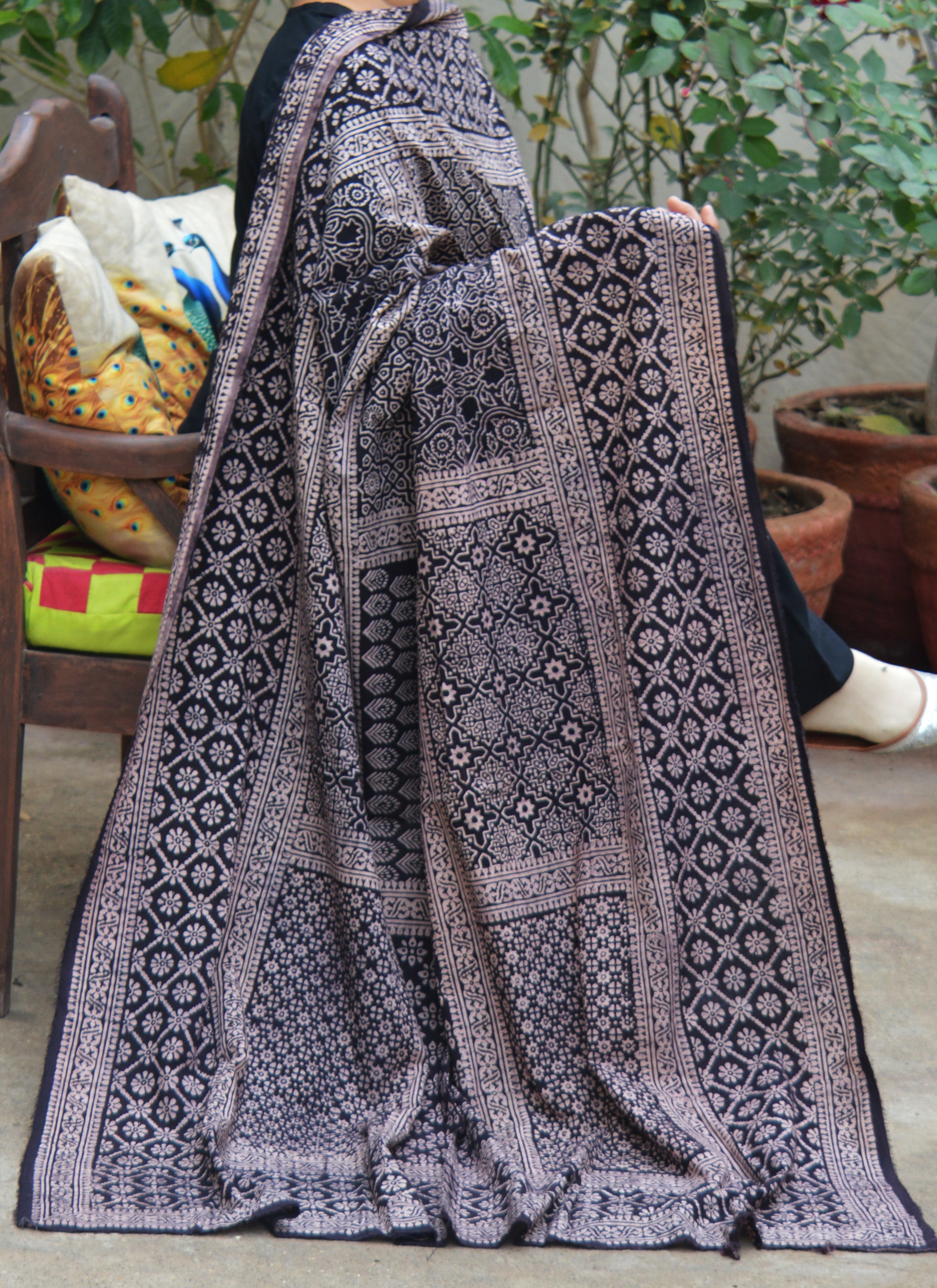 Minimal, powerful, and timeless, the Organic Dye Hand Block Printed Ajrak Chadar Multi Blocks Black is a refined expression of handcrafted elegance. Featuring classic multi-block Ajrak motifs in deep black, this chadar is designed for those who appreciate understated luxury and authentic textile artistry.