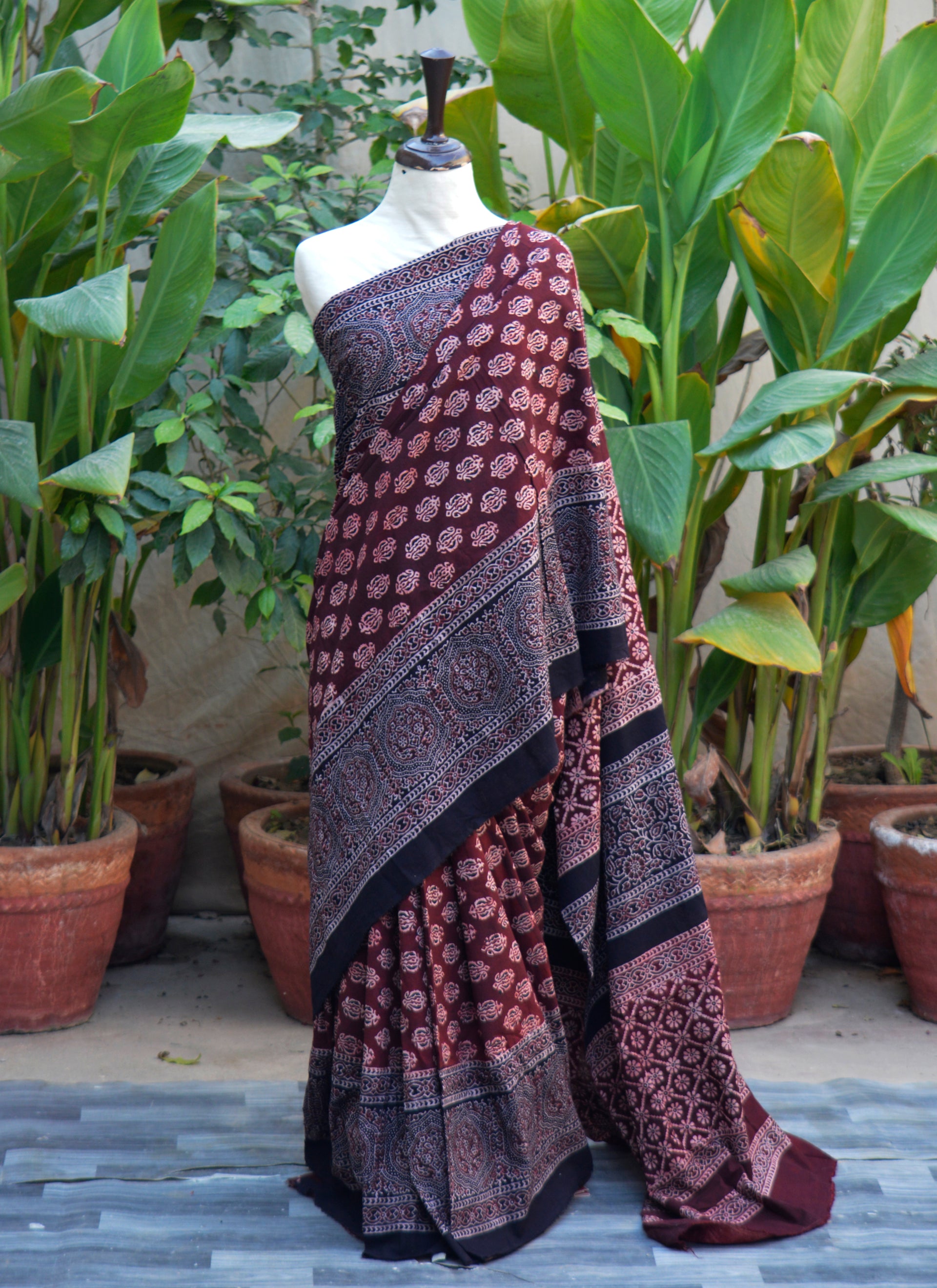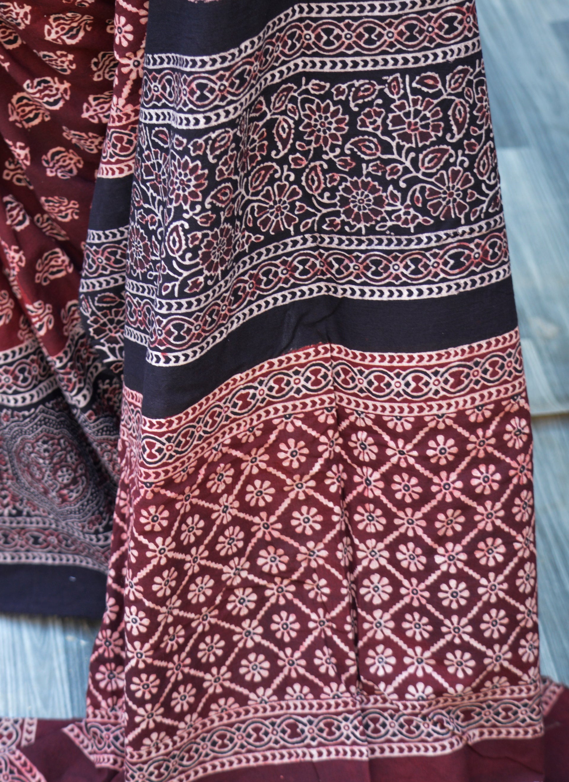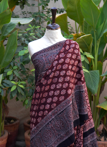 Organic Dye Hand Block Printed Ajrak Floral Maroon Saree – 7 Meter Premium Cotton Saree with Blouse