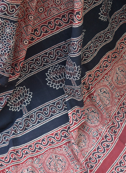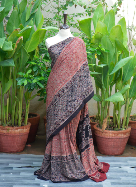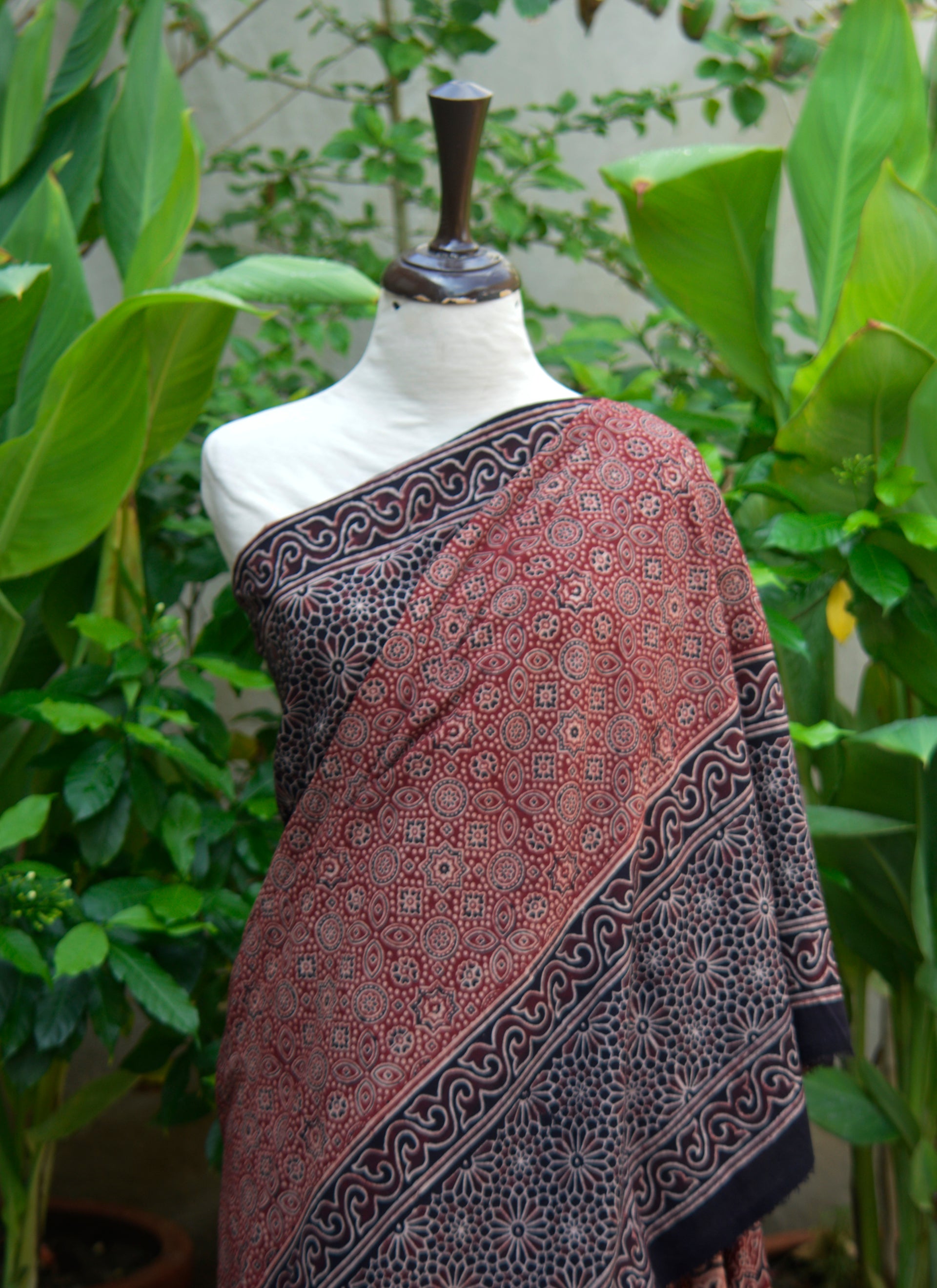 Ajrak printing, a centuries-old craft, represents more than just fashion. It embodies sustainability and tradition, making this saree a timeless addition to any wardrobe. By wearing this Ajrak saree, you are embracing both artistry and a commitment to eco-conscious fashion.