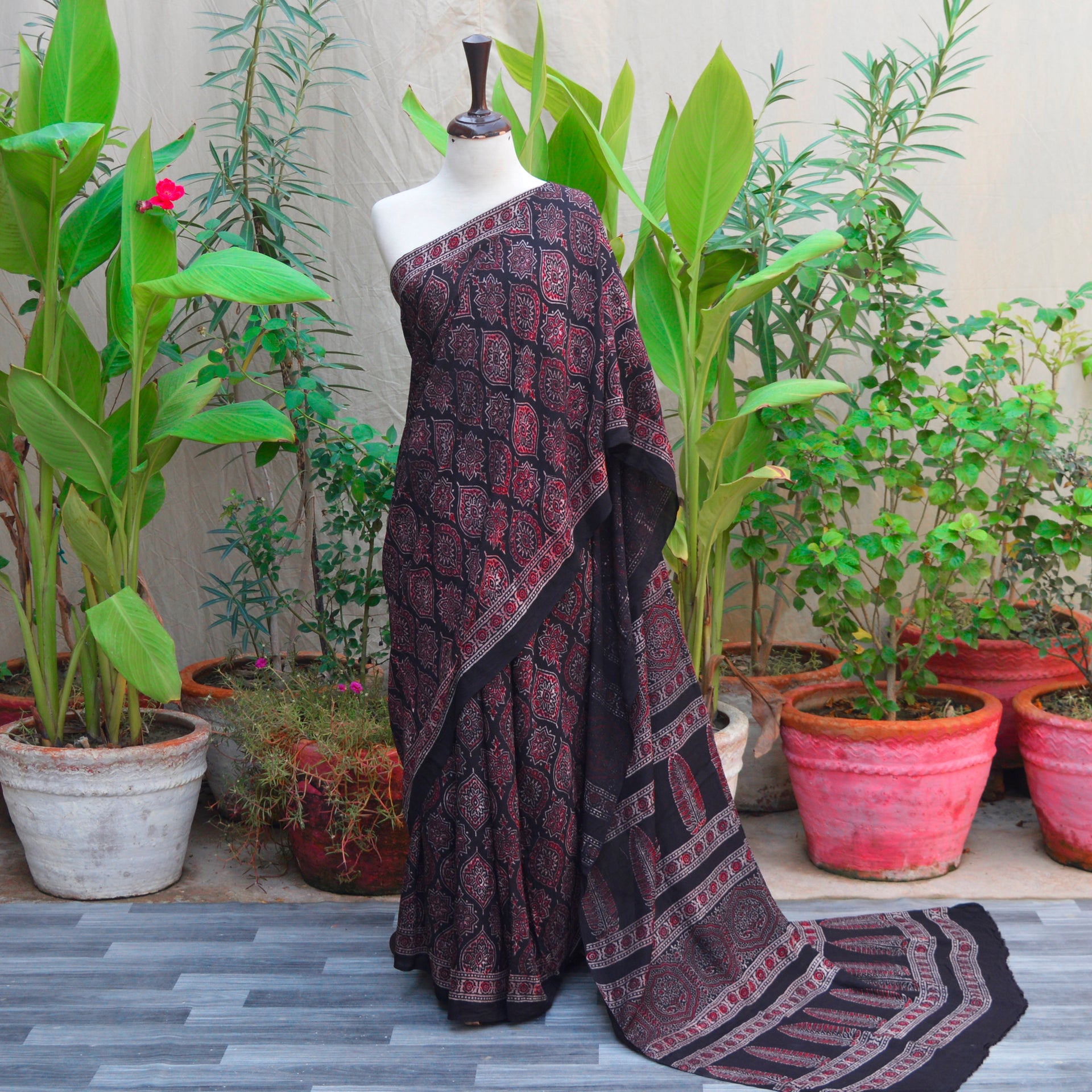 Ajrak printing, a centuries-old craft, is rooted in sustainability and traditional techniques. By wearing this saree, you celebrate a timeless fashion choice that honors the past while also looking toward the future.