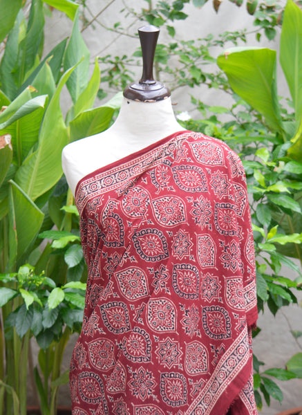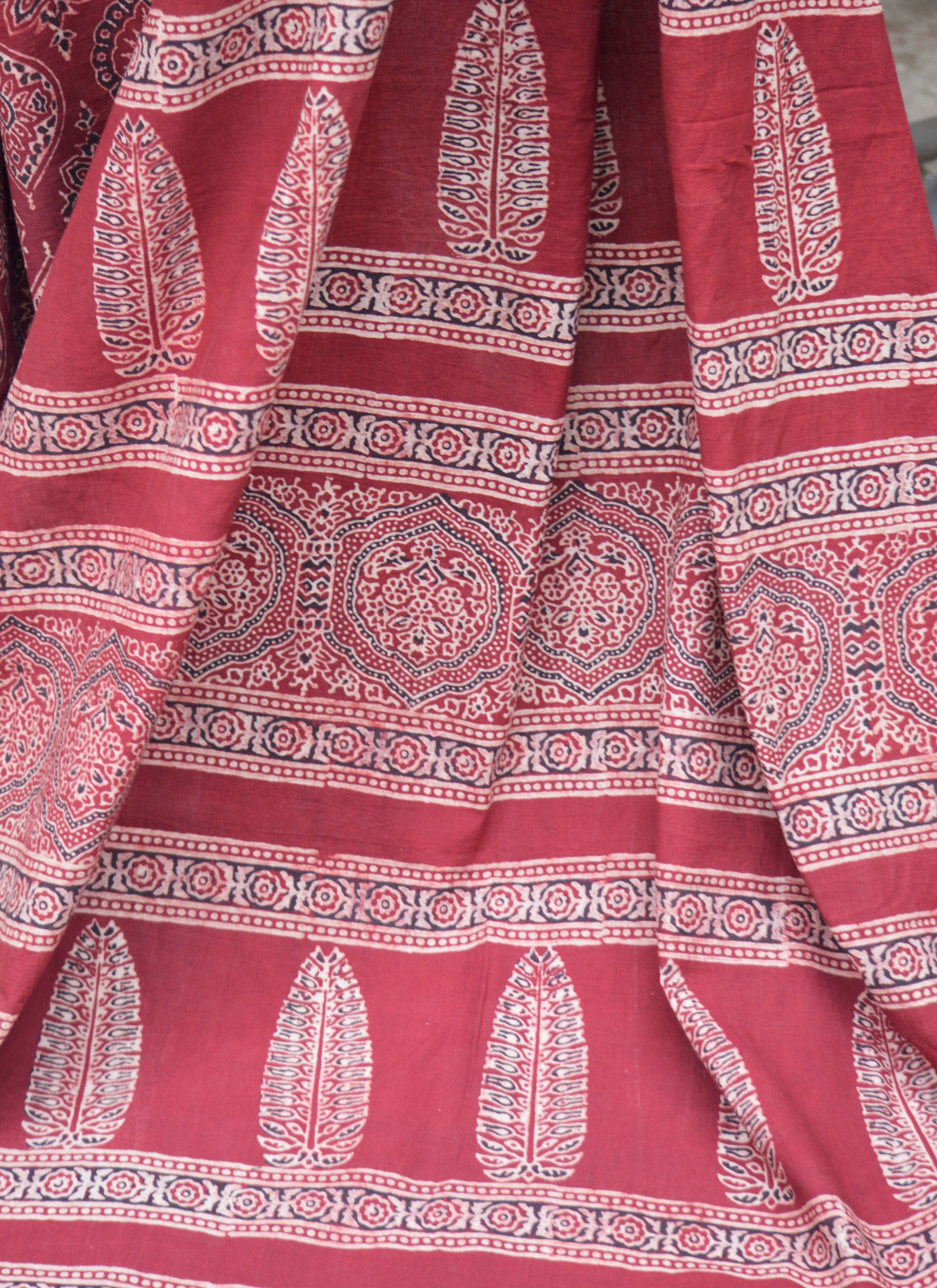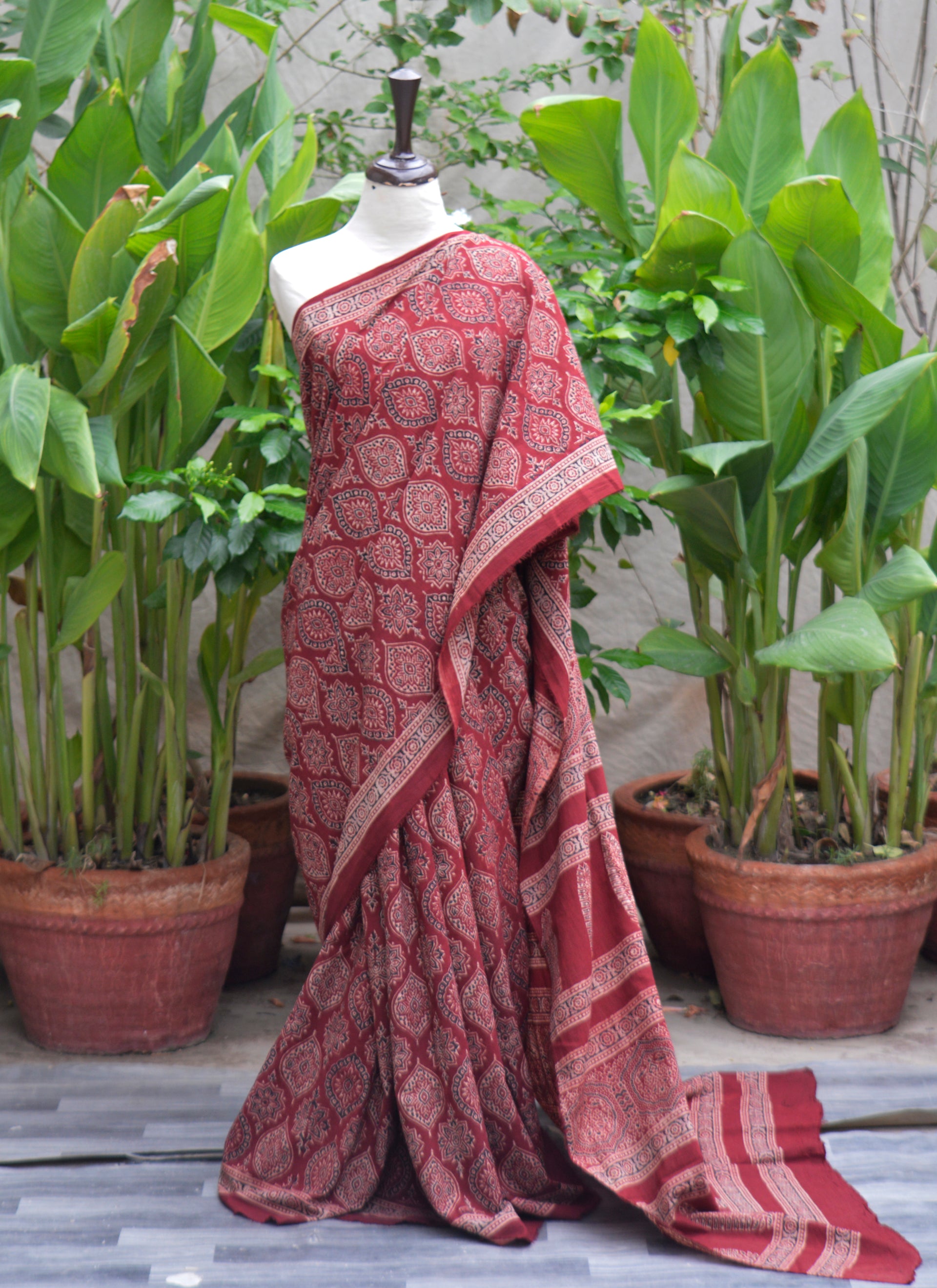 Elevate your ethnic wardrobe with our Organic Dyed Hand Block Printed Ajrak Saree in rich Badam Red, accompanied by a matching blouse piece. Measuring a generous 7 meters in length and 44 inches in width, this saree is crafted from breathable, lightweight lawn cotton using eco-friendly, vegetable-based dyes — offering both comfort and sustainability. Each saree is intricately printed by skilled artisans using traditional Sindhi Ajrak block-printing techniques, resulting in unique motifs that reflect cultural heritage and fine craftsmanship.