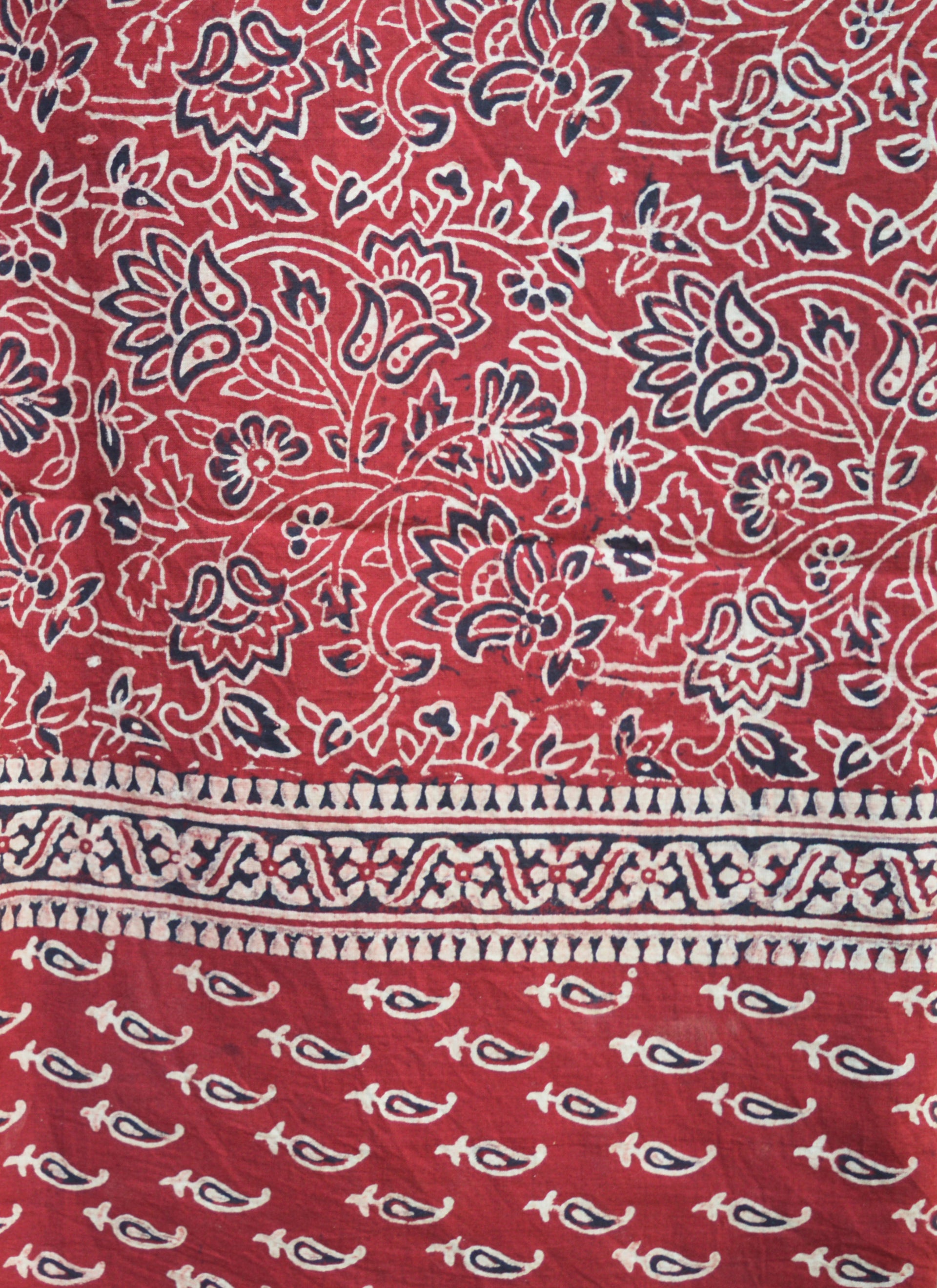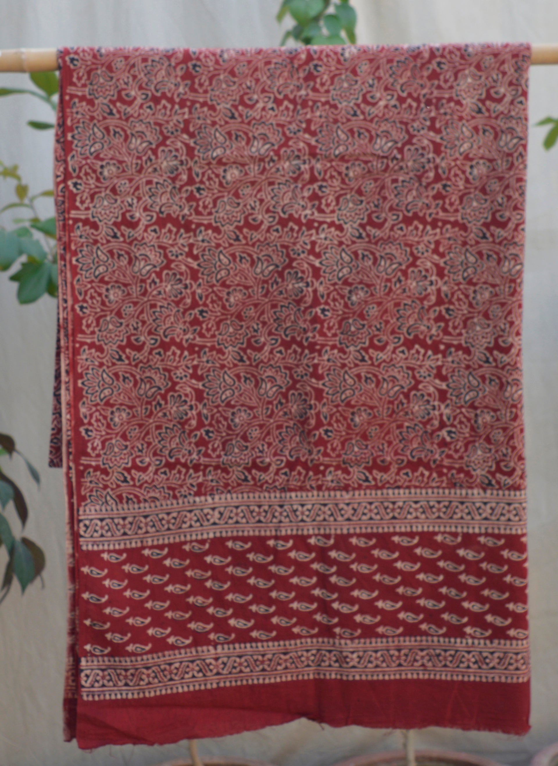 Elevate your wardrobe with the Organic Dye Hand Block Printed Ajrak Floral Bel Unstitched Shirt Piece, a perfect fusion of tradition and modern elegance. Crafted by skilled artisans, this fabric piece showcases the timeless artistry of Ajrak printing, a heritage craft known for its intricate patterns and sustainable techniques.