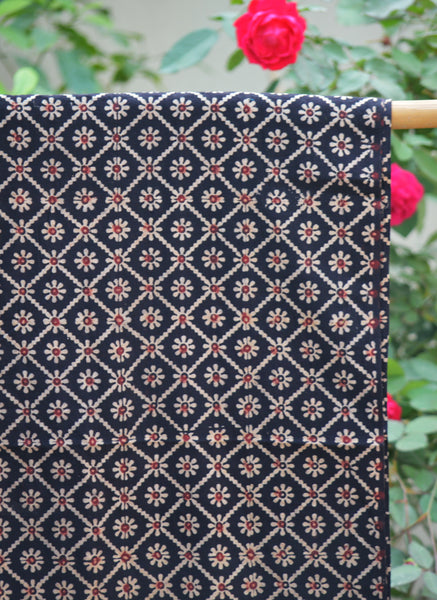 Classic, versatile, and deeply refined, the Ajrak Floral Jaal Black Kurta Fabric is a timeless expression of handcrafted elegance. Featuring an all-over floral jaal pattern, this unstitched kurta fabric is meticulously hand block printed using traditional techniques and finished with organic, natural dyes for a rich yet breathable feel.