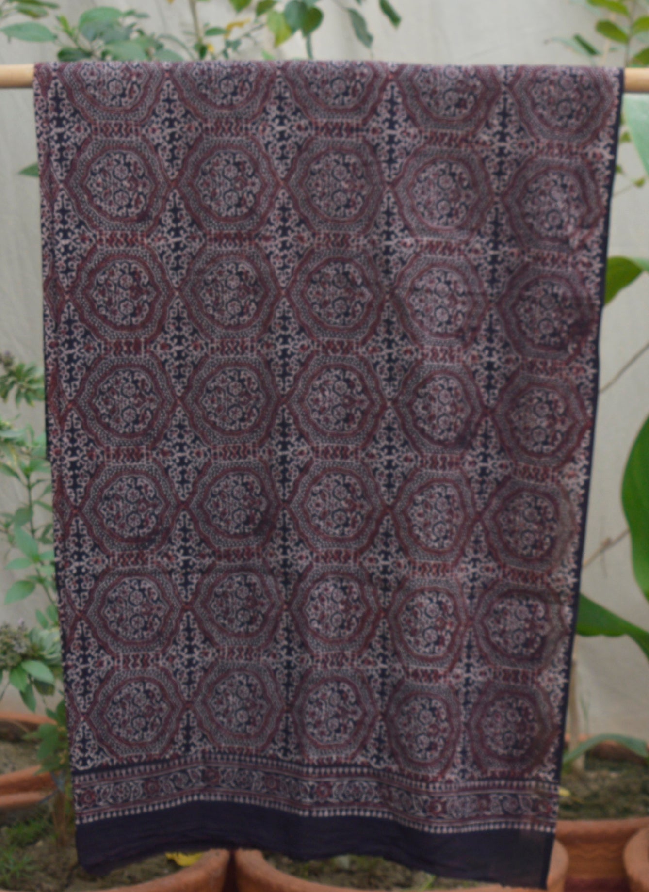 Handcrafted by skilled artisans, this piece embodies the rich heritage of Ajrak printing, a centuries-old tradition known for its intricate patterns and deep cultural significance. The use of organic dyes sourced from natural materials ensures an eco-friendly, sustainable fashion choice, making it both a stylish and responsible addition to your wardrobe.