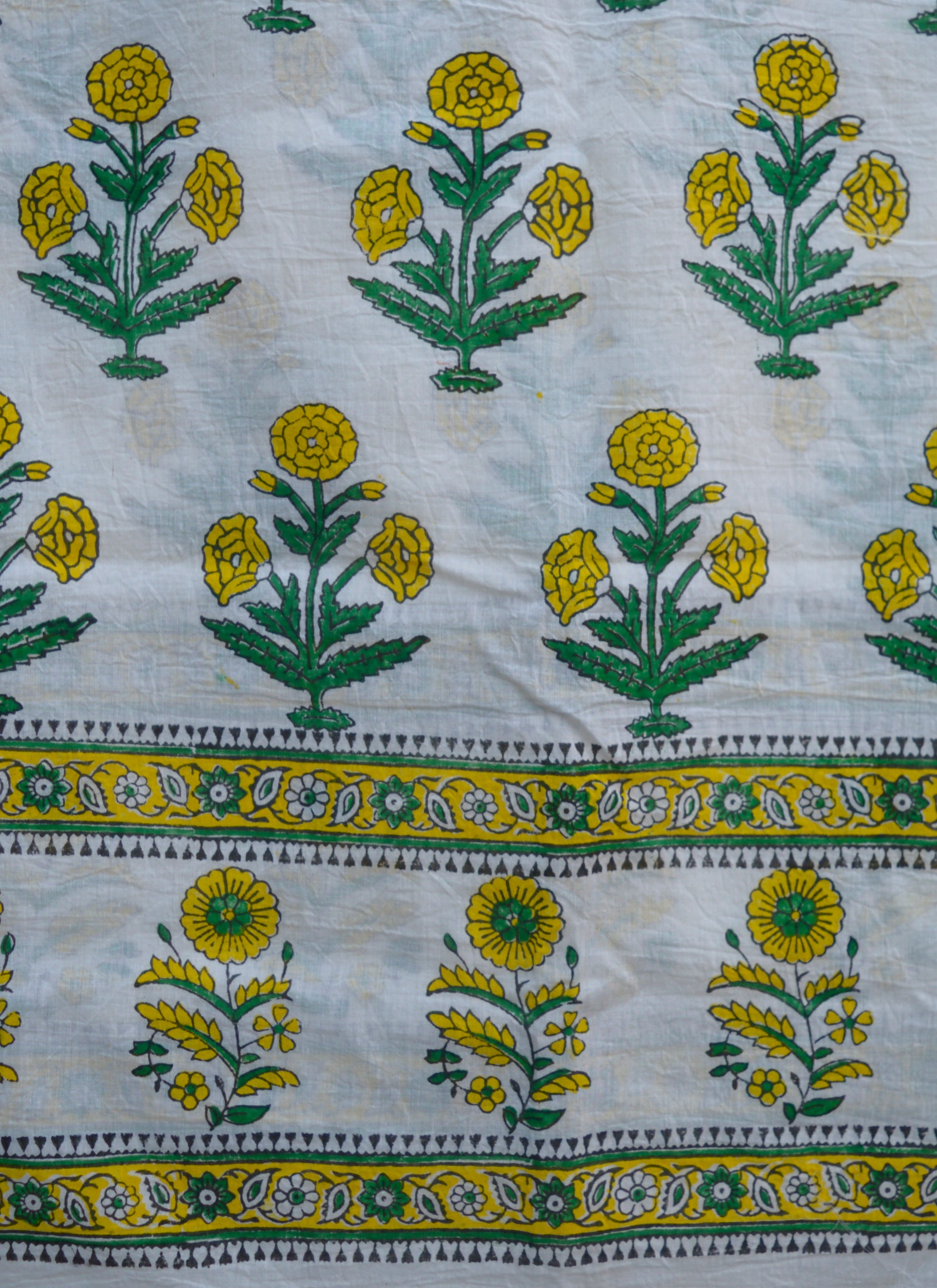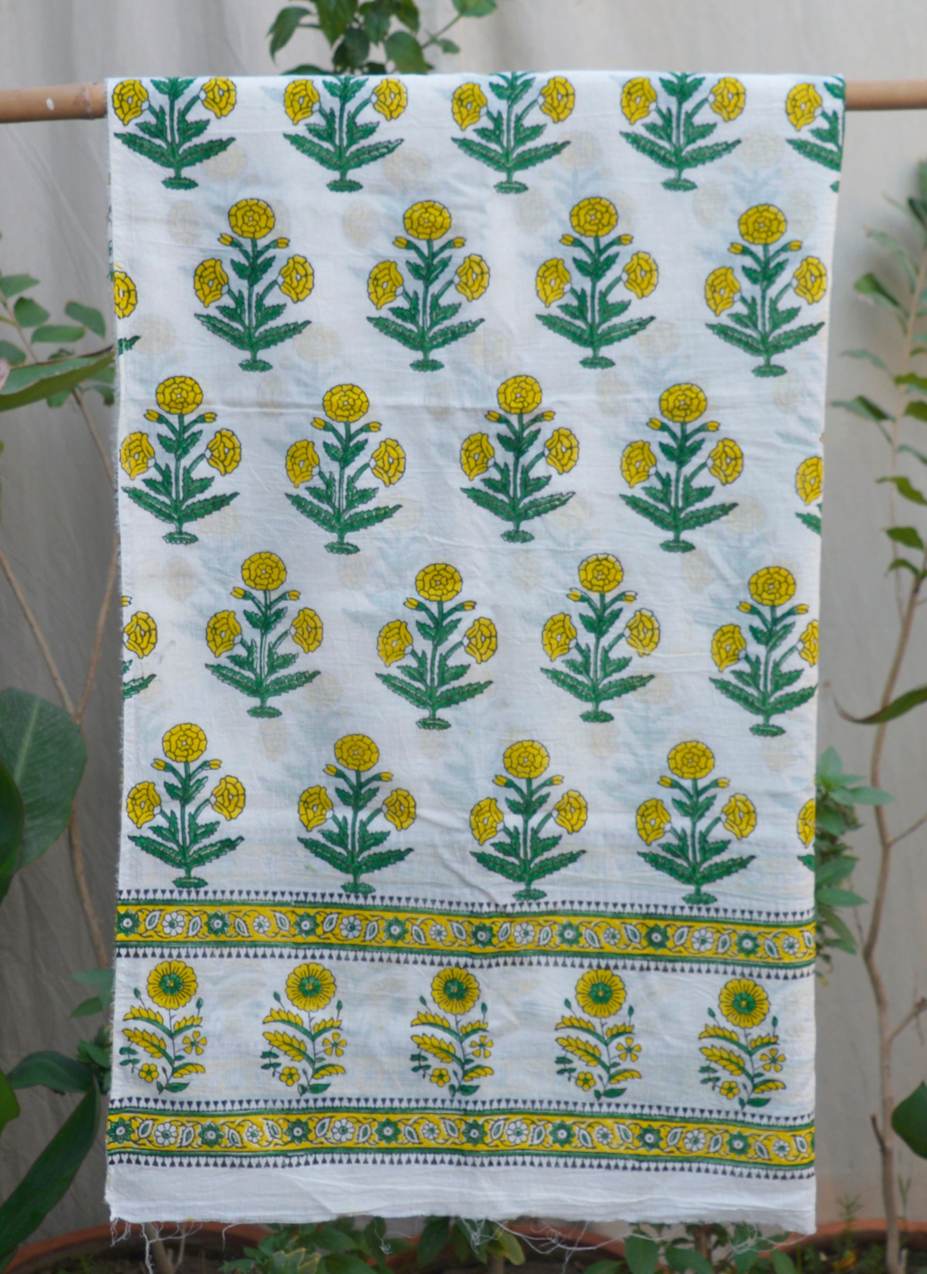 Featuring intricate floral motifs, this fabric is designed using the age-old Ajrak-inspired hand block printing technique, preserving the heritage of traditional craftsmanship while adding a modern touch. The vibrant yellow hue, adorned with detailed Butta flower patterns, creates a timeless and sophisticated look, perfect for various occasions.