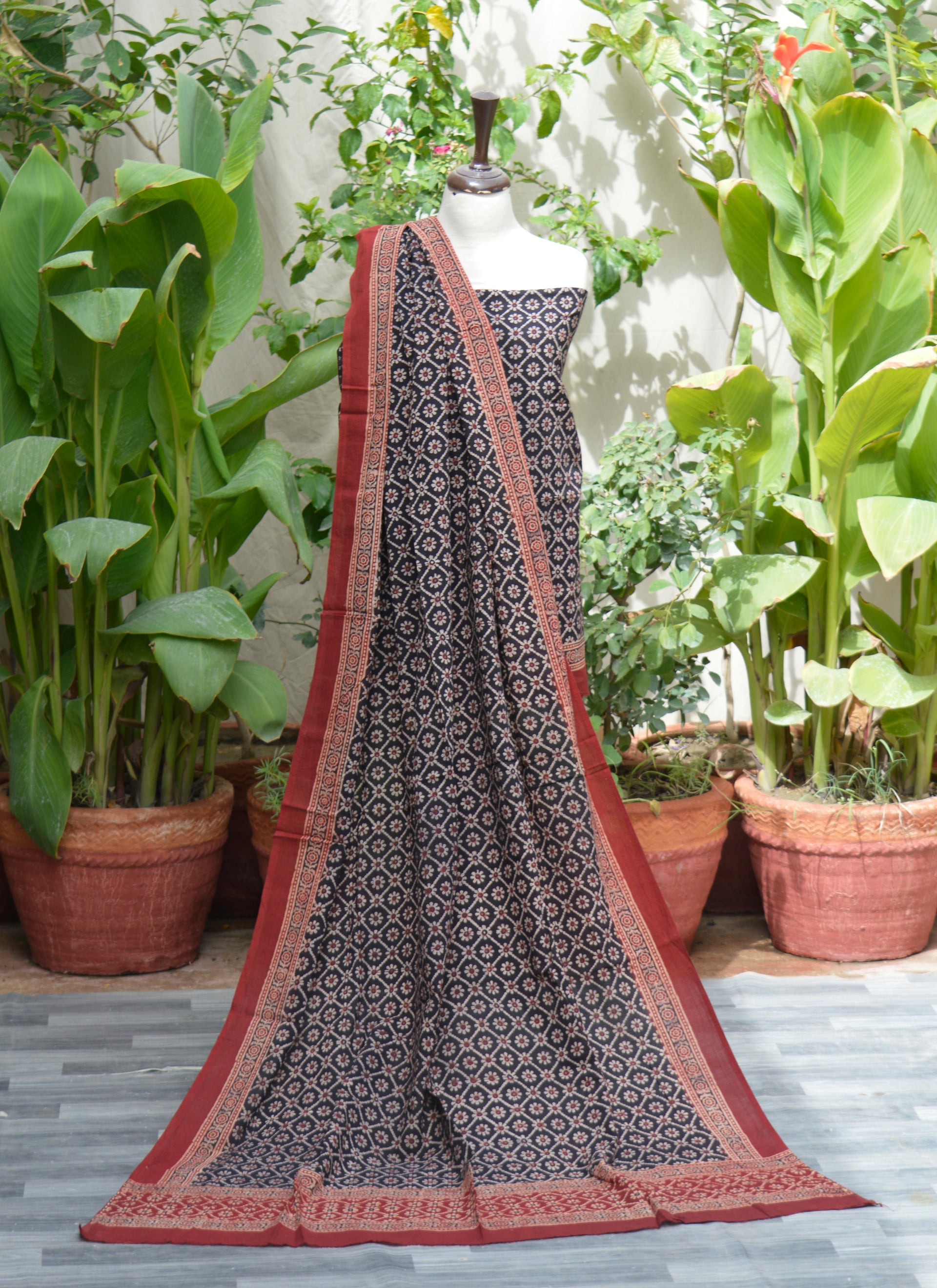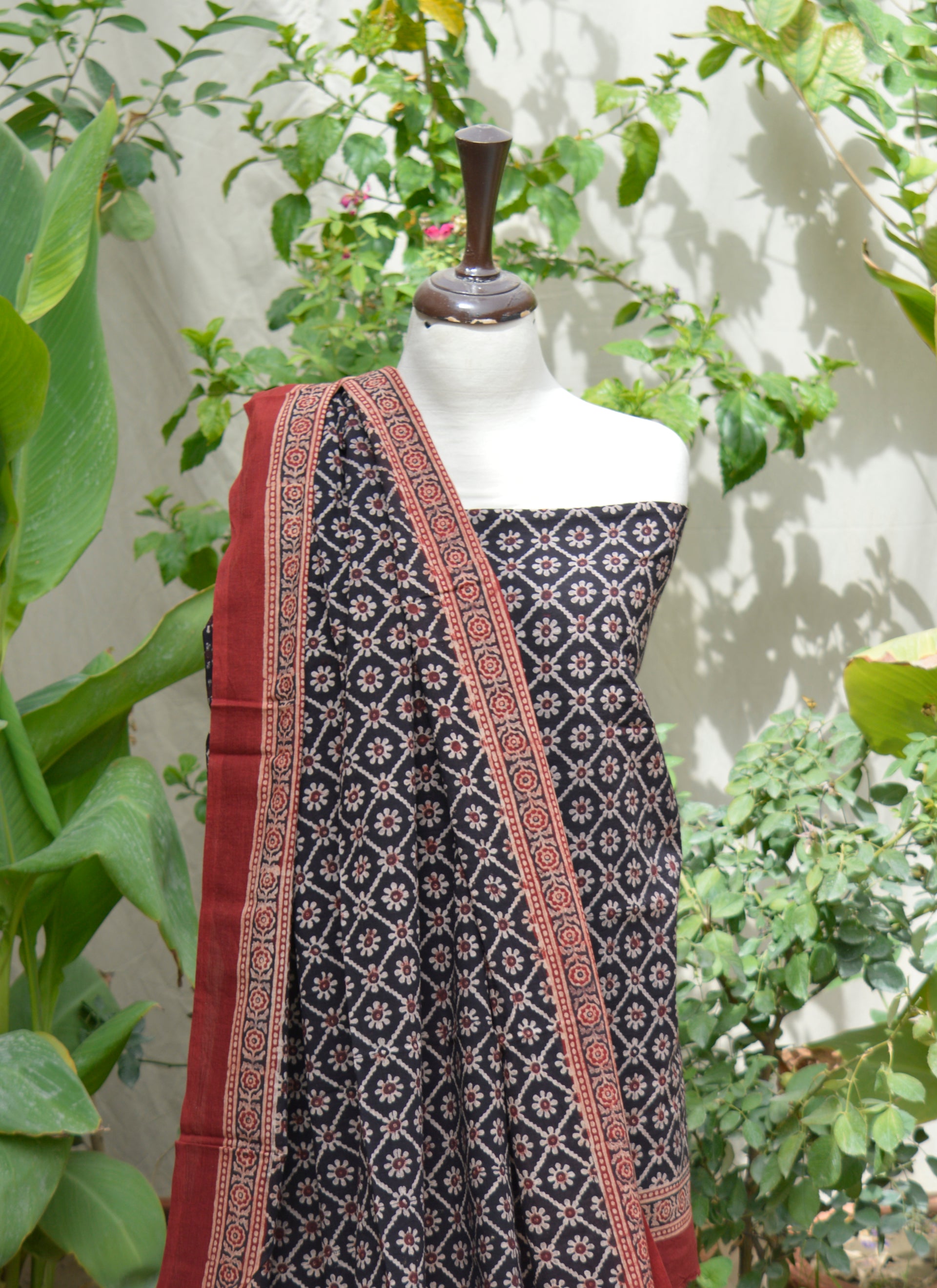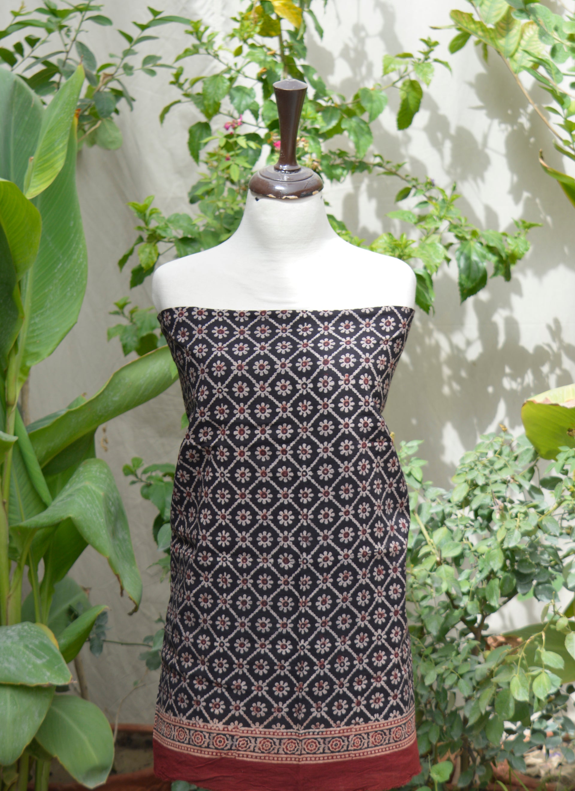 Experience the timeless beauty of Ajrak craftsmanship with our Organic Dye Hand Block Printed Ajrak Floral Jaal Black Dress. This unstitched two-piece set, featuring a shirt and matching dupatta, is meticulously crafted using traditional block printing techniques and natural dyes, ensuring sustainability and authenticity.