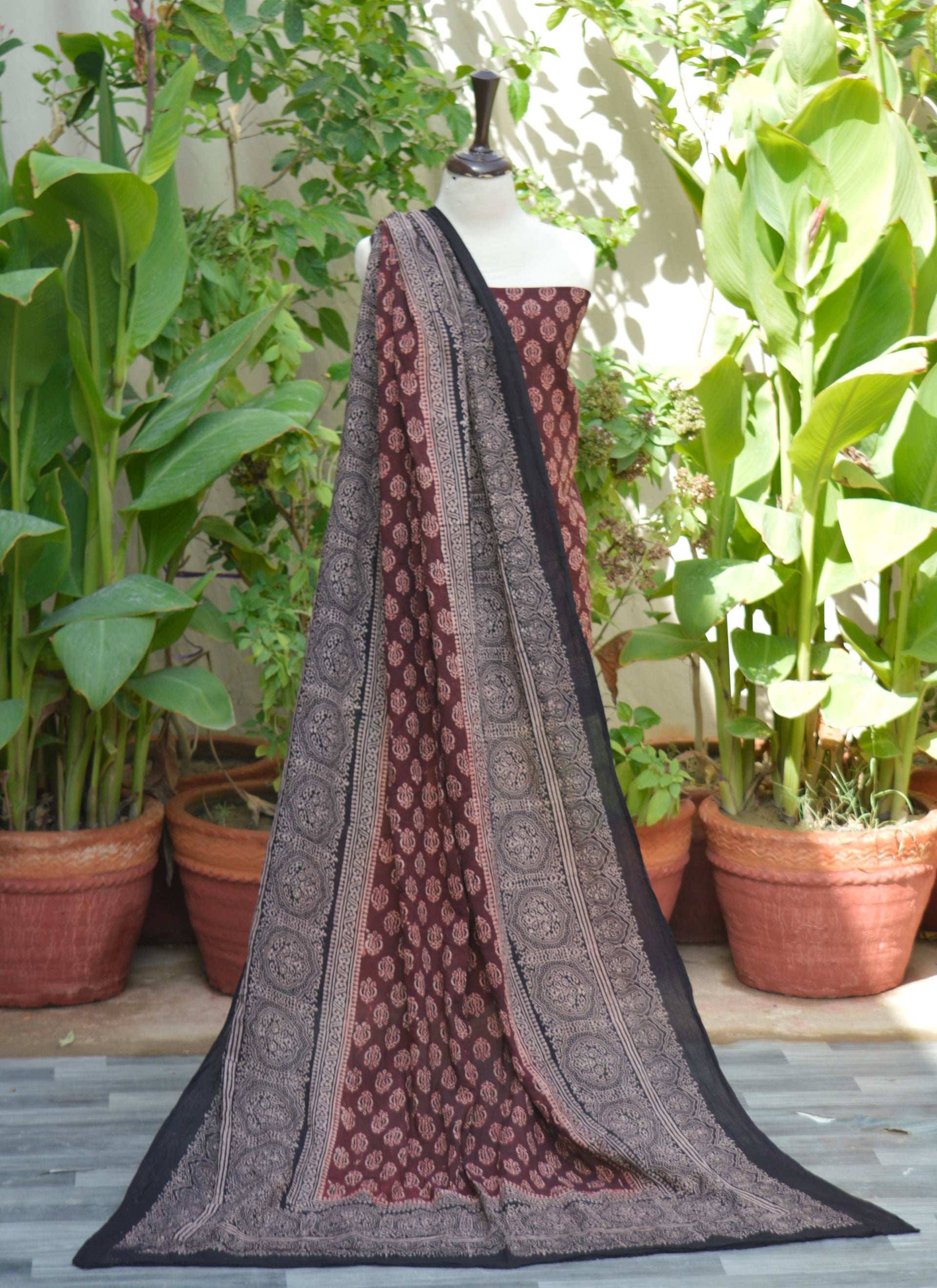 Elevate your wardrobe with our Ajrak Floral Maroon Two-Piece Set, a perfect blend of tradition and elegance. This hand block printed unstitched ensemble, crafted from breathable and soft Lawn fabric, features a beautifully designed shirt paired with a matching Ajrak dupatta. The intricate floral motifs in a rich maroon hue showcase authentic Sindhi craftsmanship, making this set an ideal choice for cultural gatherings, festive occasions, and everyday wear. Experience timeless charm and comfort in this heritage-inspired Ajrak outfit.
