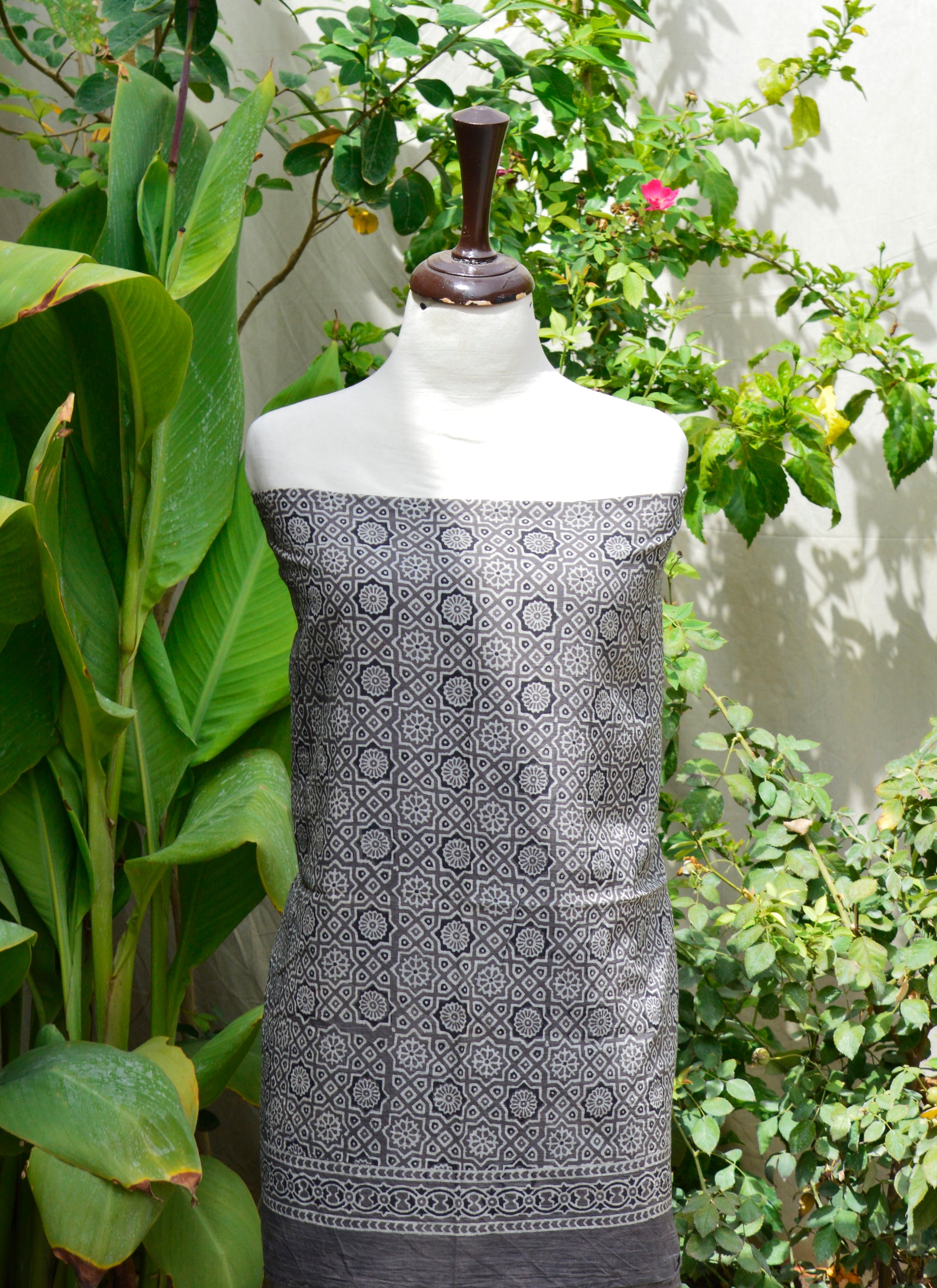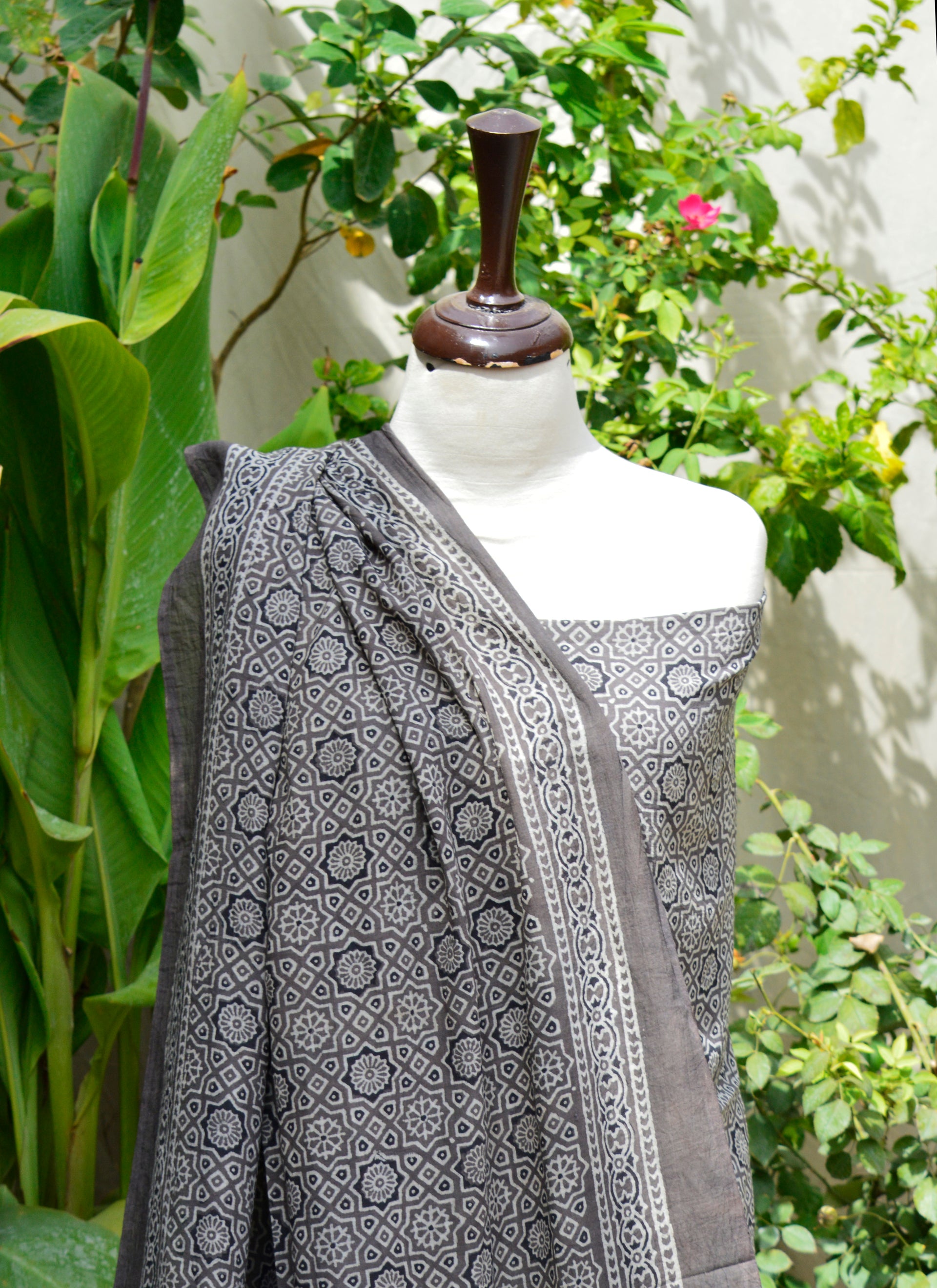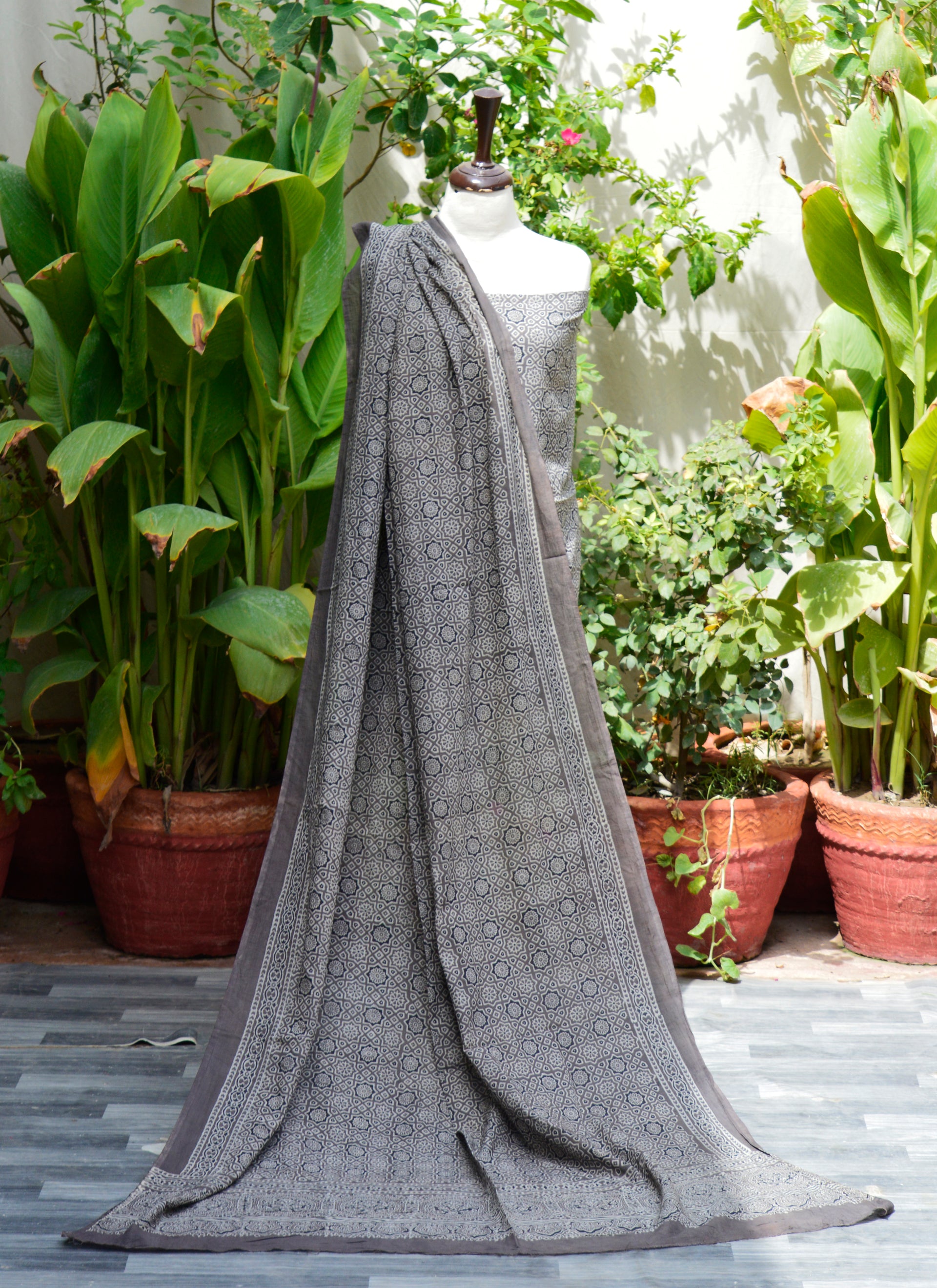 Experience the timeless beauty of Sindhi craftsmanship with our Ajrak Grey Moroccan Two-Piece Set, featuring a stylish shirt and a matching dupatta. Crafted from premium lawn fabric, this outfit is soft, breathable, and perfect for every season. The elegant grey base is adorned with intricate Moroccan patterns, inspired by traditional Ajrak block printing, adding a touch of heritage and sophistication to your wardrobe. Whether styled with trousers or a classic shalwar, this ensemble is ideal for festive gatherings, cultural events, or casual everyday wear. Each piece is carefully handcrafted by skilled artisans, celebrating the rich legacy of Ajrak.