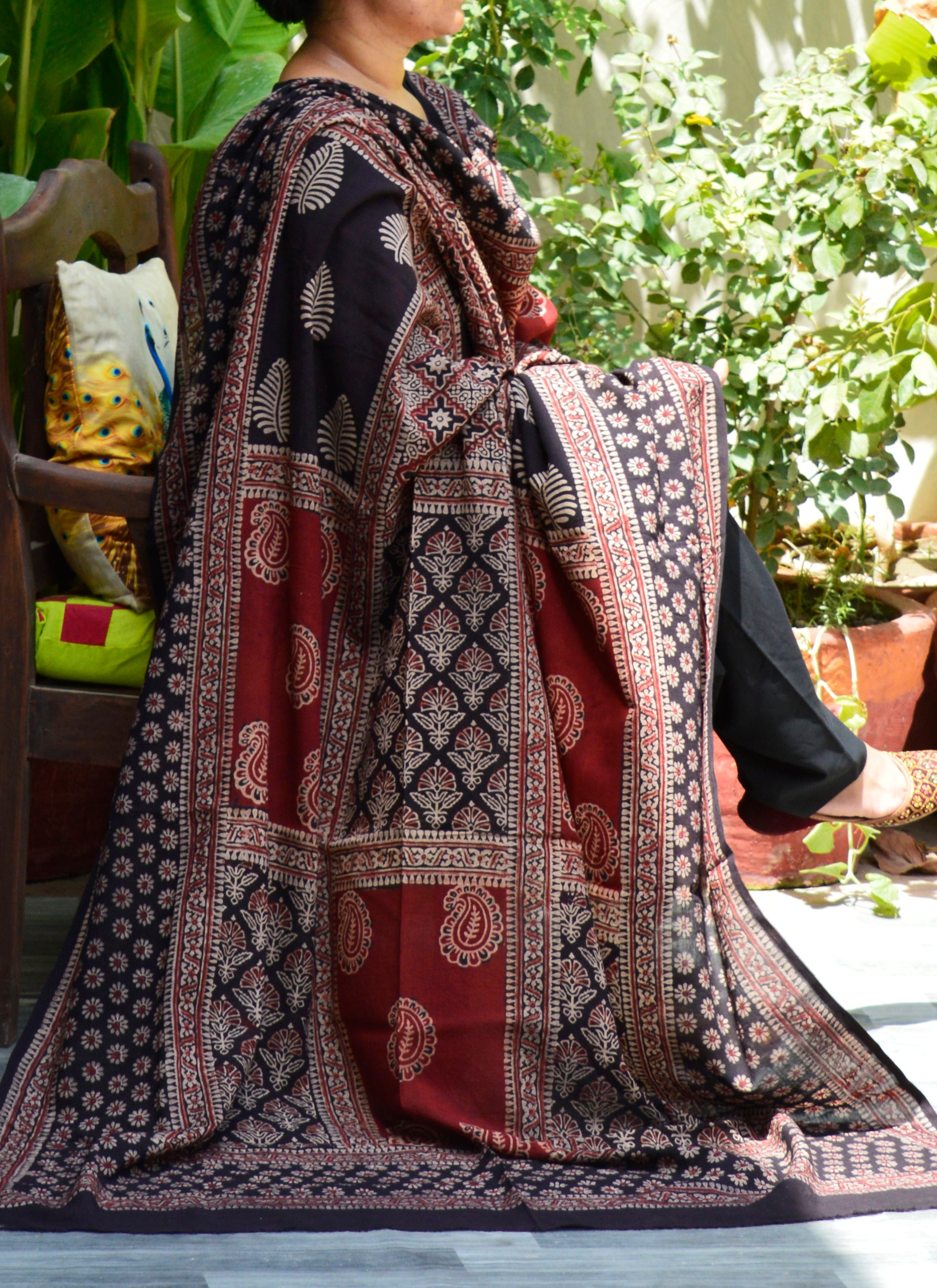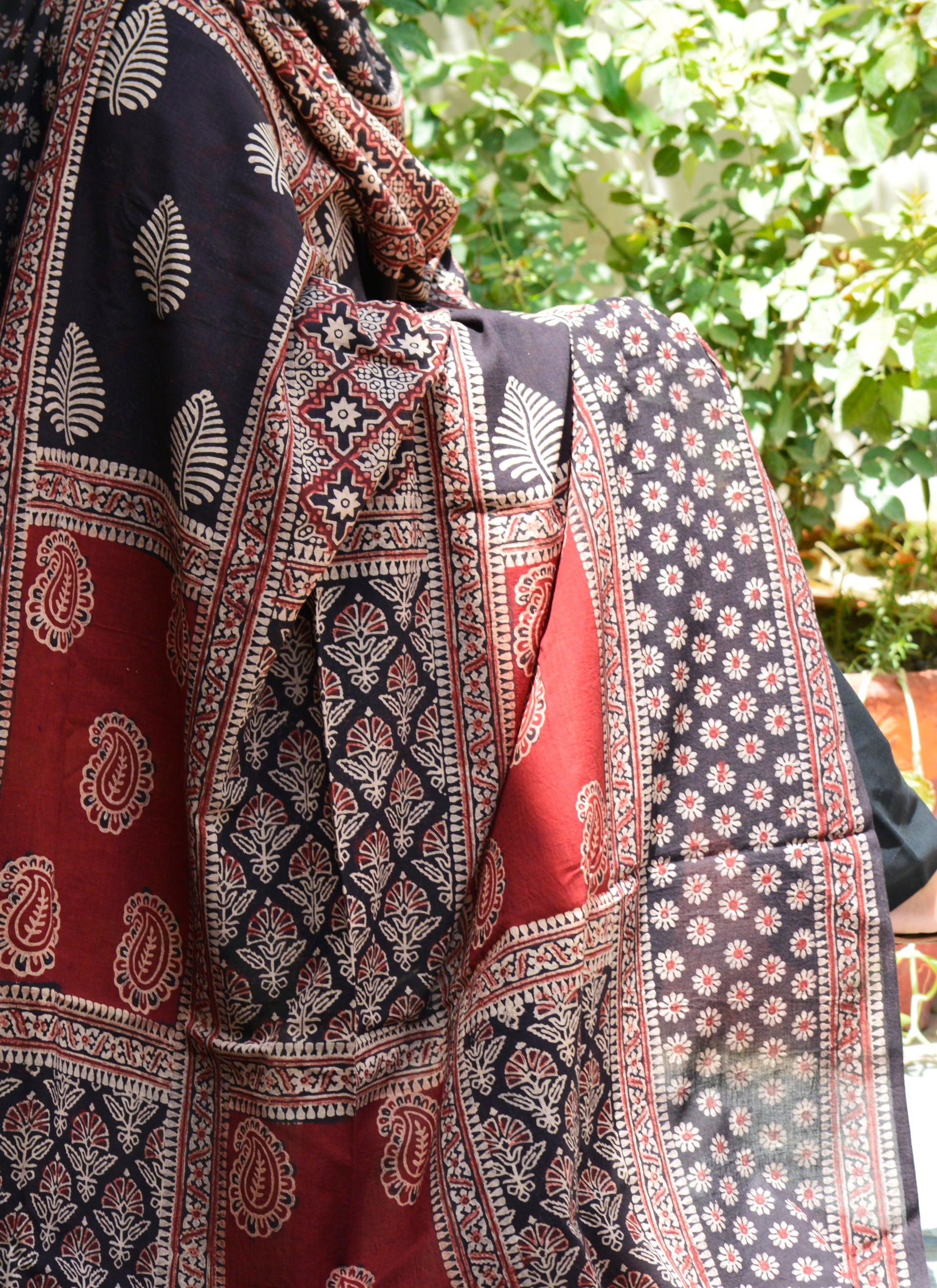 First and foremost, artisans meticulously craft our Ajrak Multi Blocks Classic using hand block printing techniques passed down through generations. Each piece reflects the dedication and skill of the artisans, showcasing intricate geometric and floral patterns in deep Red and black. This attention to detail highlights the authenticity and cultural significance of this timeless Ajrak craft.