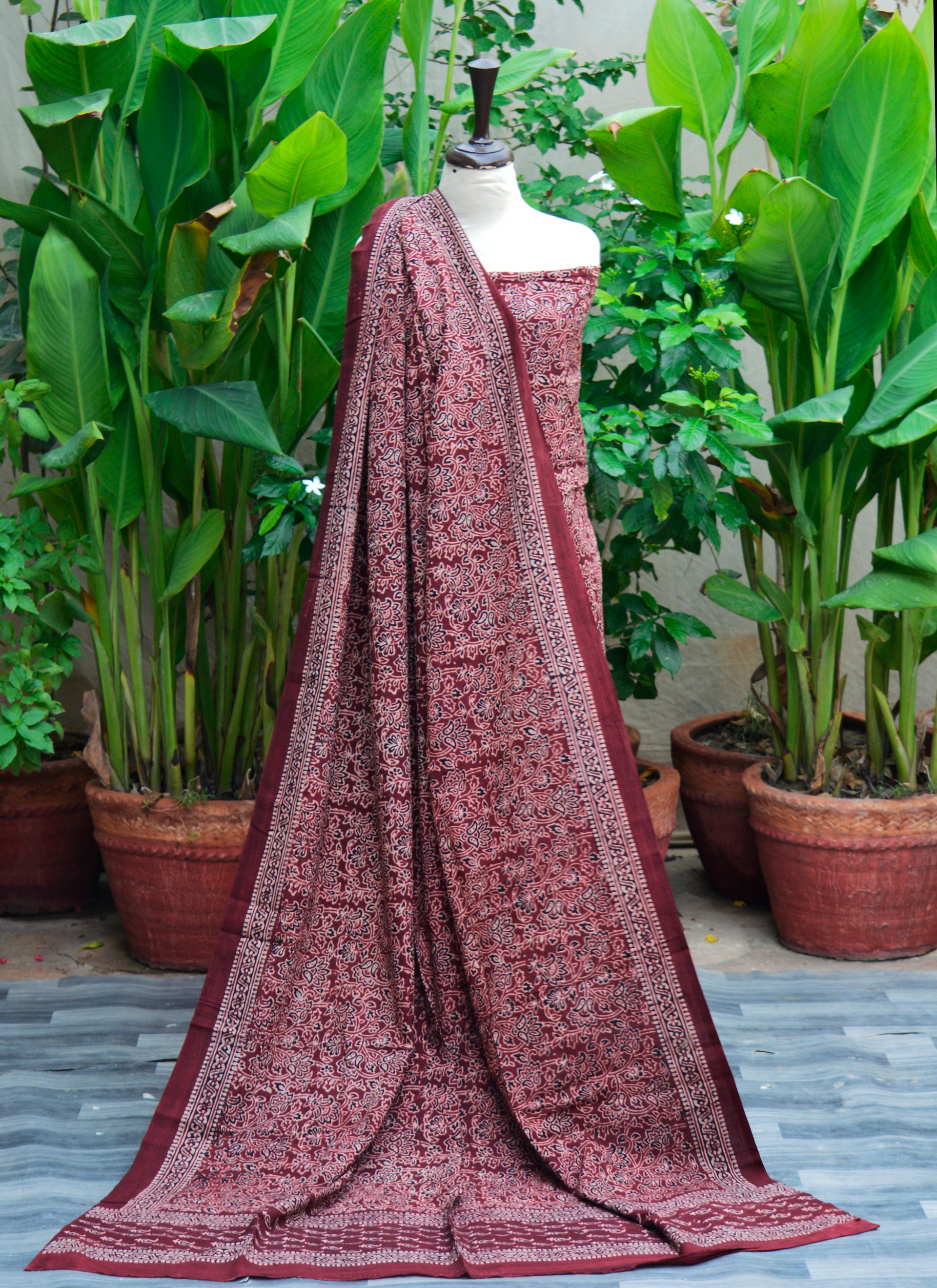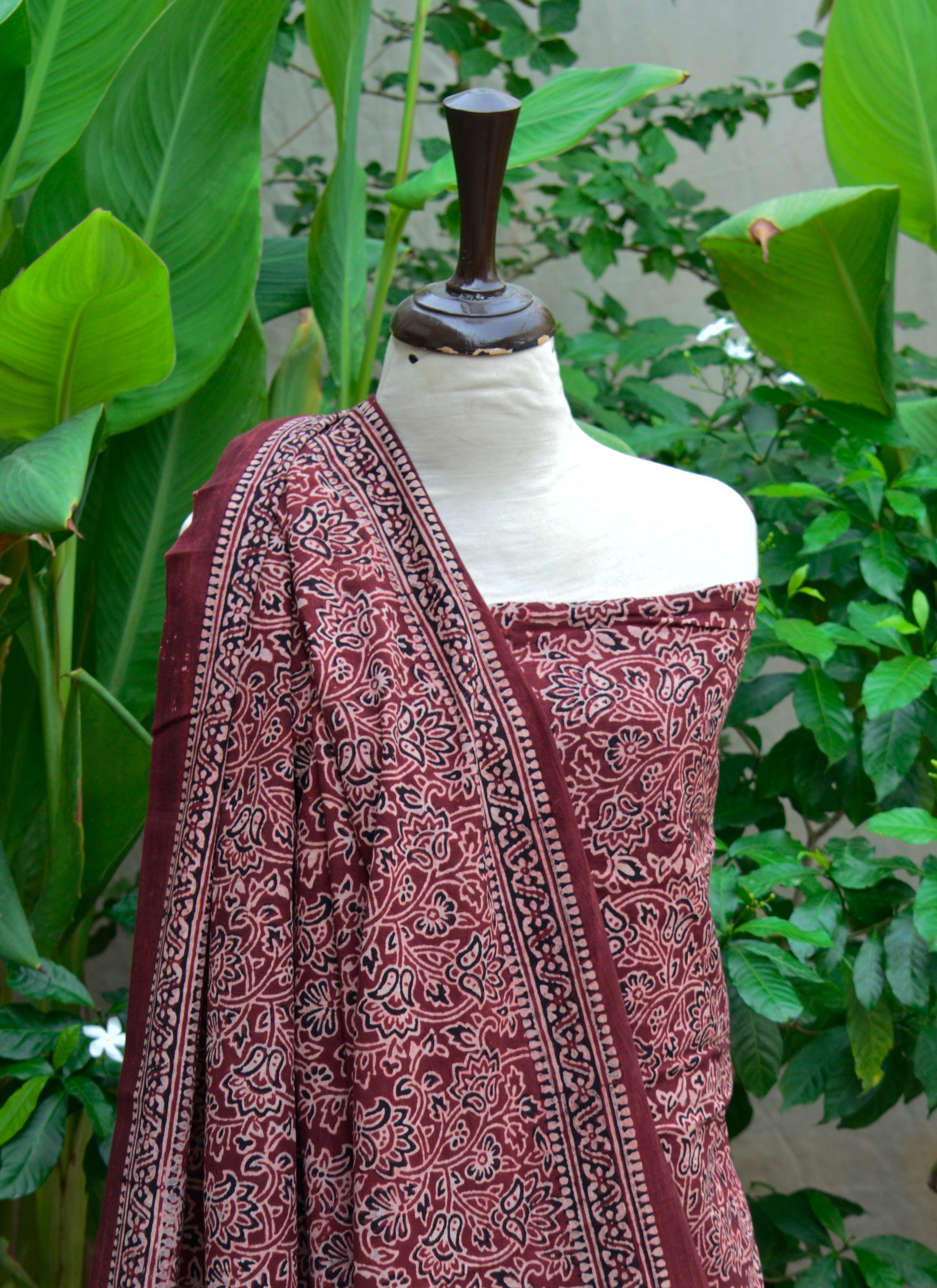 Celebrate cultural elegance with this Ajrak Floral Bel Two-Piece Cotton Dress, hand block printed with delicate floral bel motifs in traditional Ajrak style. Crafted from breathable cotton, this unstitched shirt and dupatta set offers comfort, versatility, and timeless beauty perfect for creating your own custom traditional or modern outfit.