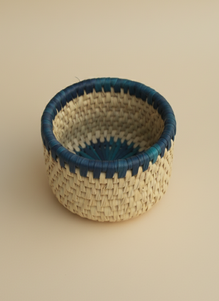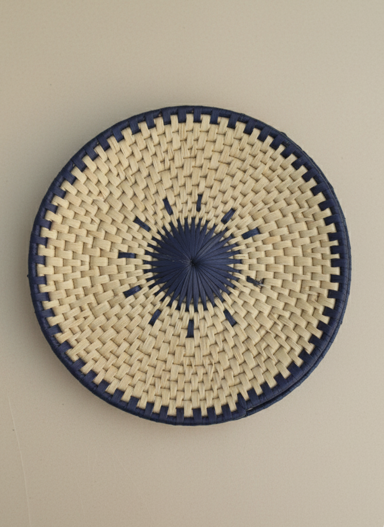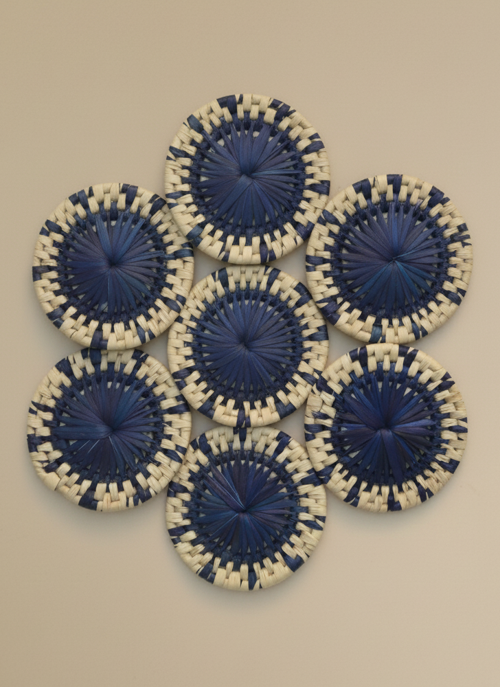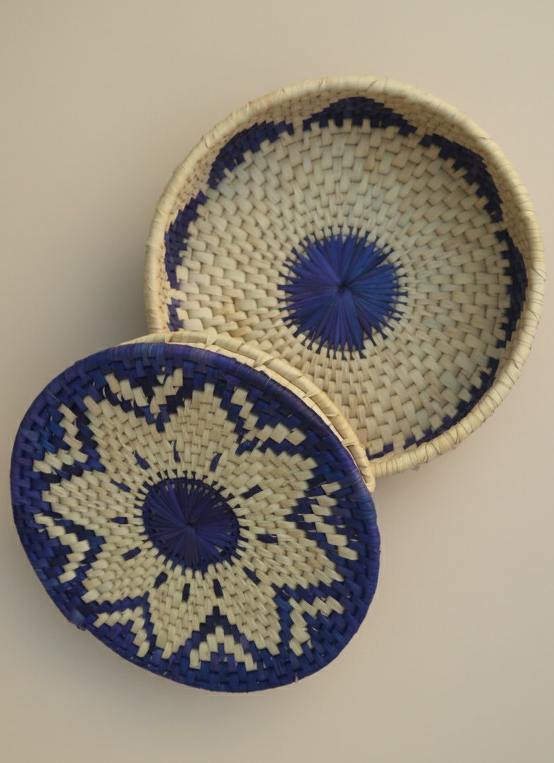 Infuse your dining experience with artisan elegance and sustainable style using this handcrafted Hand Woven Palm Leaf Indigo Dining Set. This complete set includes one indigo-dyed palm leaf bread basket, six matching palm-leaf table mats, six traditional “Changair” breads/serving plates, six palm-leaf tea coasters and one palm-leaf glass basket all made by skilled rural women artisans of Sindh using natural date-palm leaves. The rich indigo hue adds a vibrant, modern touch while celebrating centuries-old Sindhi weaving traditions.