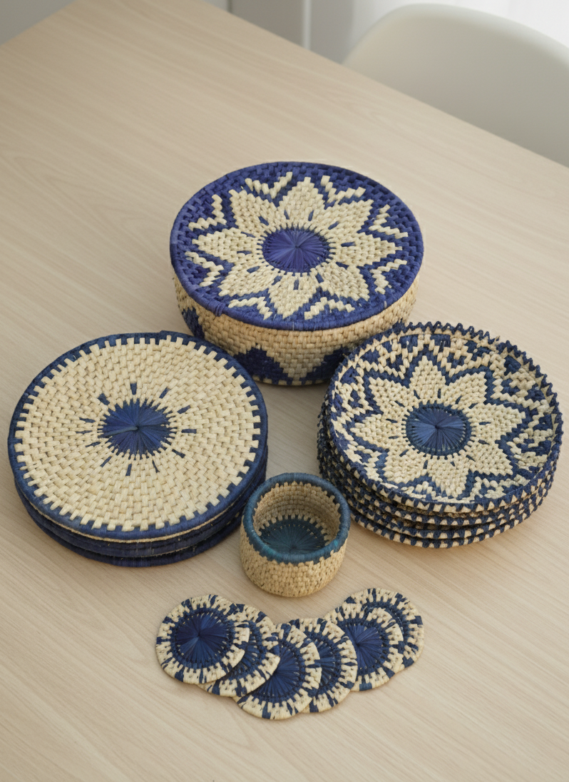 Each piece is lightweight yet sturdy, making the set perfect for everyday family meals, festive gatherings, or as a unique gift for those who appreciate eco-friendly home décor. The natural palm-leaf material ensures durability and reusability, while the hand-woven craftsmanship means that each set is truly one-of-a-kind — slight variations in weave, size, or shade are the hallmark of authentic artisan work. Bring home this sustainable dining collection and transform your table into a statement of cultural heritage, refined design and green living.