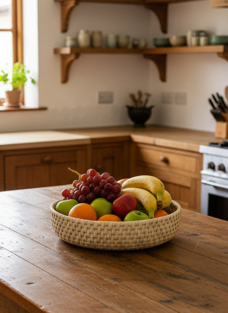 Discover an artisanal masterpiece with this Hand Woven Palm Leaf Green Baaree Geometrical Floral Fruit Basket, measuring 10.5 × 3 inches. Crafted by skilled craftsmen from natural palm leaves, this eco-friendly tray features a striking “Baaree” (diamond) geometrical pattern interwoven with floral motifs in a rich green hue—bringing traditional design and modern flair to your table. Lightweight yet durable, it is perfect for displaying fresh fruit, serving snacks or bread, or enhancing your home décor with sustainable, rustic elegance. Whether for everyday use or as a statement piece, this basket blends handcrafted heritage with functional style, making it an ideal addition for conscious shoppers in Pakistan and beyond. Its vibrant green geometry-floral motif adds a unique cultural touch while the palm-leaf weaving supports artisan livelihoods and sustainable craft traditions.