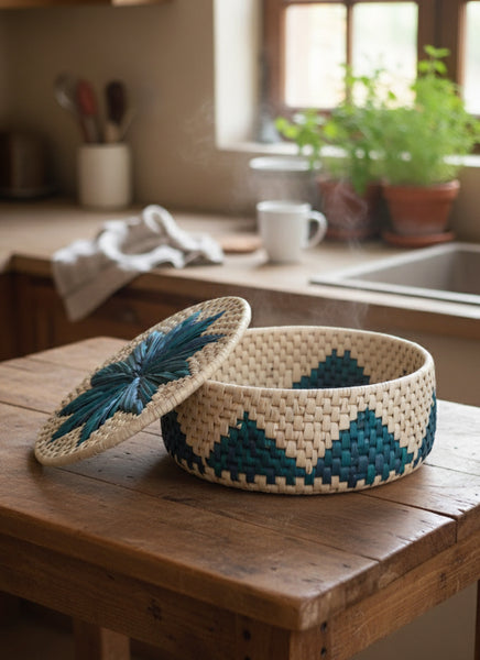 Bring natural elegance to your dining with this Hand Woven Palm Leaf Bread Basket in Ferozi Color. Traditionally known as Roti Dan, this basket is skillfully handcrafted by women artisans using sustainable palm leaves. Perfect for storing bread, roti, naan, or serving fruits, it combines durability with cultural charm.