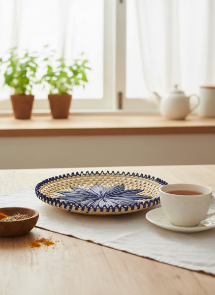 Bring cultural elegance to your dining table with this Hand Woven Palm Leaf Bread Plate (Changair) in Dark Blue Color, size 11x11 Inches. Traditionally used across Sindh for serving roti, naan, and paratha, the Changair also works beautifully for fruits, snacks, or as a decorative handmade piece.