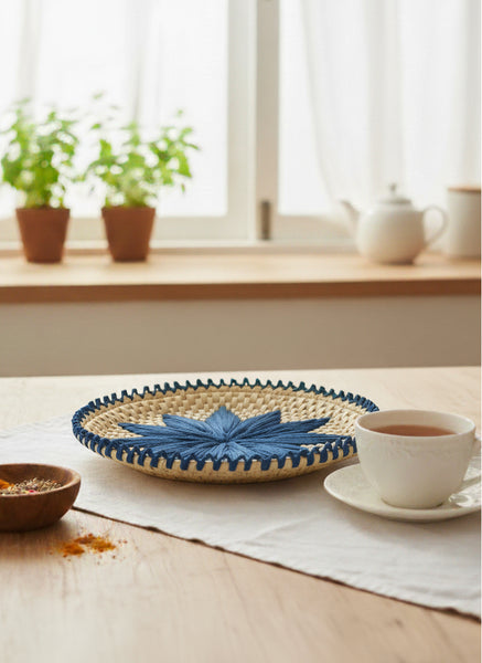 Brighten your dining with this Hand Woven Palm Leaf Bread Plate (Changair) in Ferozi Color, size 11x11 inches. Traditionally used in Sindhi households, the Changair is a cultural essential for serving roti, naan, and paratha. It also works beautifully for holding fruits, snacks, or as a vibrant decorative wall piece.