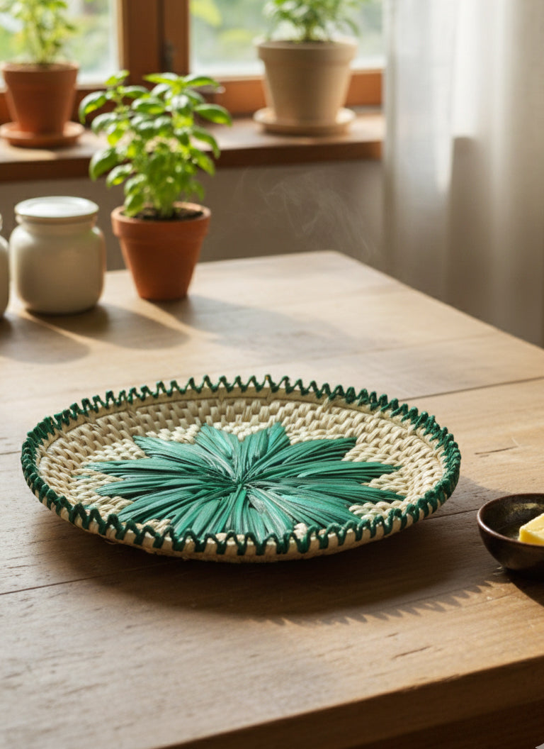 Handcrafted by skilled women artisans using natural palm leaves, this eco-friendly bread plate is durable, lightweight, and sustainable. The solid green design brings a refreshing pop of color, making it both a practical kitchen essential and a unique piece of cultural heritage.