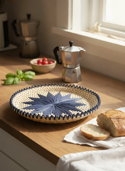 Enhance your dining with this Hand Woven Palm Leaf Bread Plate (Changair) in Purplish Blue Color, size 10x10 Inches. Traditionally crafted and used in Sindhi households, the Changair is a versatile bread plate perfect for serving roti, naan, paratha, or as a vibrant fruit and snack tray.