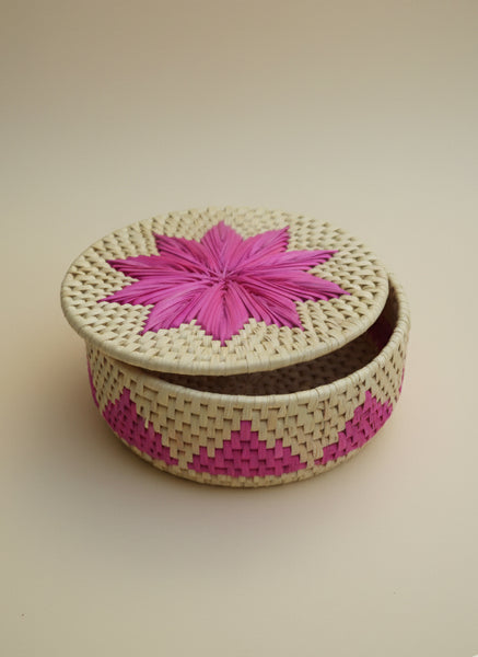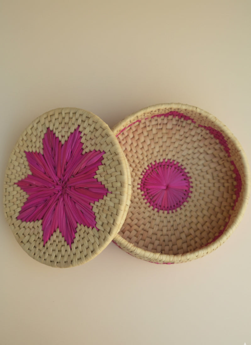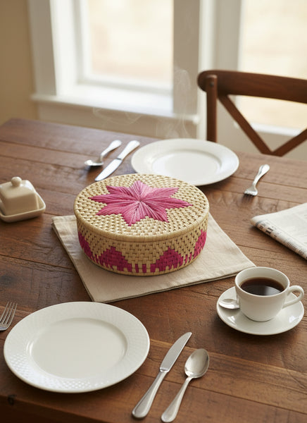 Hand Woven Palm Leaf Pink Flower Bread Basket – Eco-Friendly Artisan Roti Dan
