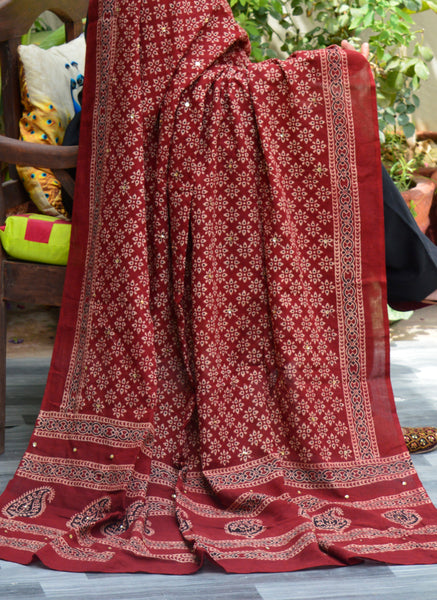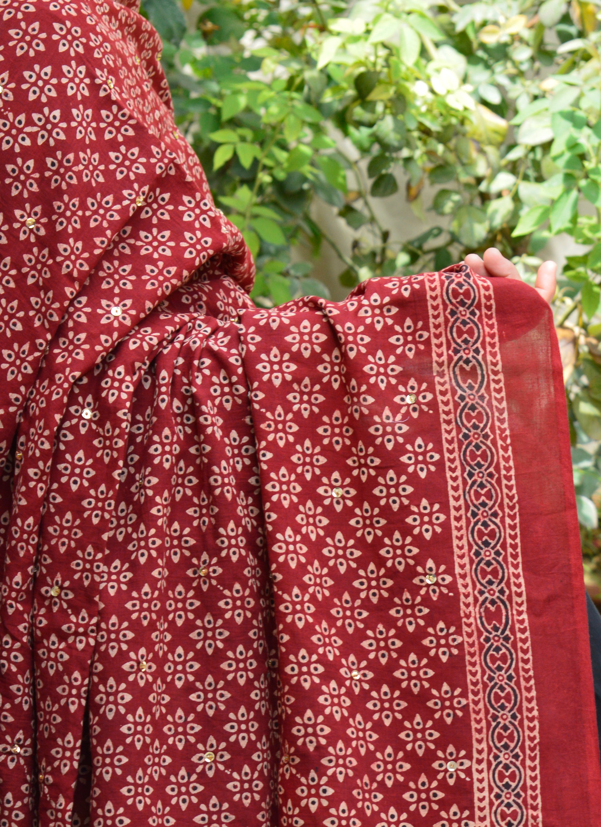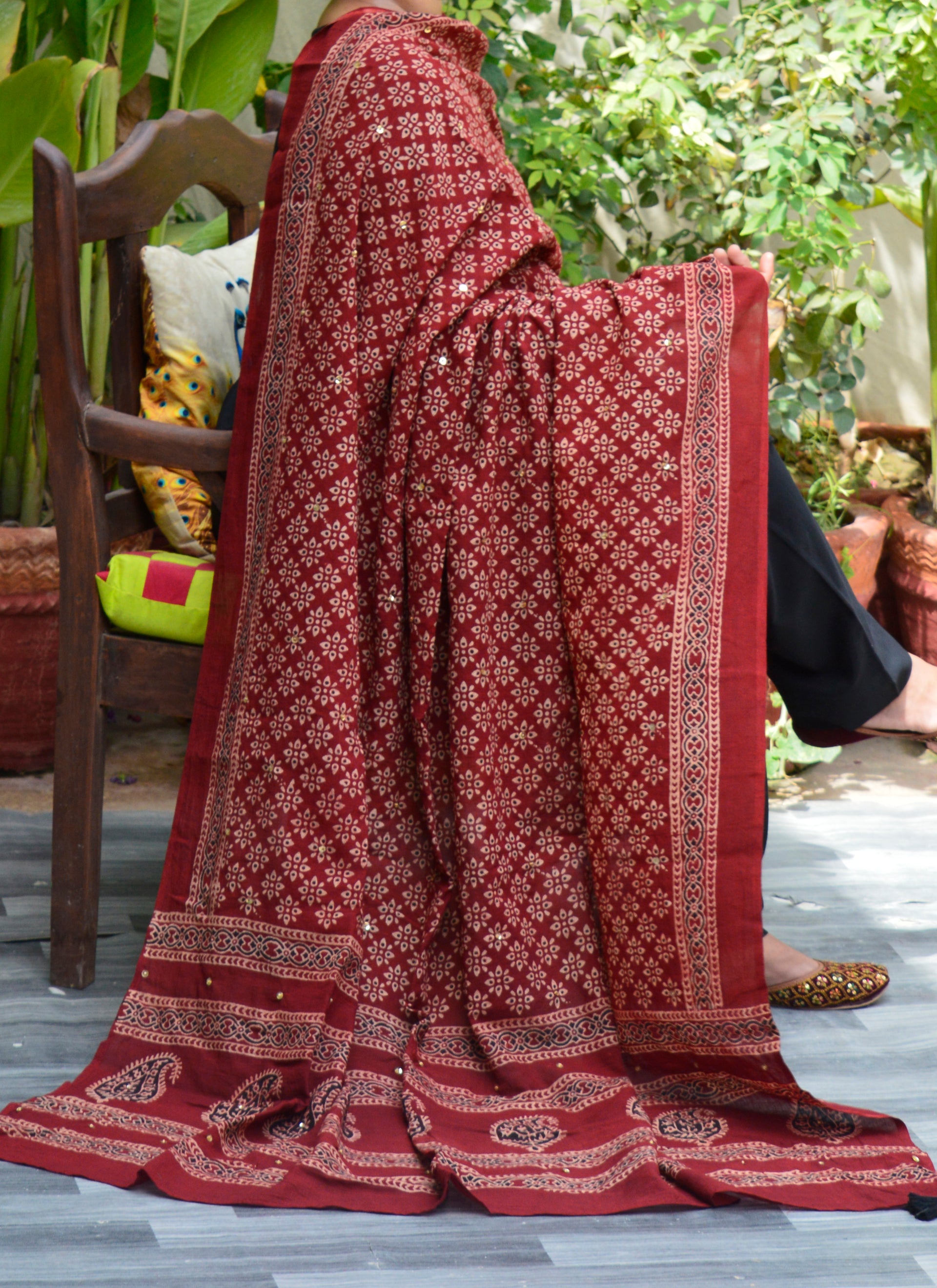 Discover the perfect fusion of heritage and modern fashion with our Organic Dye Hand Block Printed Ajrak Chaadar Floral, now elevated with shimmering sitara sequences and delicate thread tassels. Handcrafted by skilled Sindhi artisans, this odhni reflects the centuries-old art of Ajrak printing, using eco-friendly organic dyes and intricate floral patterns.
