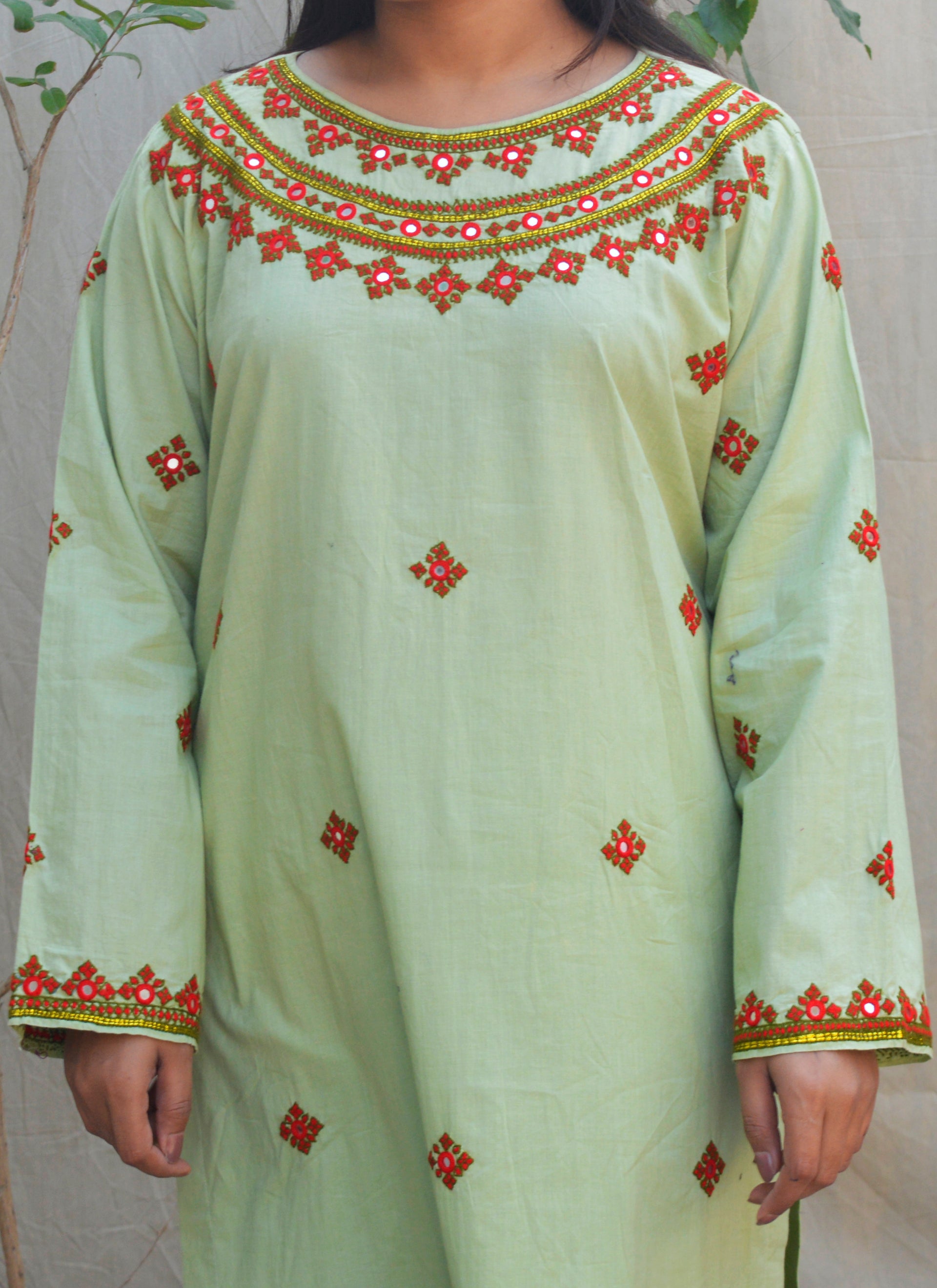 Elevate your ethnic wardrobe with this elegant Pistachio Sindhi Embroidered Dress, a beautifully crafted two-piece outfit that fuses traditional charm with modern grace. Made from premium lawn cotton, this set features authentic hand embroidery inspired by centuries-old Sindhi patterns, reflecting the vibrant cultural heritage of Sindh, Pakistan.