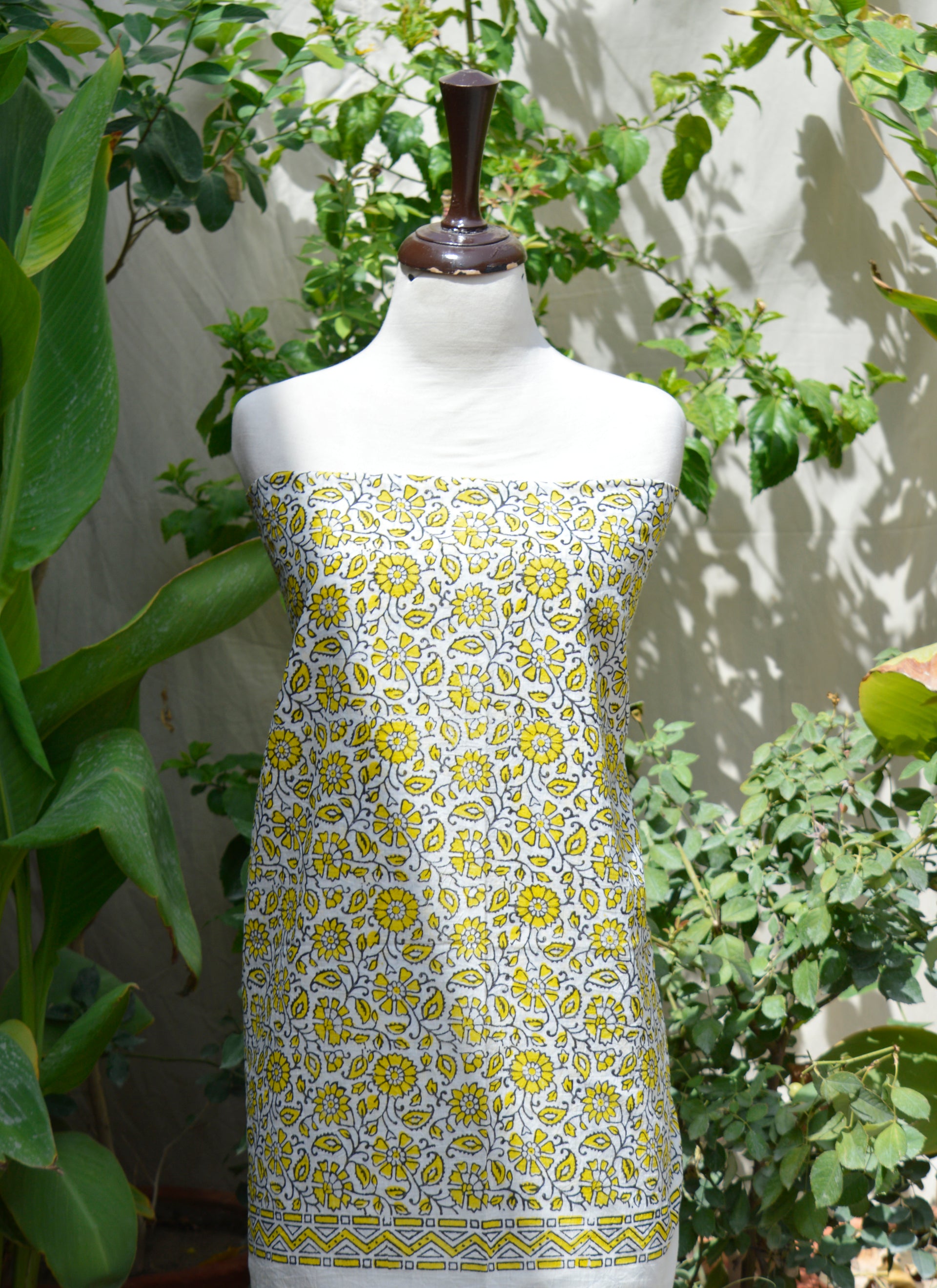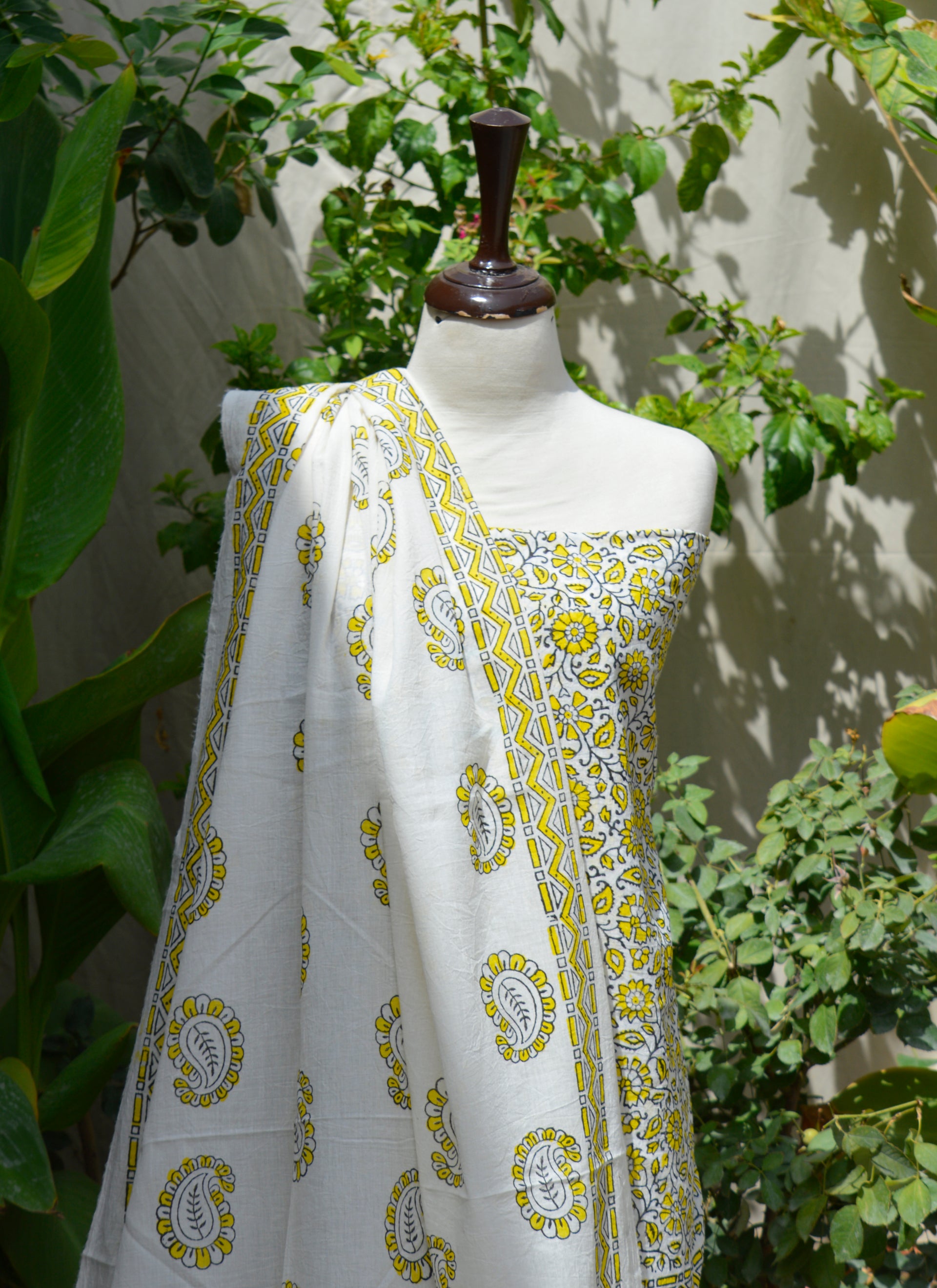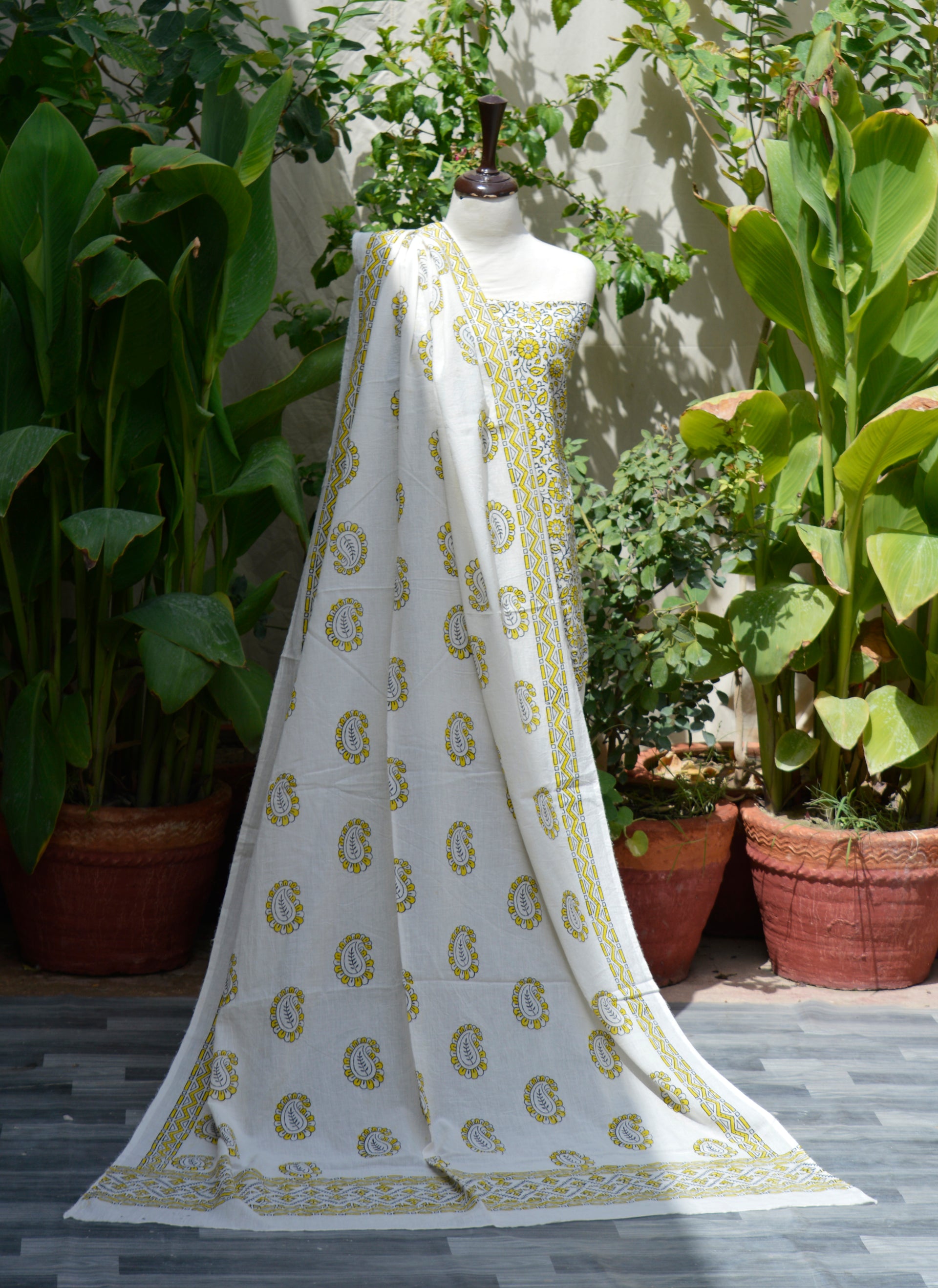 Elevate your everyday and festive style with our Hand Block Printed Mustard Floral Bel Two-Piece Lawn Dress. Featuring a stunning mustard floral bel shirt paired with a matching mustard Anbi motif dupatta, this ensemble is a celebration of Sindhi craftsmanship and Indus Valley textile heritage.