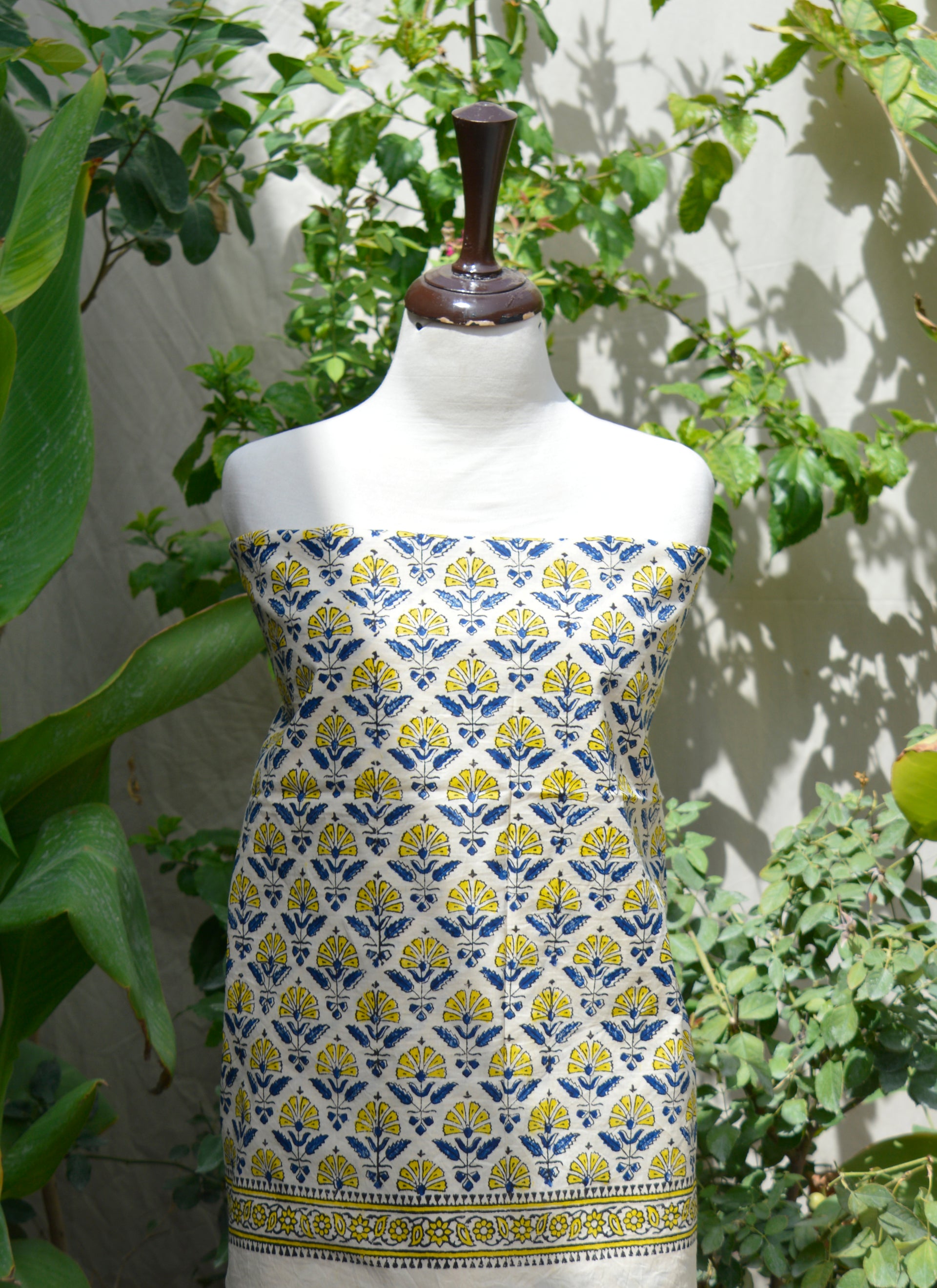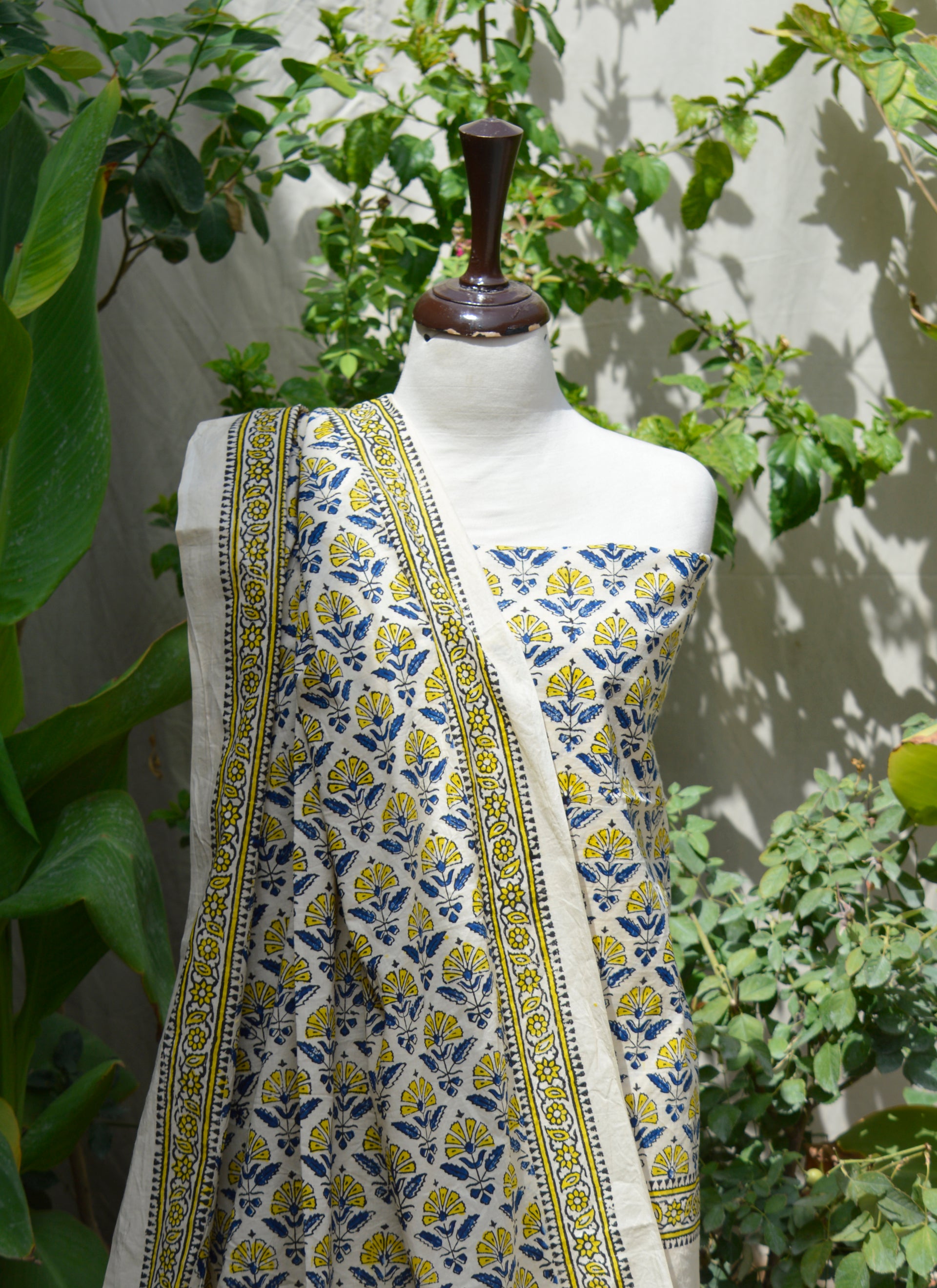 Hand Block Printed Indigo Mustard Floral Two-Piece Unstitched Dress – Pure Cotton
