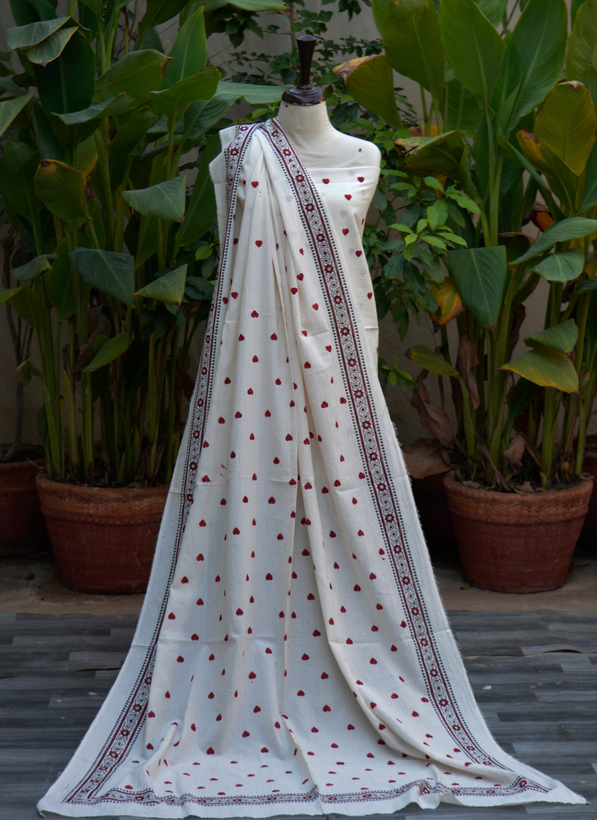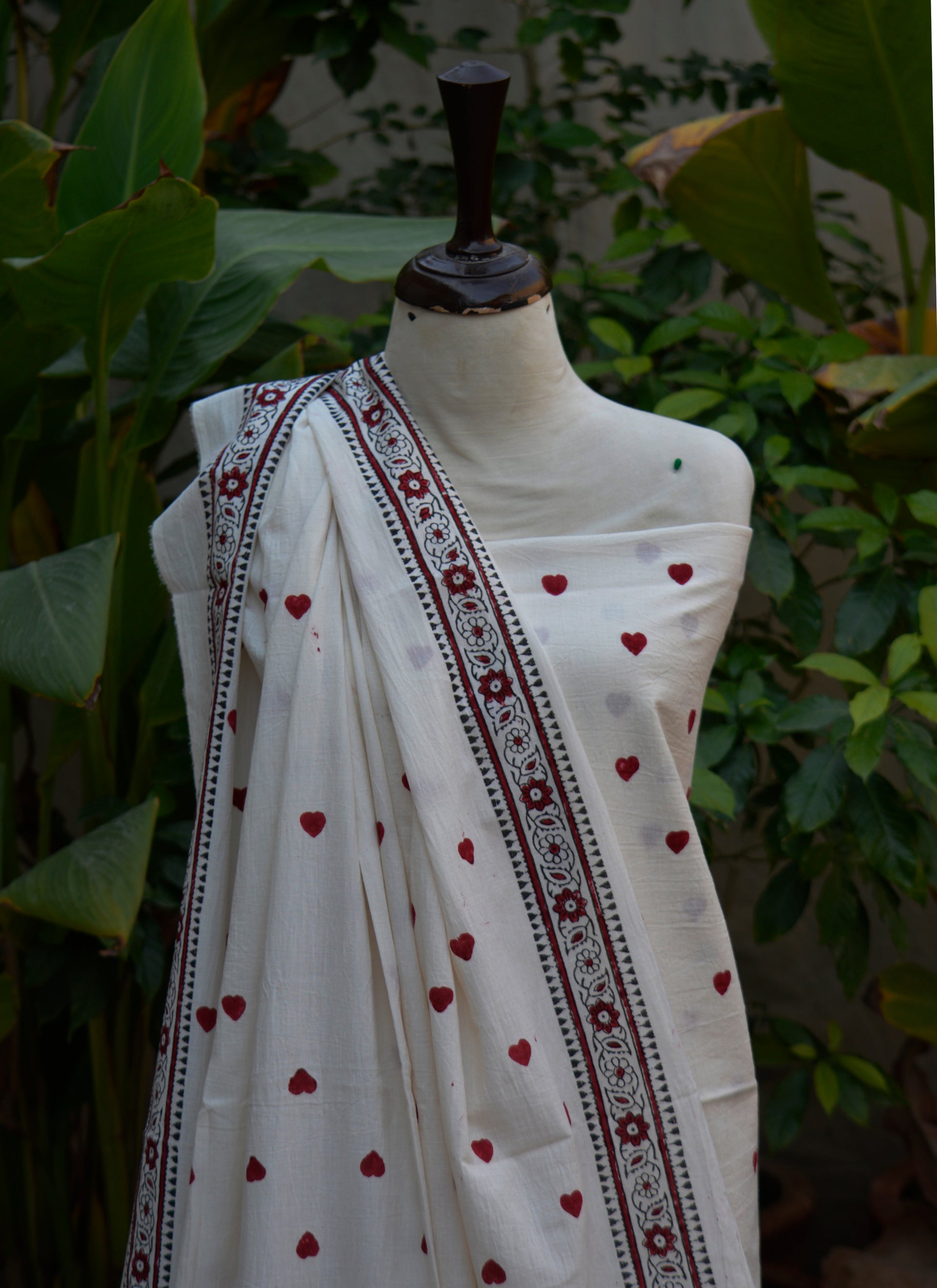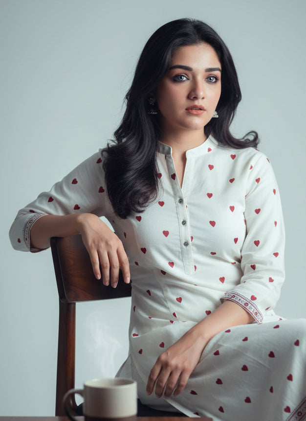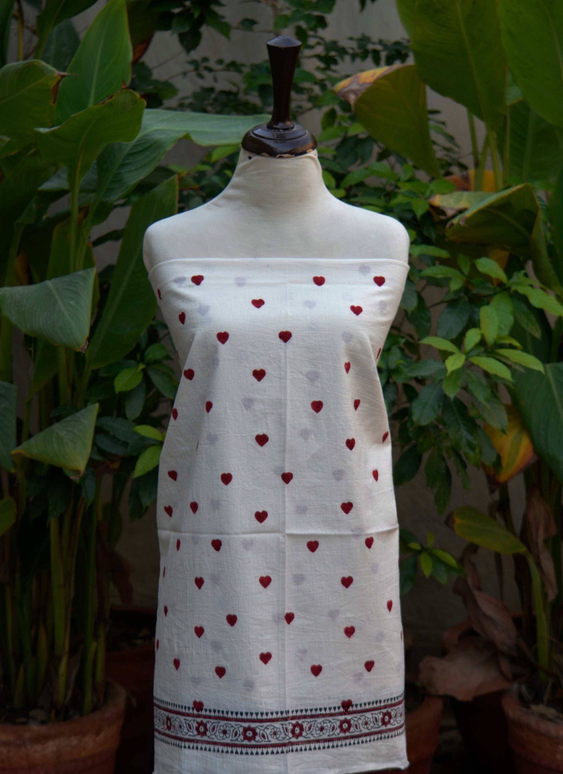 Hand Block Printed Heart Design Two-Piece Dress – Red on White Cotton (Shirt & Dupatta)
