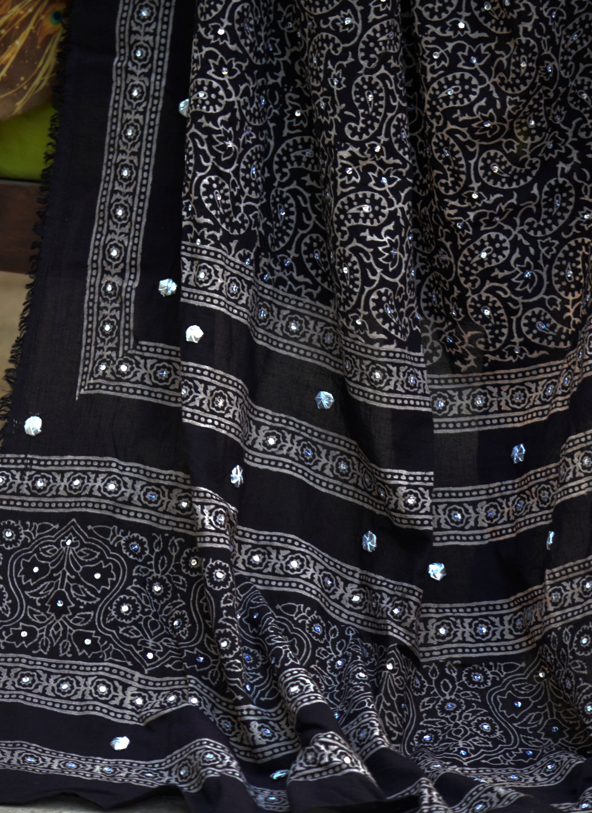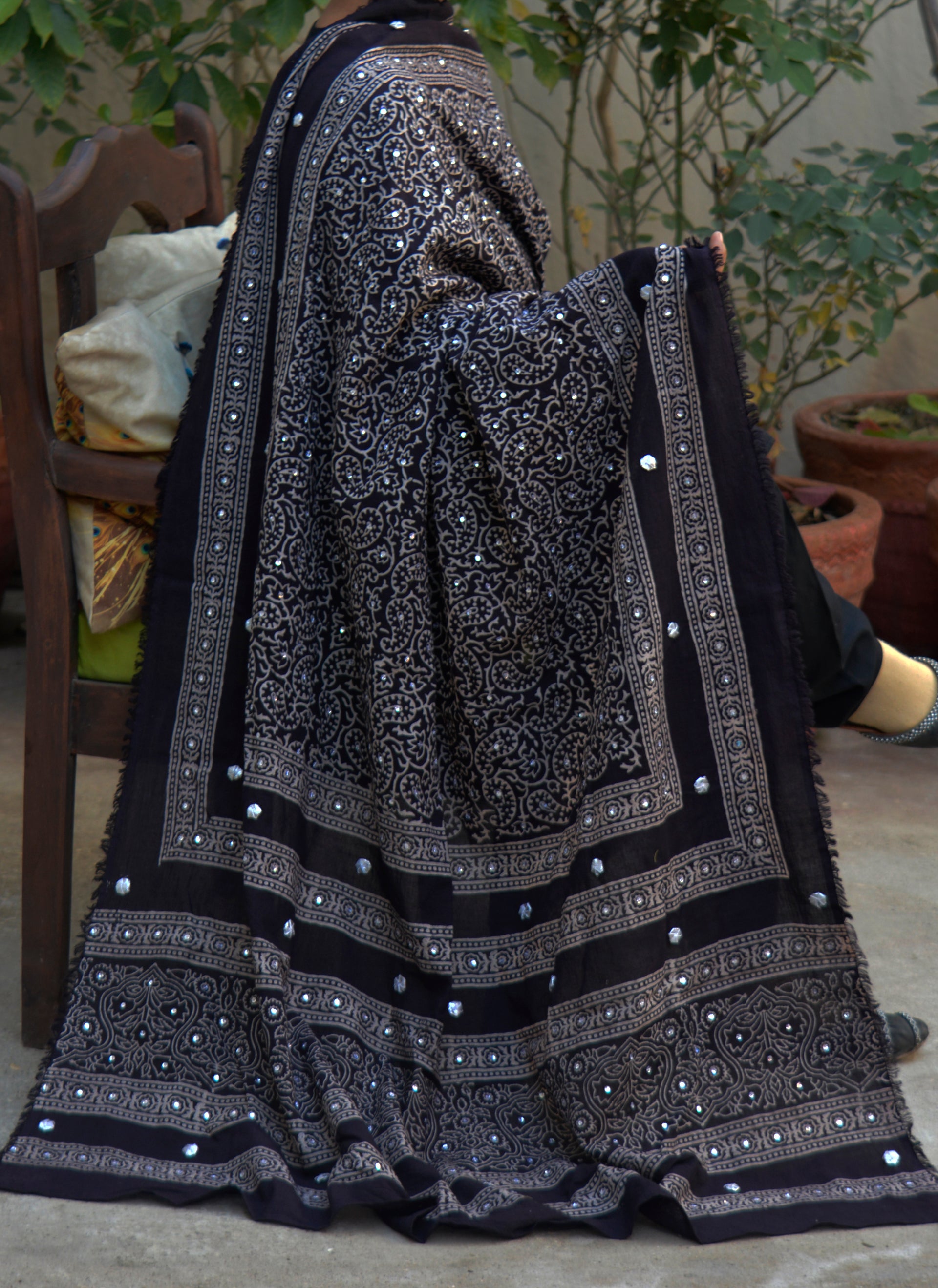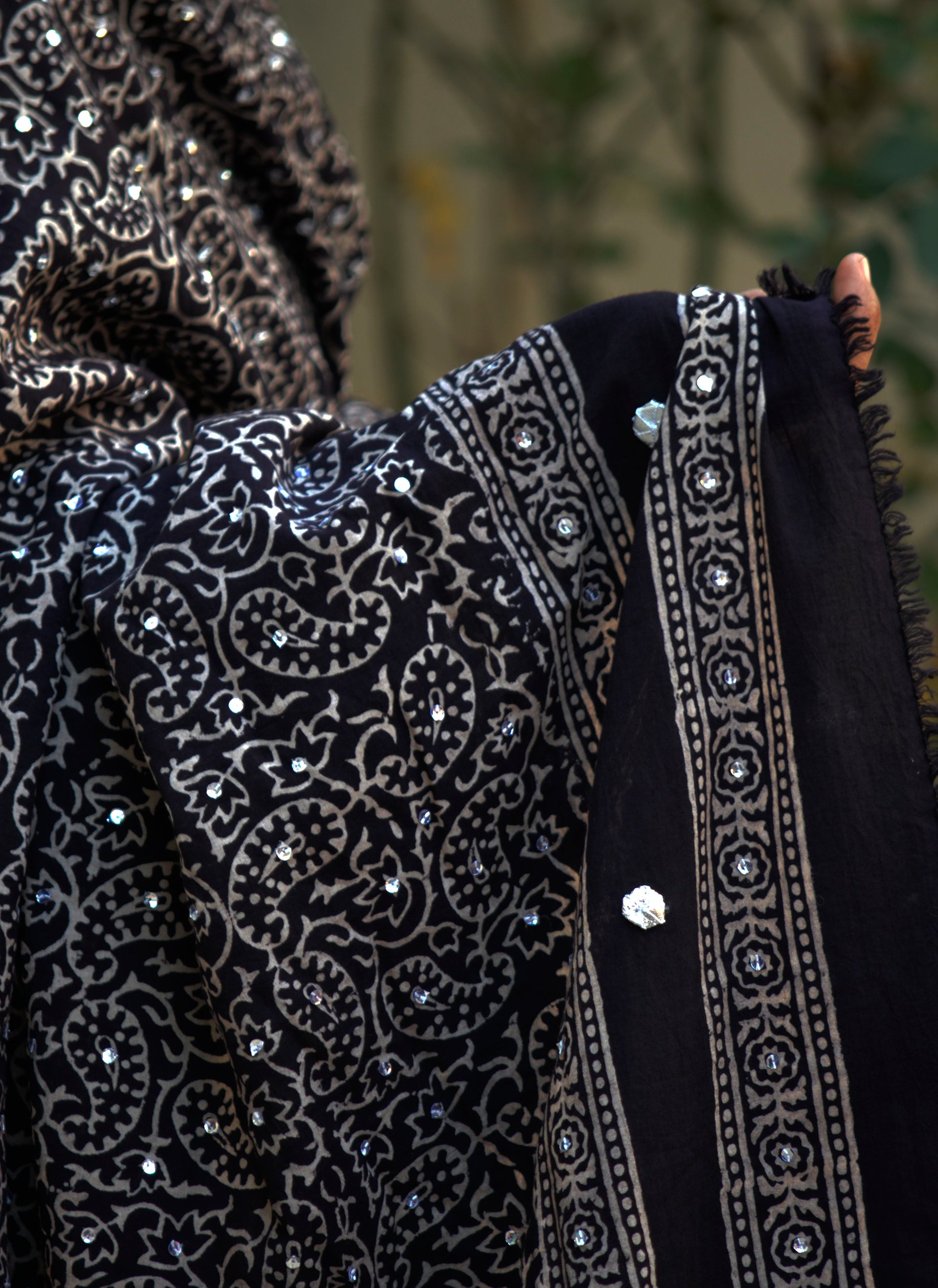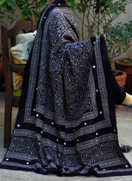 A refined Ajrak Design Dress shawl featuring black Ajrak hand block printing adorned with hand-stitched sitara sequences, gotta flowers, and thread tassels, crafted for elevated cultural elegance.
