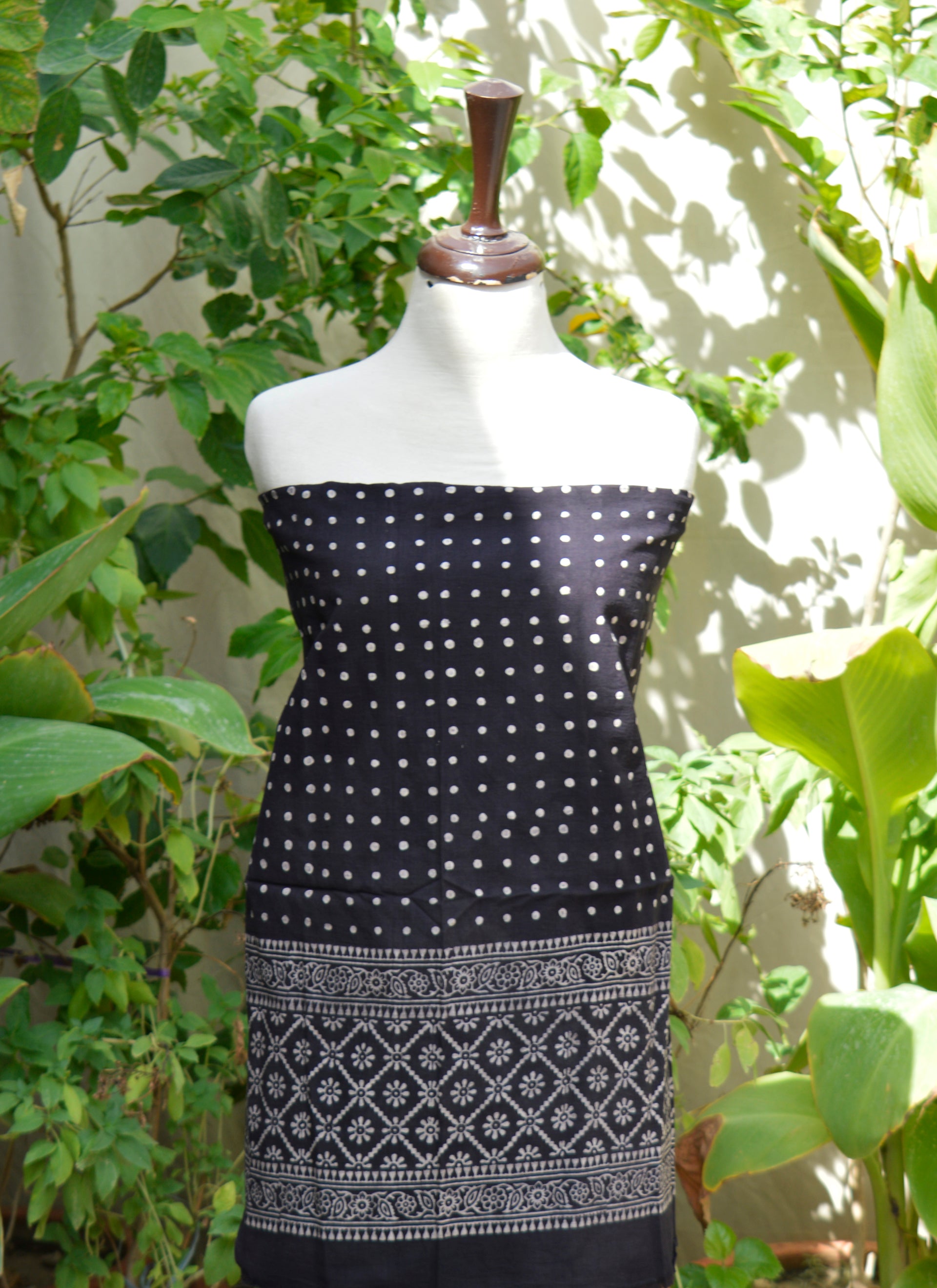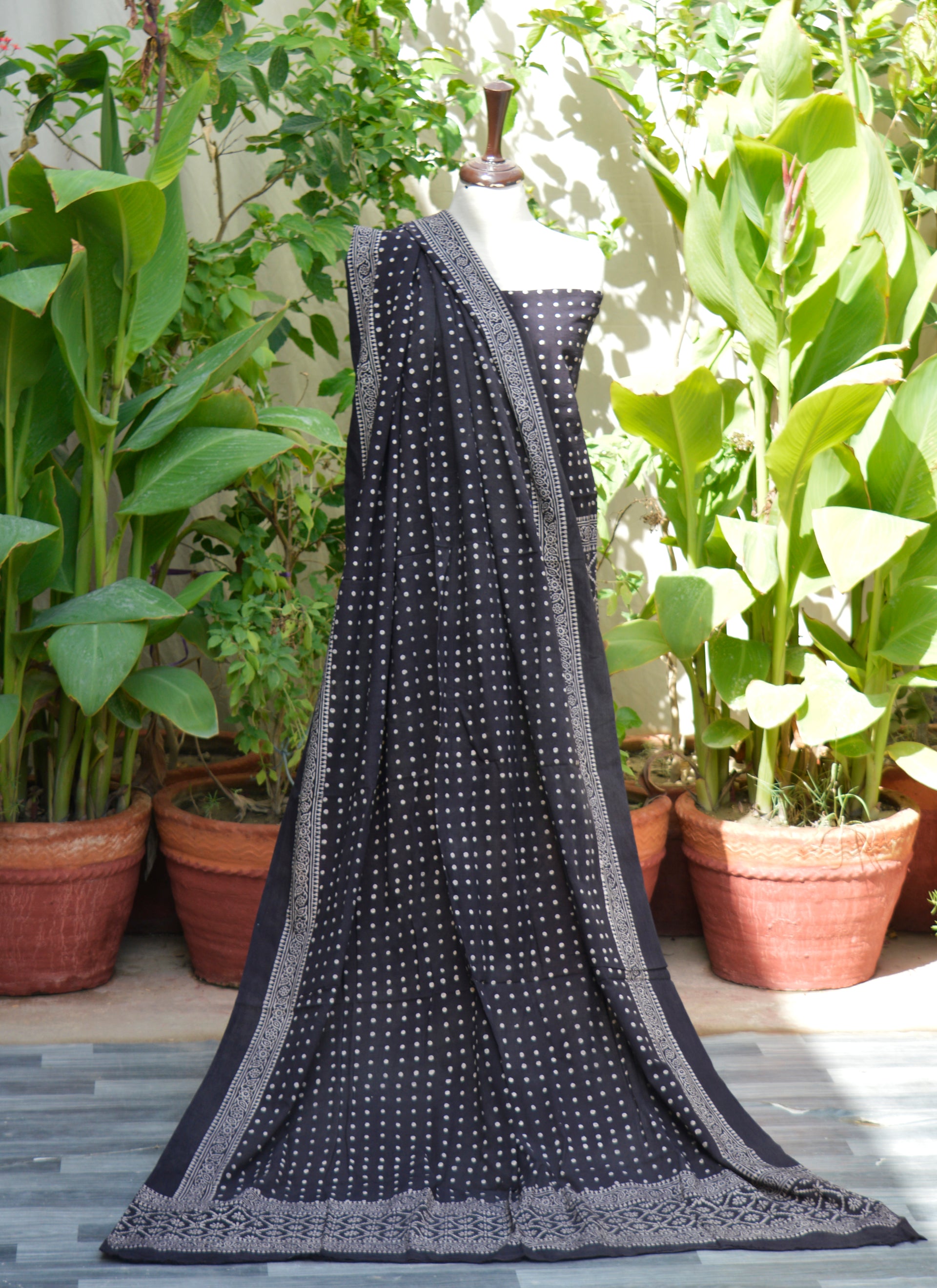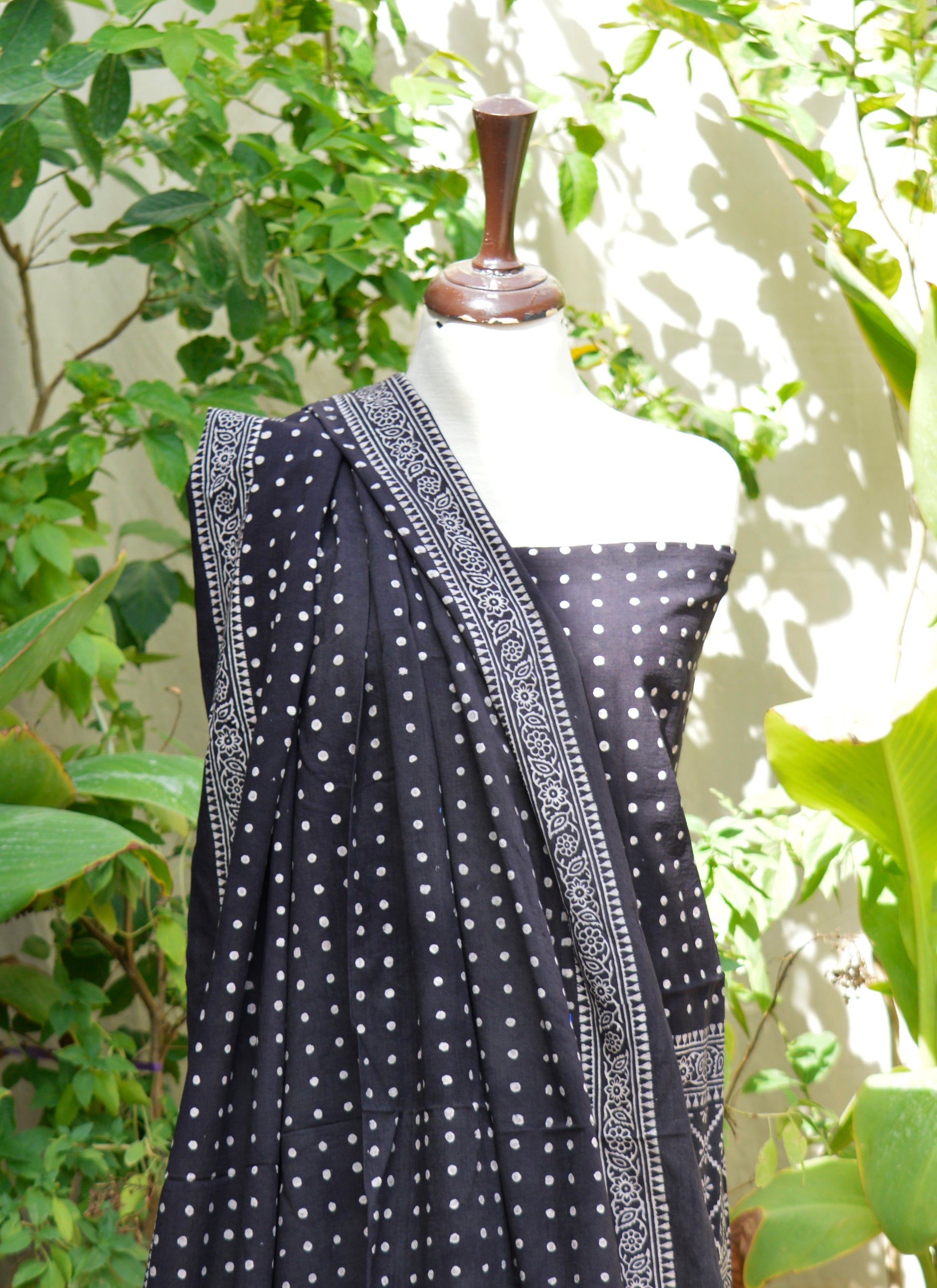 Discover the elegance of tradition reimagined with our Ajrak Hand Block Printed Black Polka Dot Unstitched Two-Piece Set, featuring a striking shirt and matching dupatta. Meticulously handcrafted by skilled artisans, this ensemble pays homage to the centuries-old Ajrak printing tradition, known for its bold motifs and eco-conscious techniques.