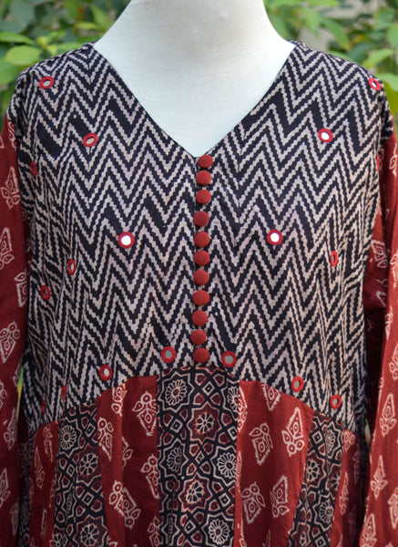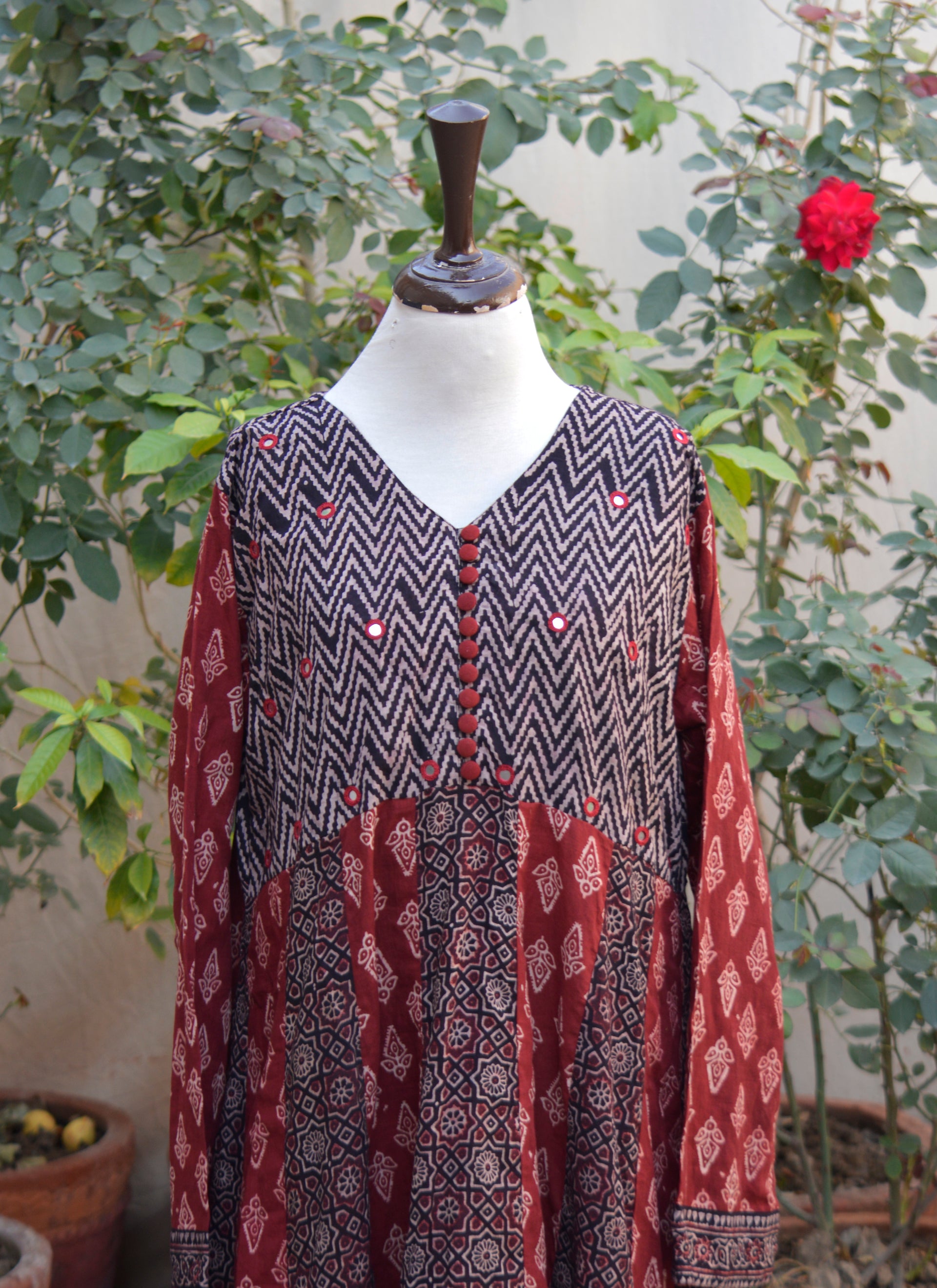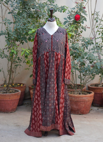 Limited stock available — please contact us on WhatsApp / Instagram / Facebook DM for required size; An aesthetically refined Ajrak Block Print Anarkali in premium lawn, inspired by Indus Valley heritage and adorned with intricate mirror embroidery and handcrafted buttons.