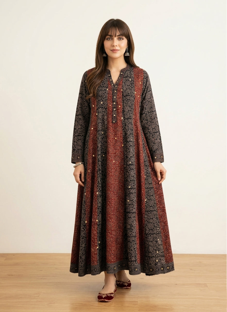 A distinctive Ajrak Design Dress boho maxi in premium lawn, featuring artistic Ajrak patchwork and delicate sitara sequence detailing for an effortlessly elite ethnic look.